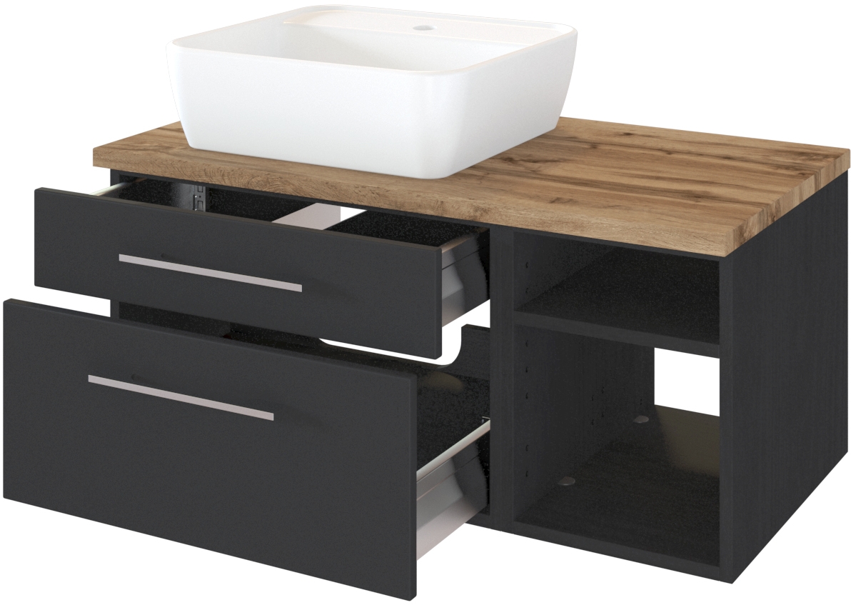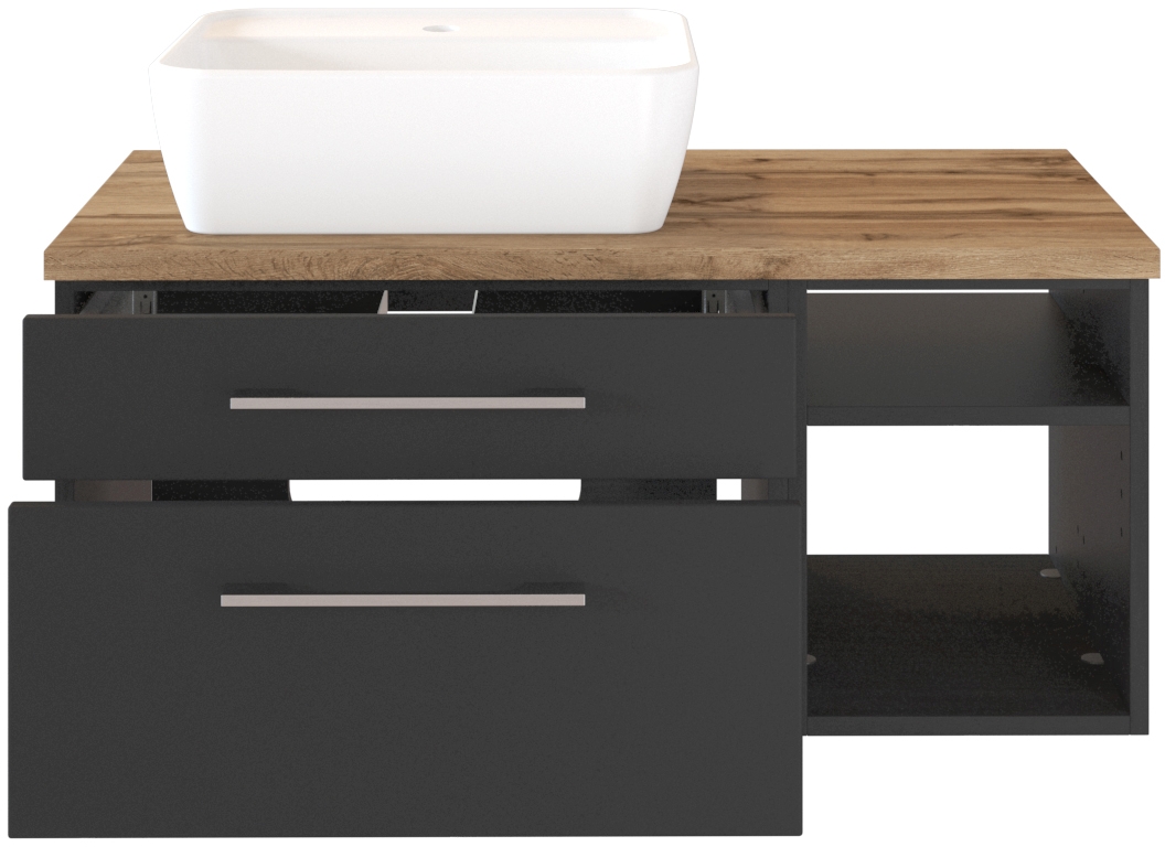 1 meuble sous vasque avec 1 tiroir bas et 1 tiroir haut avec fermeture amortie et 2 casiers ouverts, incl. découpe siphon