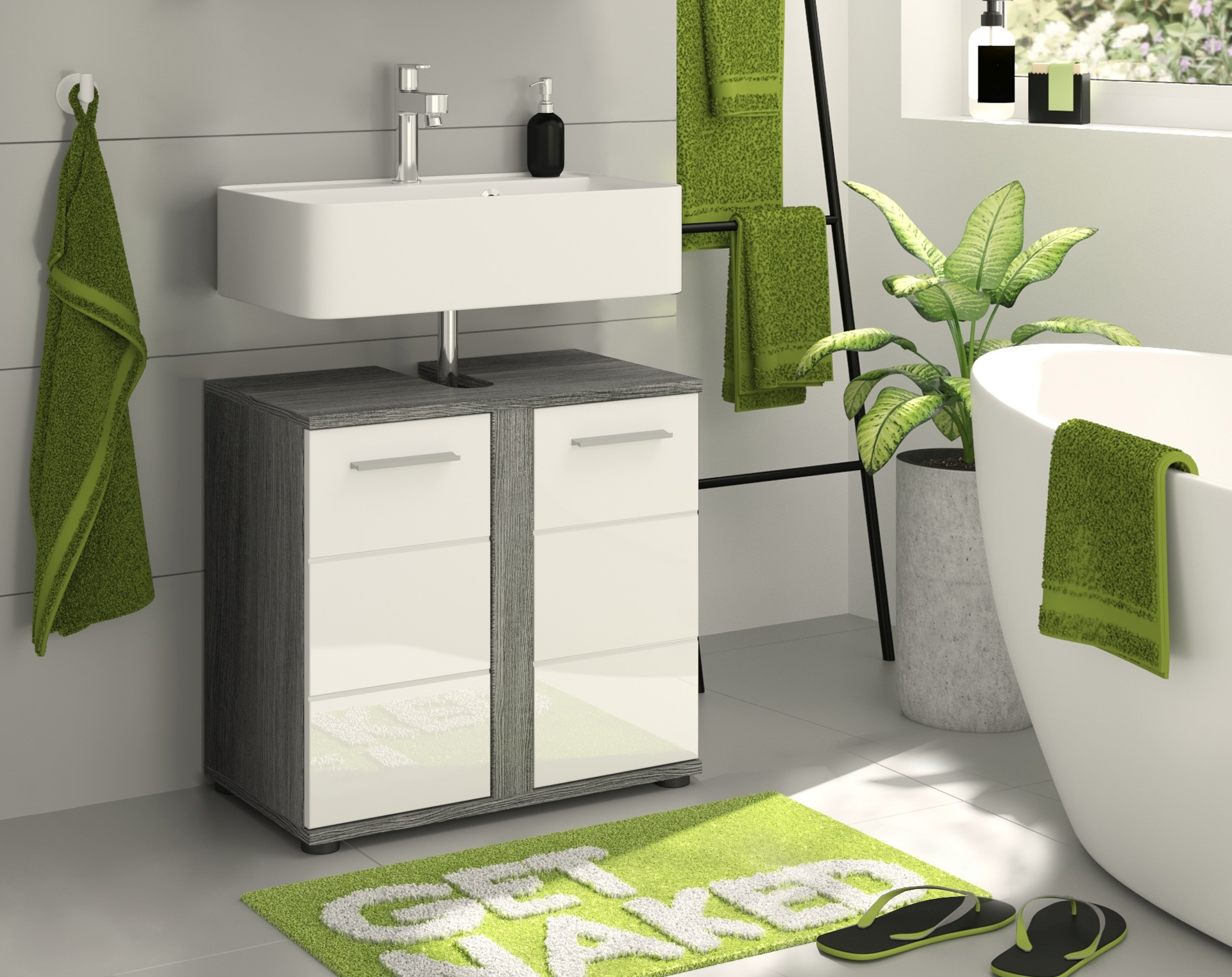 Notre meuble sous vasque (dimensions 60x57x34 cm) associe design stylé et aspect pratique. Proposé en décor bois argent fumé et ton blanc ultra brillant thermoformé, ce meuble dispose d’un espace de rangement pratique pour vos accessoires de bain. Misez sur la qualité et l’élégance pour votre salle de bains grâce à ce joli meuble.