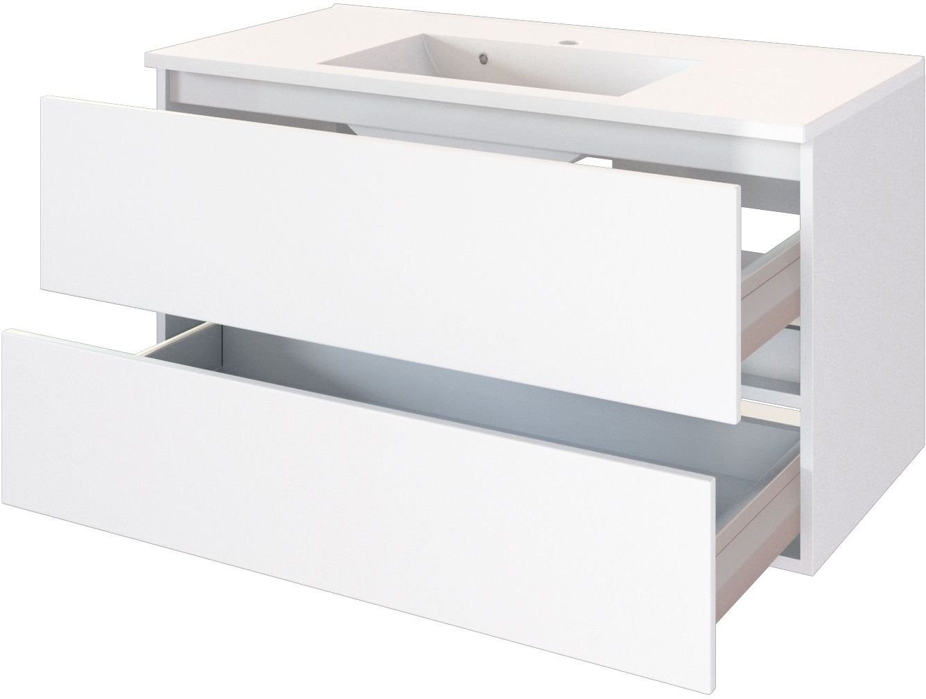 1 meuble sous vasque avec 2 tiroirs hauts sur rails métalliques, fermeture amortie et barre