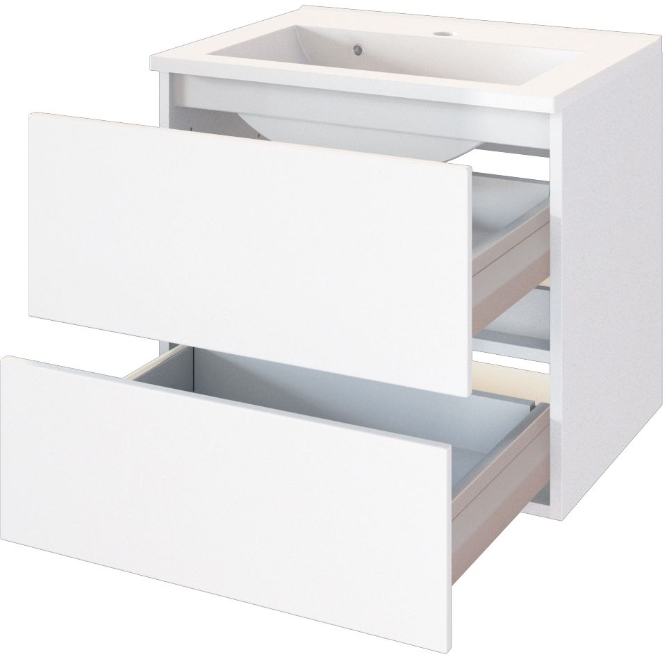 1 meuble sous vasque avec 2 tiroirs hauts sur rails métalliques, fermeture amortie et barre