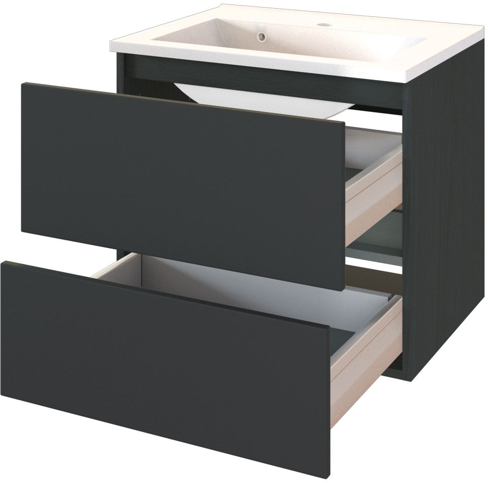 1 meuble sous vasque avec 2 tiroirs hauts sur rails métalliques, fermeture amortie et barre
