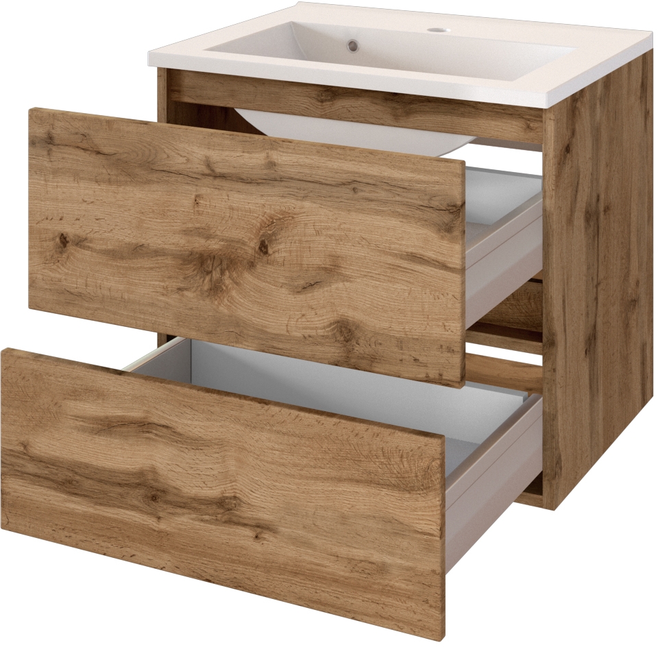1 meuble sous vasque avec 2 tiroirs hauts sur rails métalliques, fermeture amortie et barre