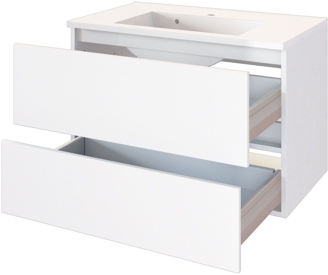 1 meuble sous vasque avec 2 tiroirs hauts sur rails métalliques, fermeture amortie et barre
