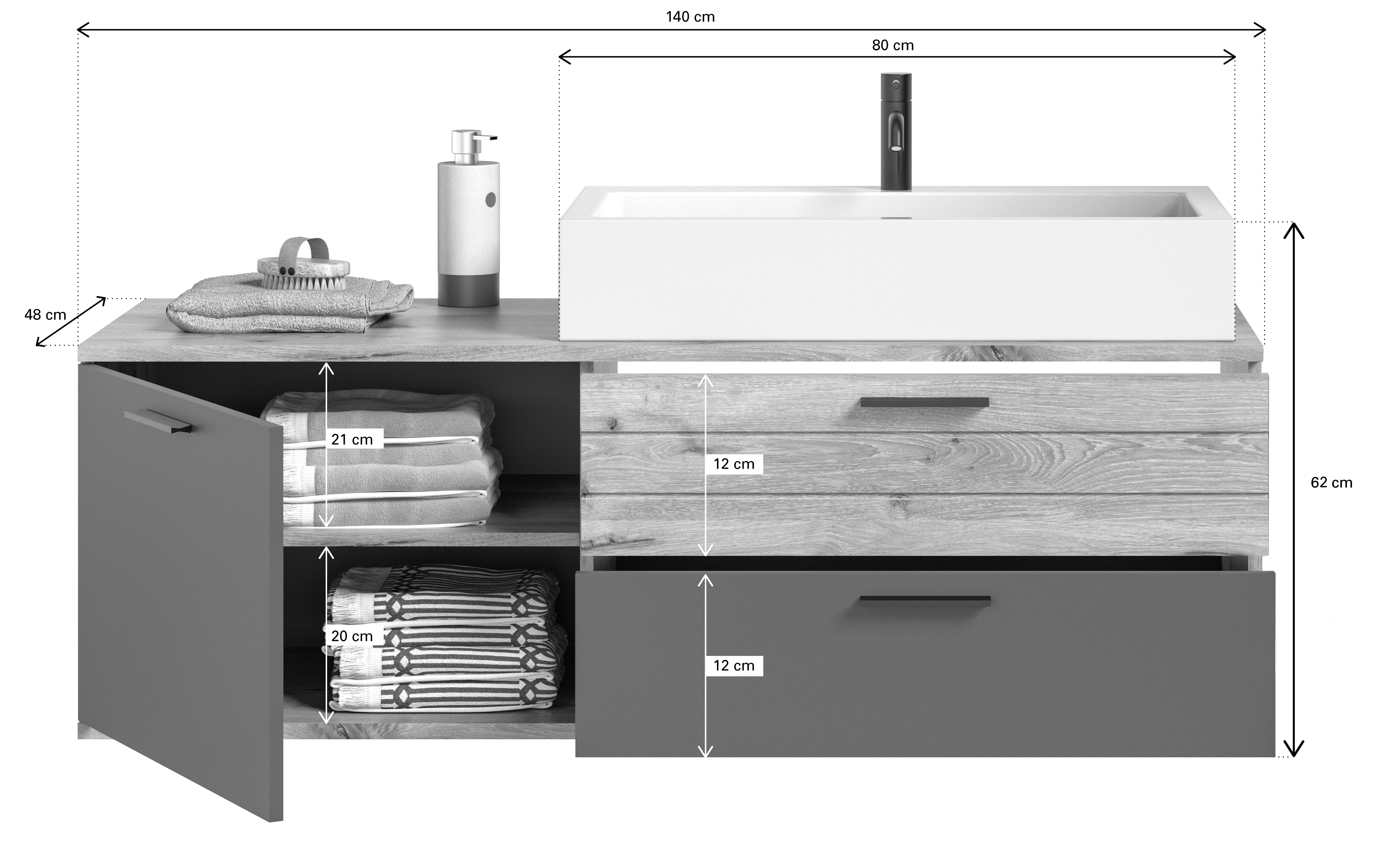 - Fonctionnalité : ce meuble offre beaucoup de place sous le lavabo et suffisamment d’espace de rangement pour les accessoires de bains grâce au meuble bas spacieux et à la surface pour poser des objets. Les dimensions généreuses permettent une utilisation confortable tout en offrant beaucoup de place pour la toilette quotidienne.