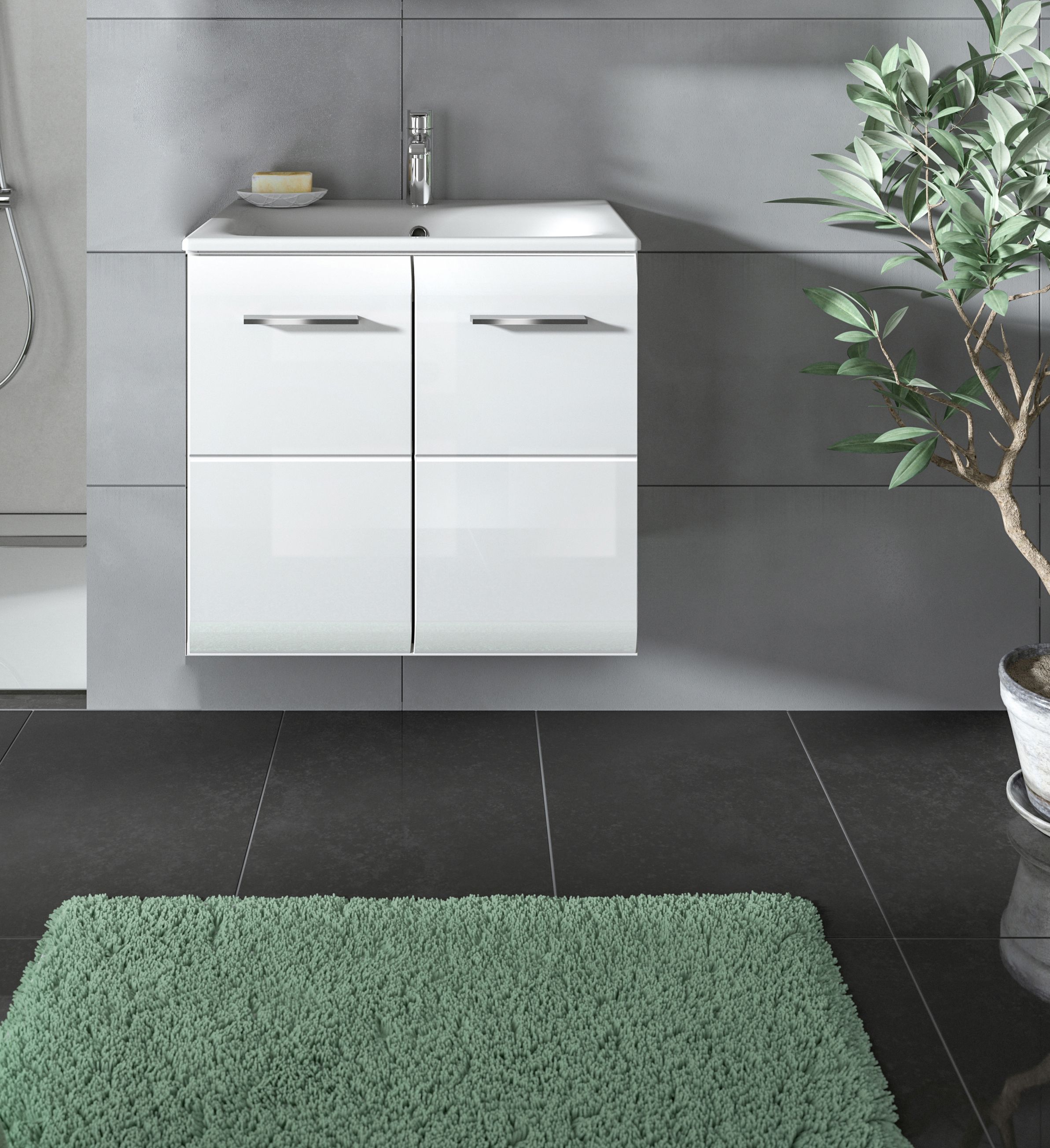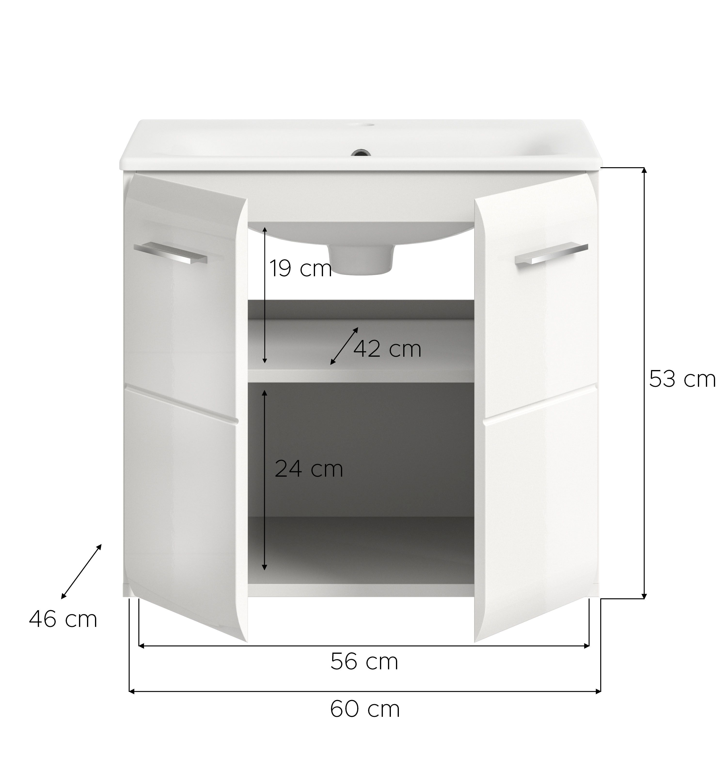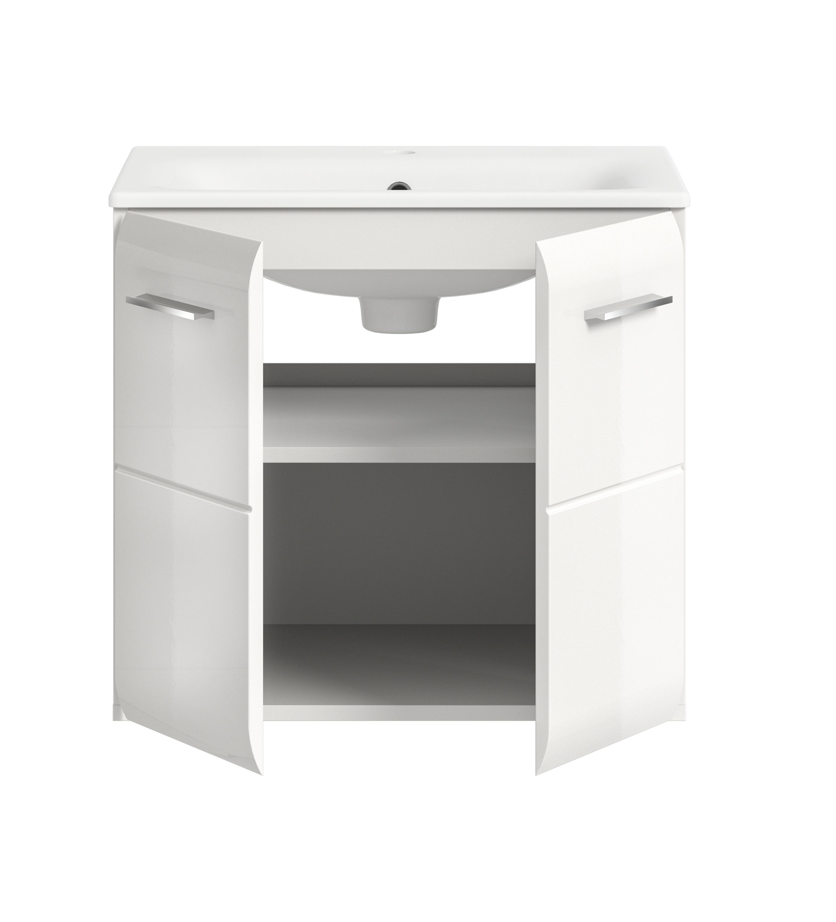 - Incl. vasque intégrée, 2 portes, 1 tablette amovible et réglable en hauteur, 2 casiers, fond avec découpe, façade en MDF de qualité à rainures