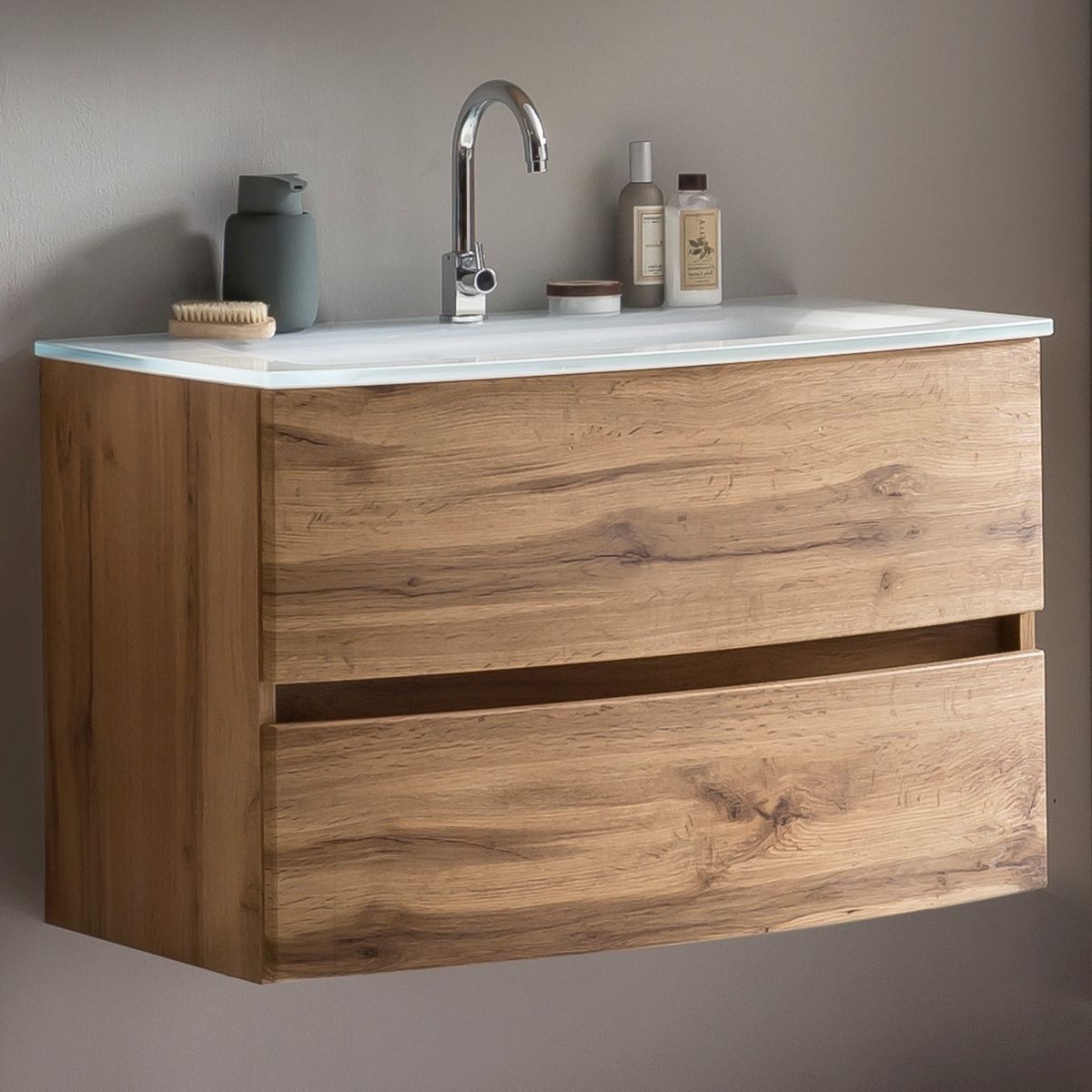 1 meuble sous vasque avec 2 tiroirs en métal à sortie totale avec fermeture amortie, façades arrondies