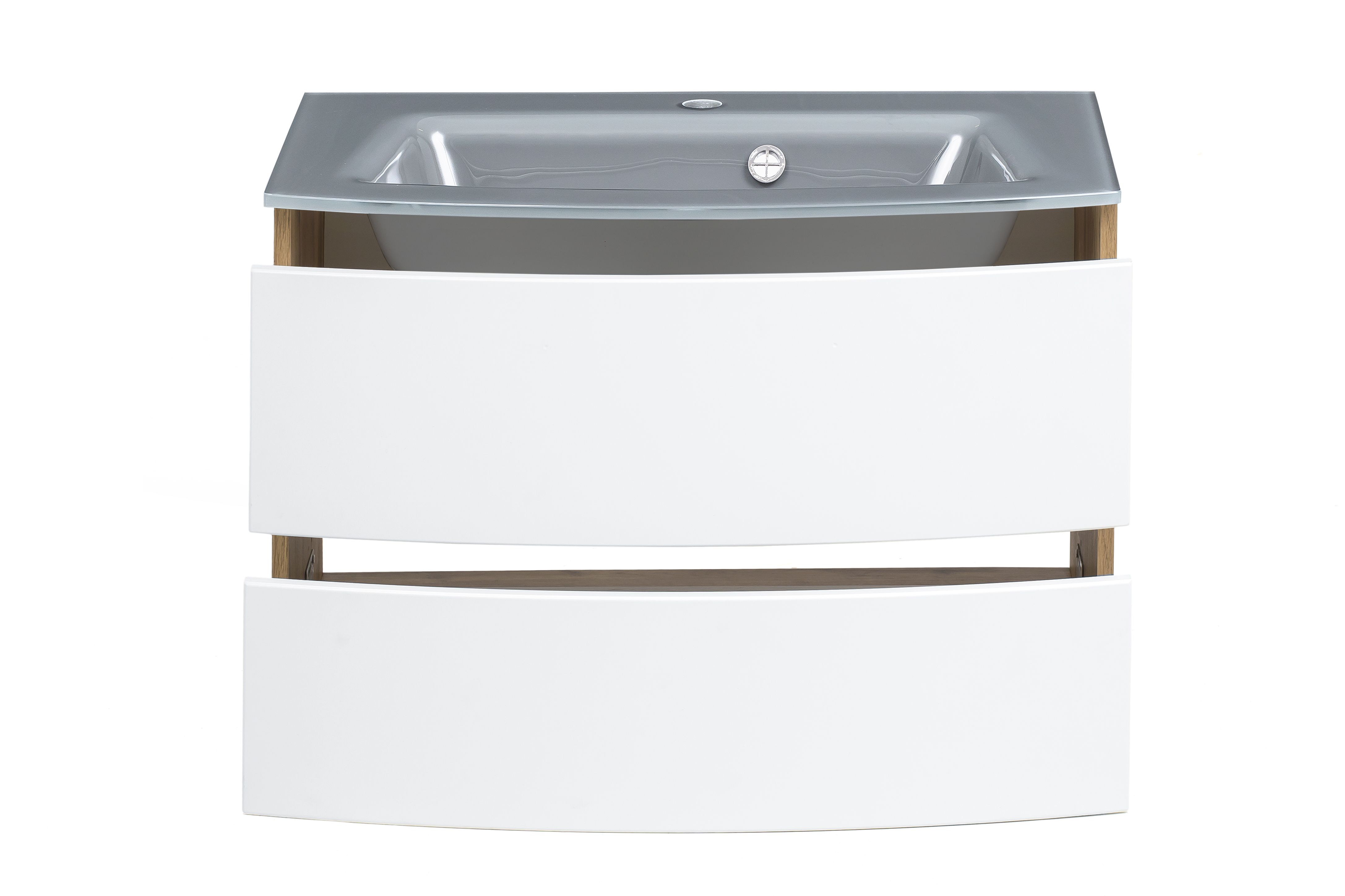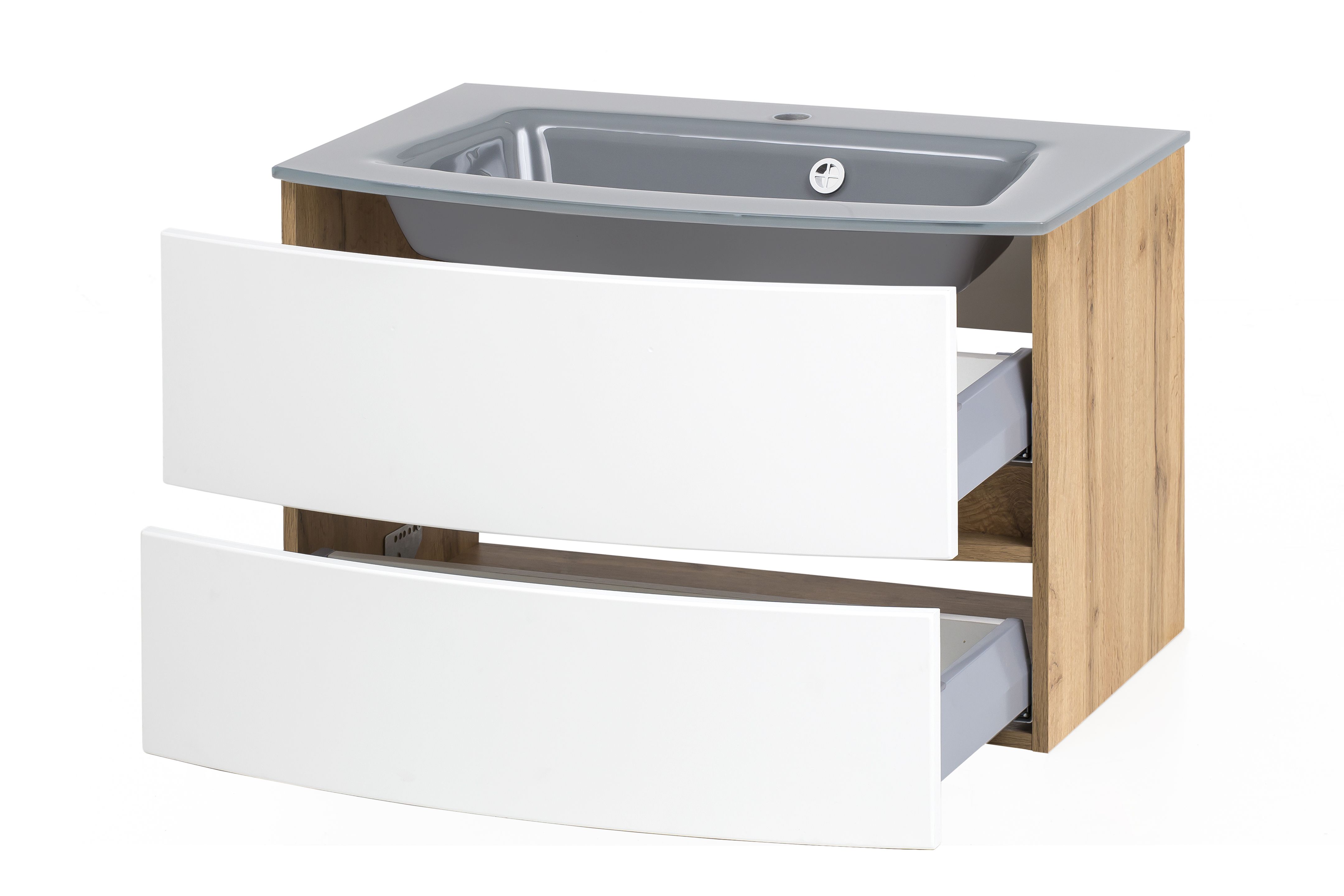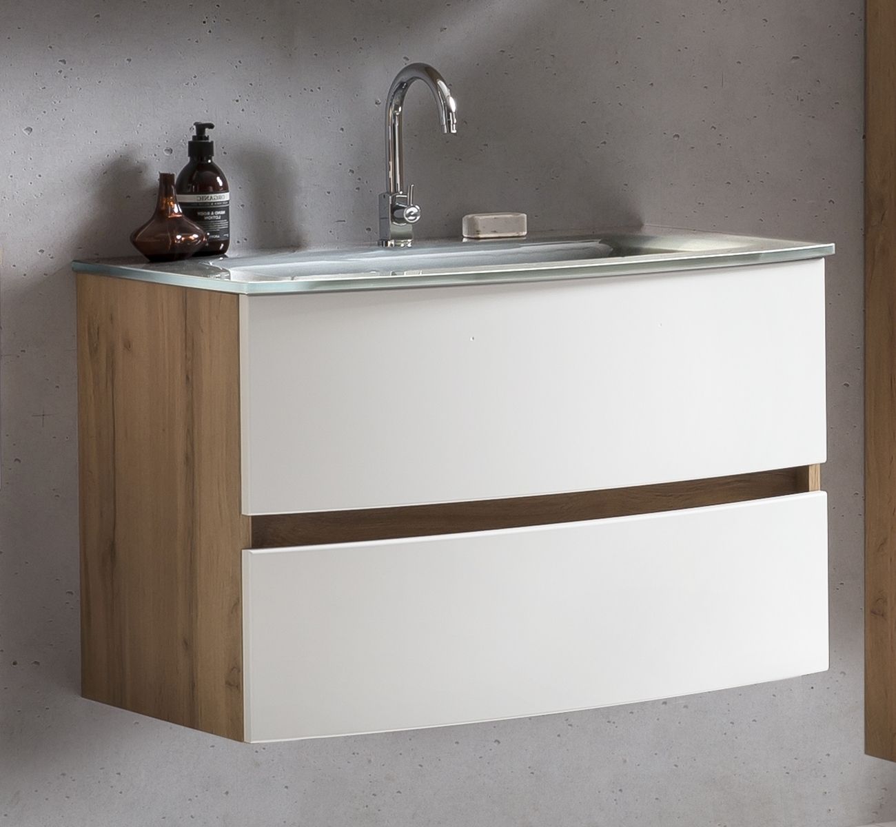 1 meuble sous vasque avec 2 tiroirs en métal à sortie totale avec fermeture amortie, façades arrondies