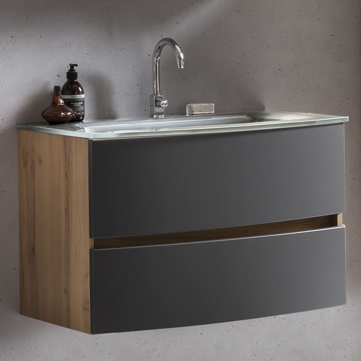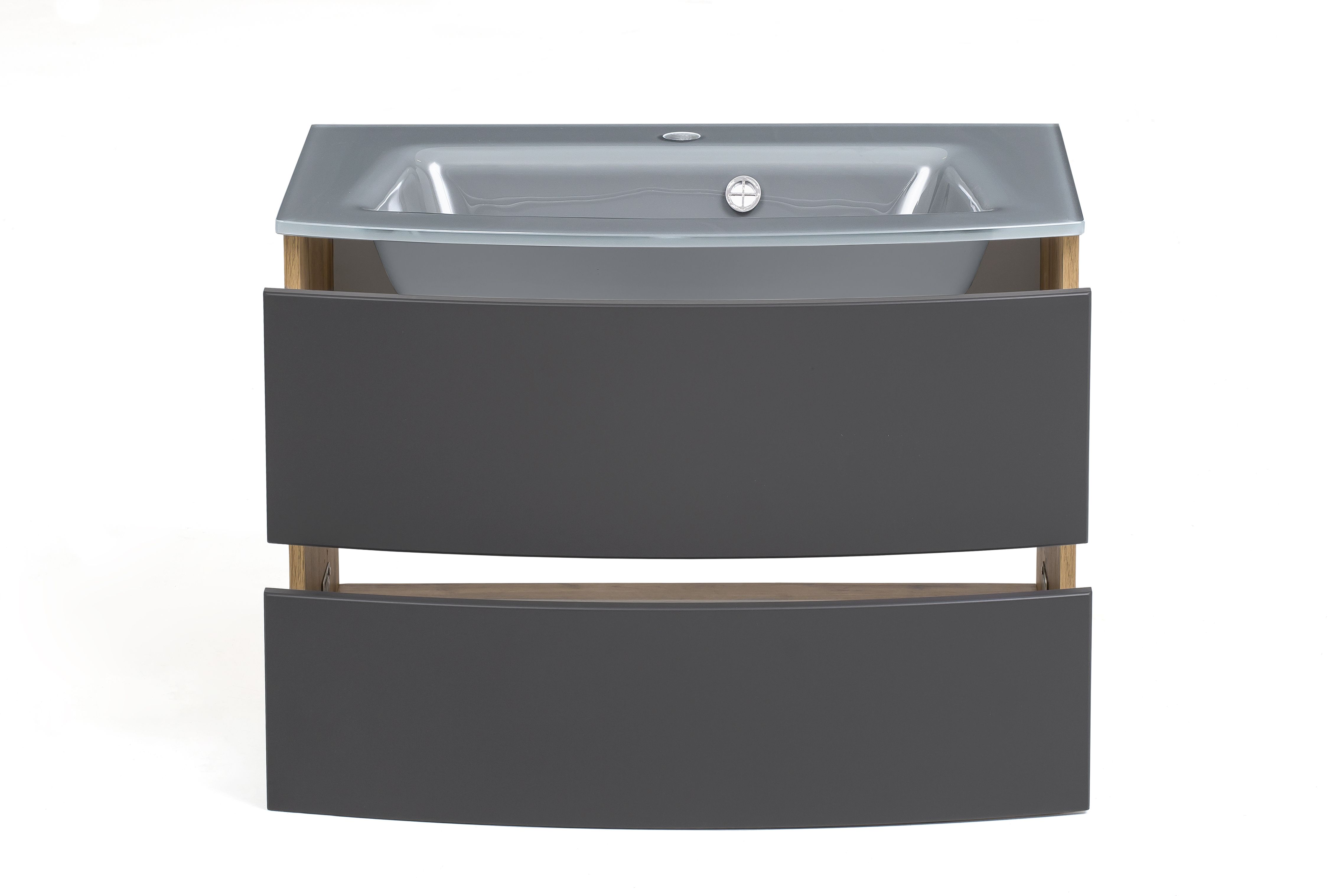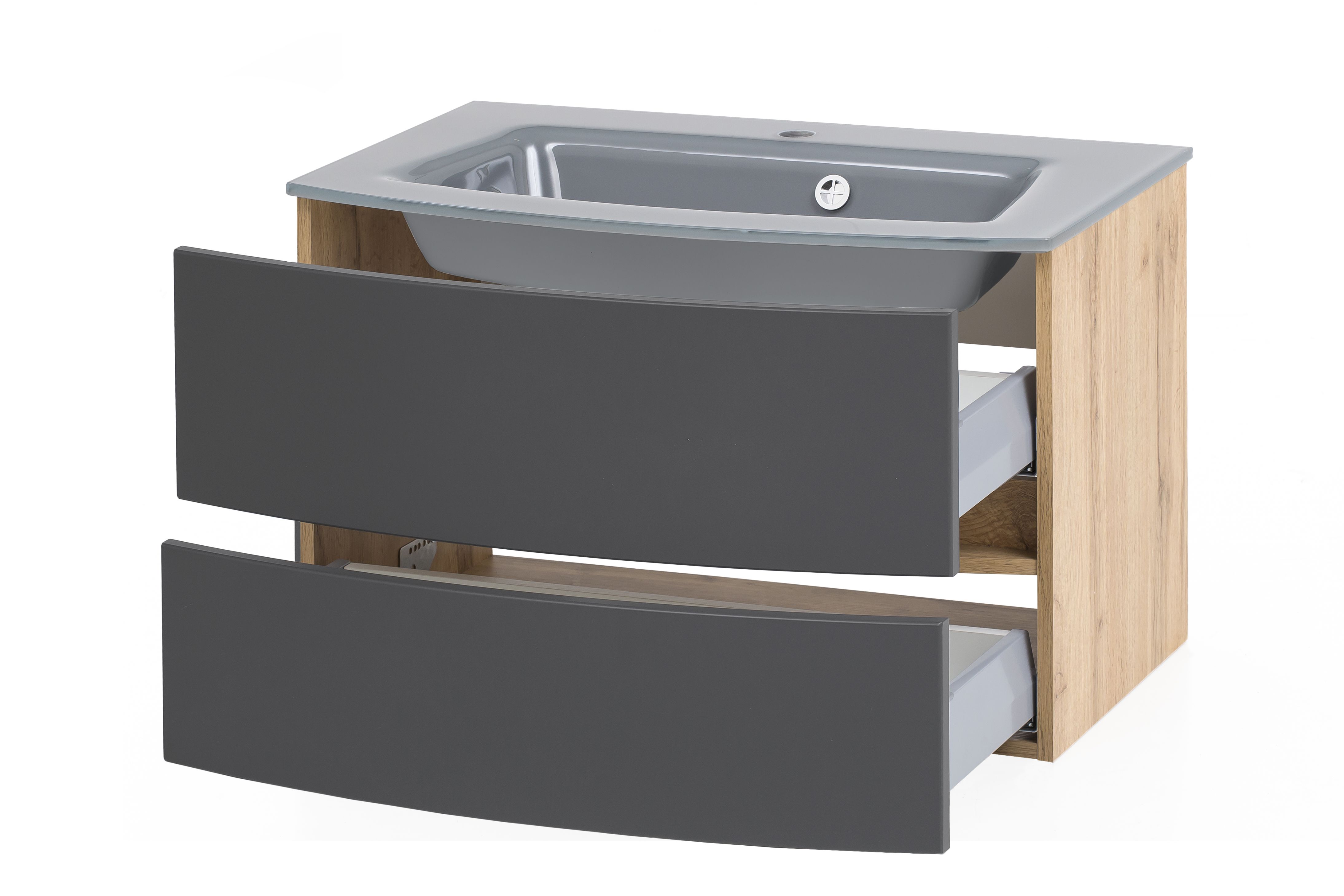1 meuble sous vasque avec 2 tiroirs en métal à sortie totale avec fermeture amortie, façades arrondies