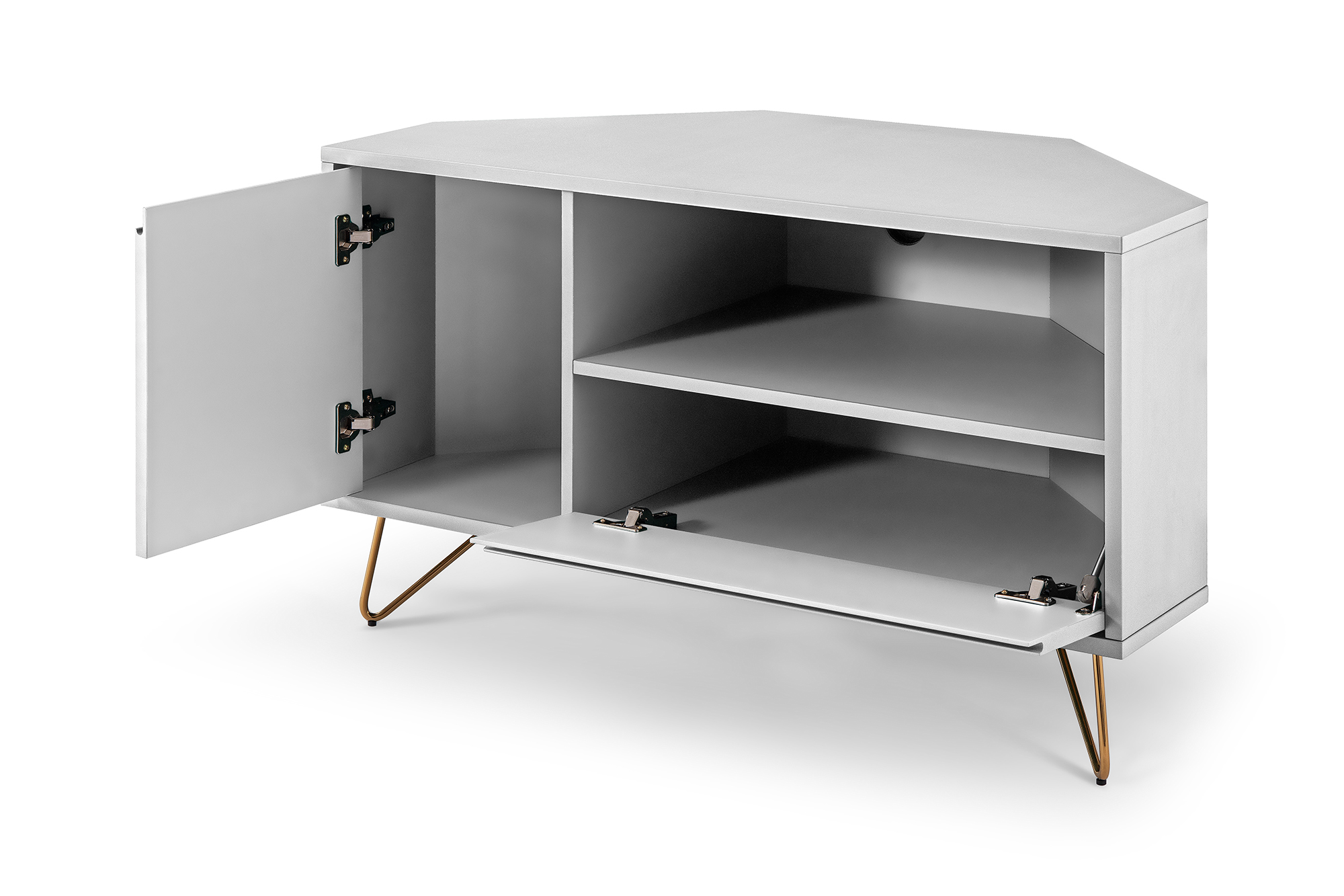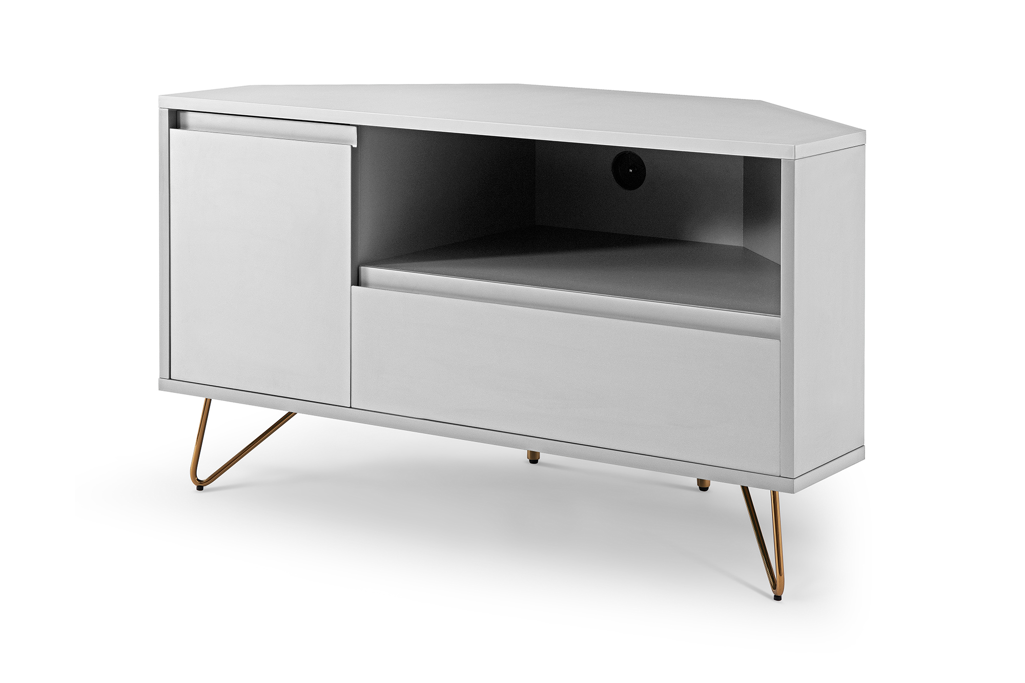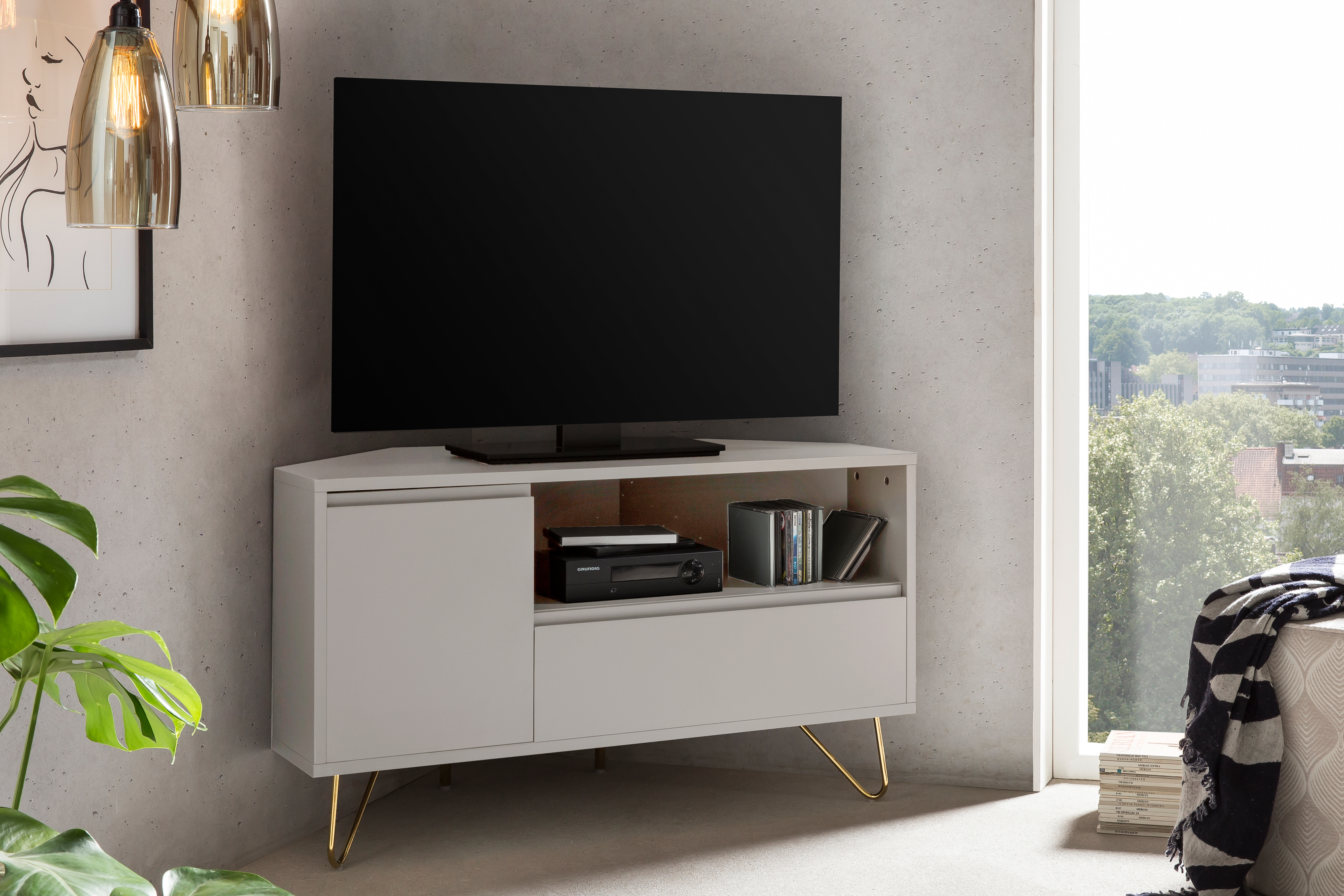 Ce meuble TV d'angle au design scandinave attirera tous les regards dans votre salon. La combinaison entre teintes sobres et pieds en métal doré fait de ce banc TV un meuble très particulier. Grâce à la porte, au casier ouvert et au casier derrière l'abattant, vous disposerez d'un bel espace de rangement stylé pour les objets du quotidien. La porte et l'abattant disposent de la fonction "ouverture par simple pression". Dans le casier ouvert avec passe-câbles, vous pourrez ranger votre équipement multimédia. Le design scandinave moderne de ce meuble TV d'angle sera toujours tendance et se combinera à merveille avec l'ameublement déjà existant.