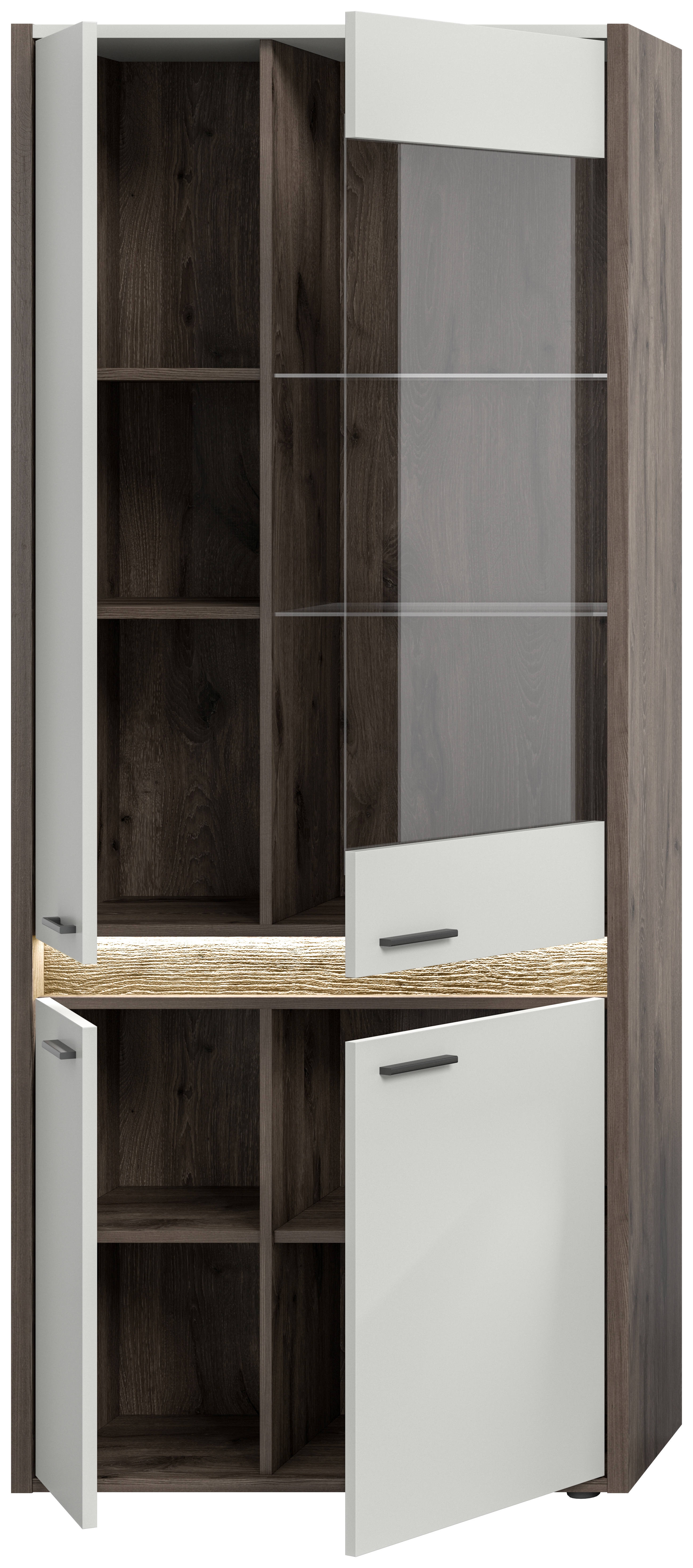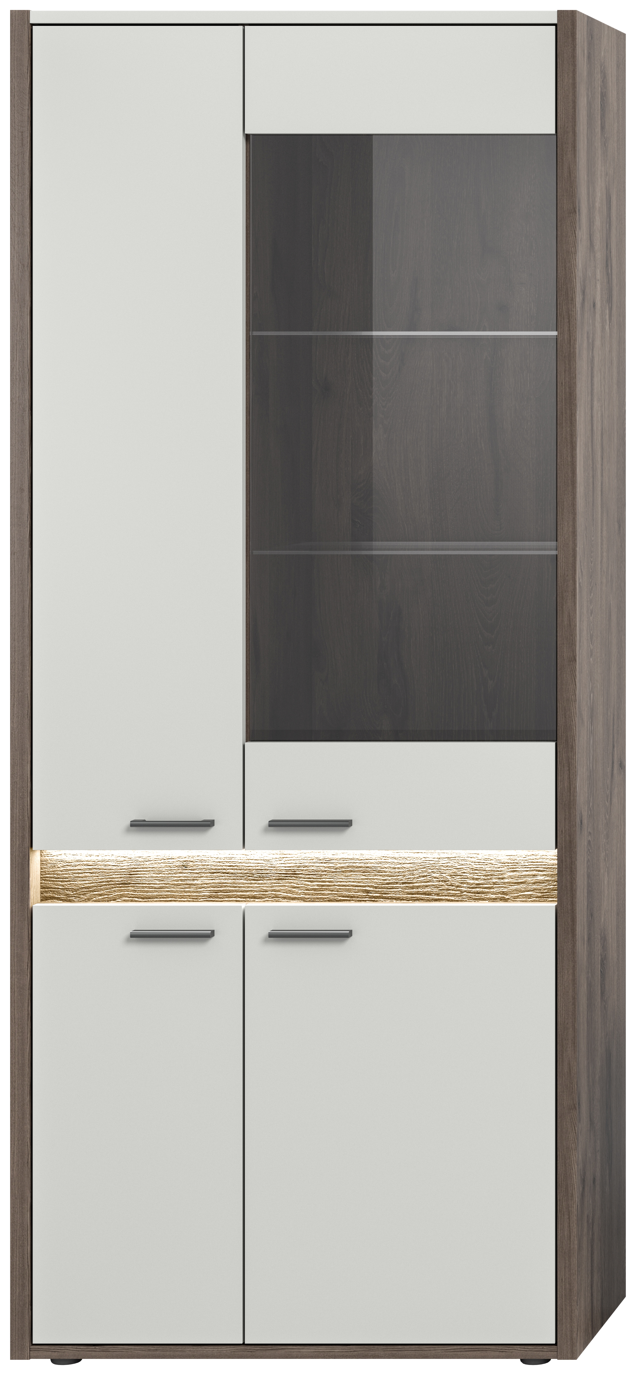 Découvrez cette vitrine raffinée décor chêne Nox foncé et décor gris clair - grâce à ses dimensions généreuses (82x198x37 cm), elle représente l’alliance réussie entre design tendance et élégance pratique pour votre intérieur. L’éclairage de façade dimmable permet de mettre parfaitement en scène les pièces de collection et de les présenter de façon stylée. Avec ce joli meuble, faites entrer une touche de variété dans vos pièces et profitez d’un rangement optimal et d’un design attrayant.