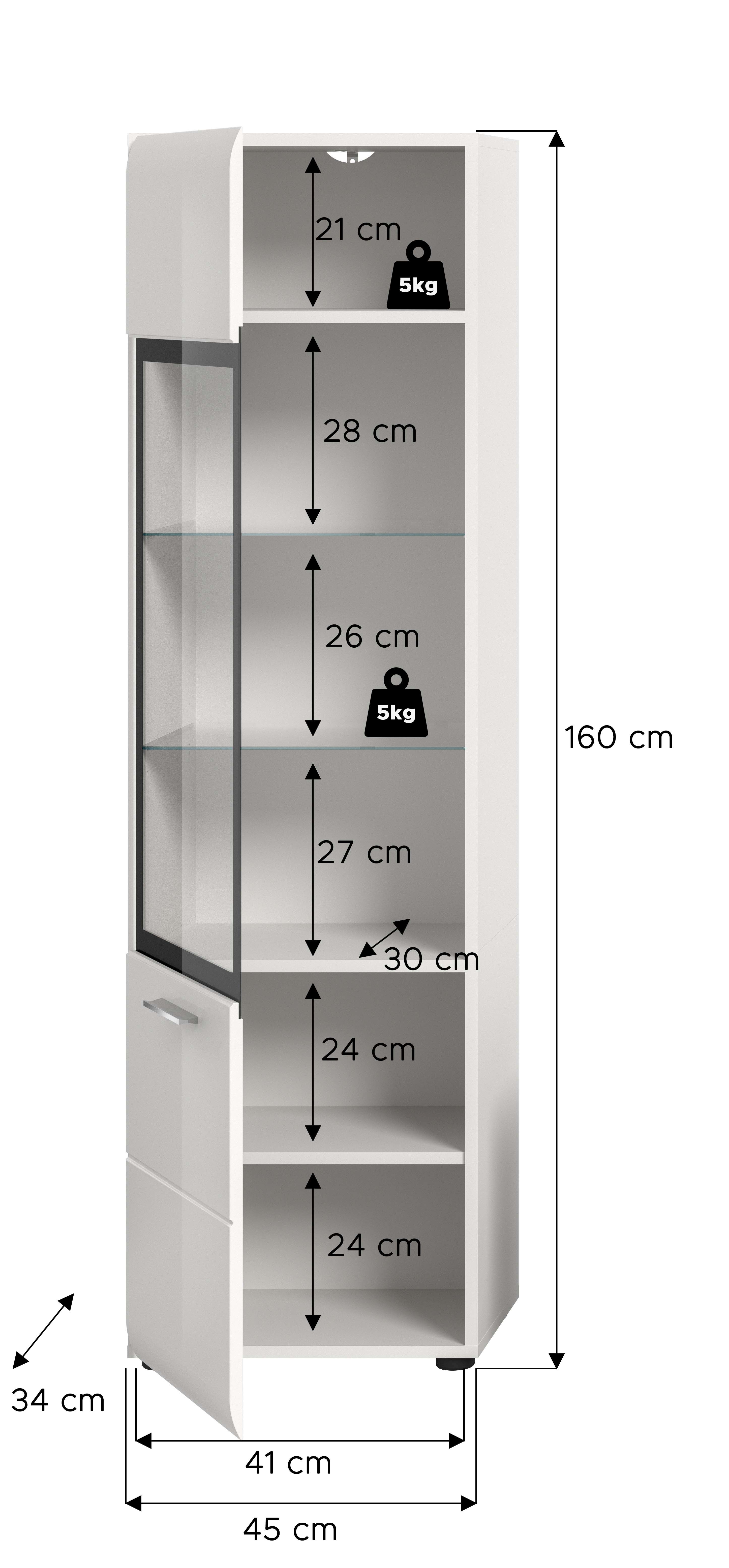 Elle est équipée d’une porte vitrée, de deux tablettes fixes, d’une tablette amovible réglable en hauteur et de deux tablettes en verre, formant au total six compartiments.