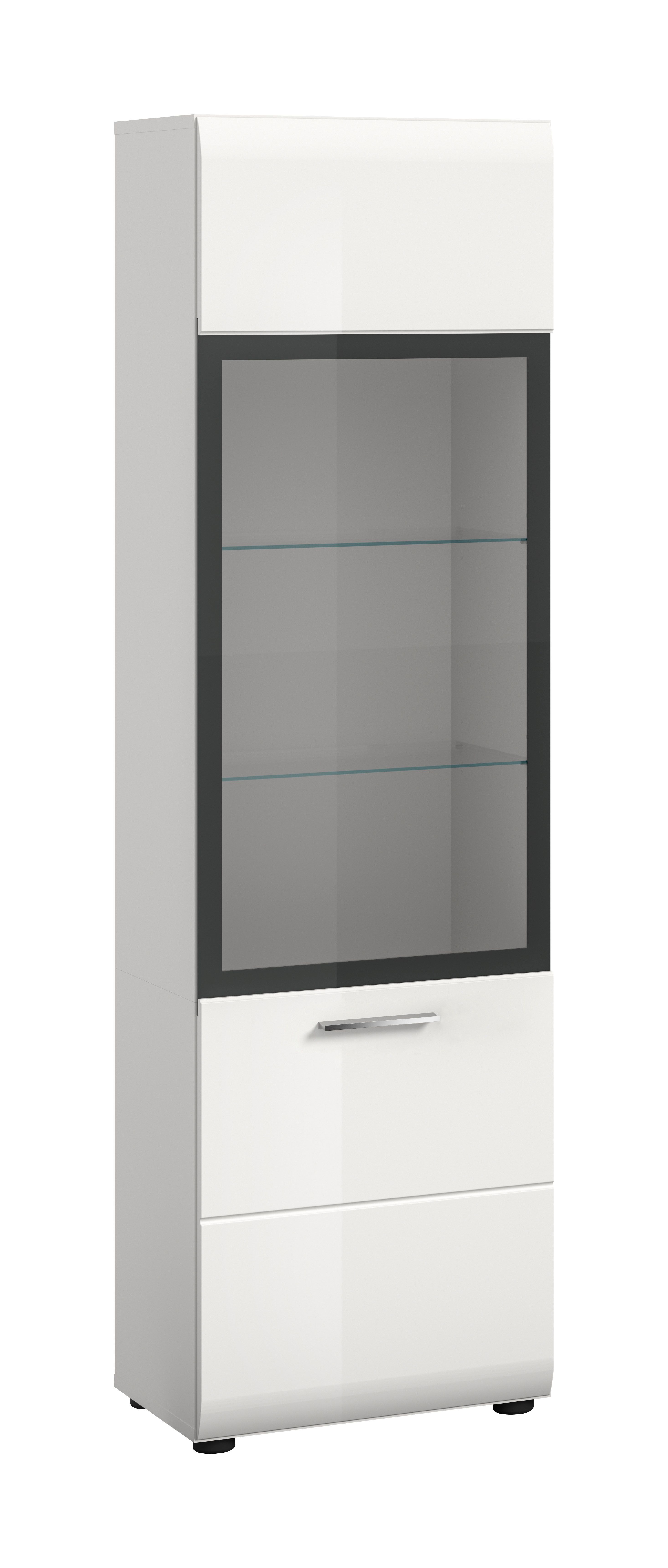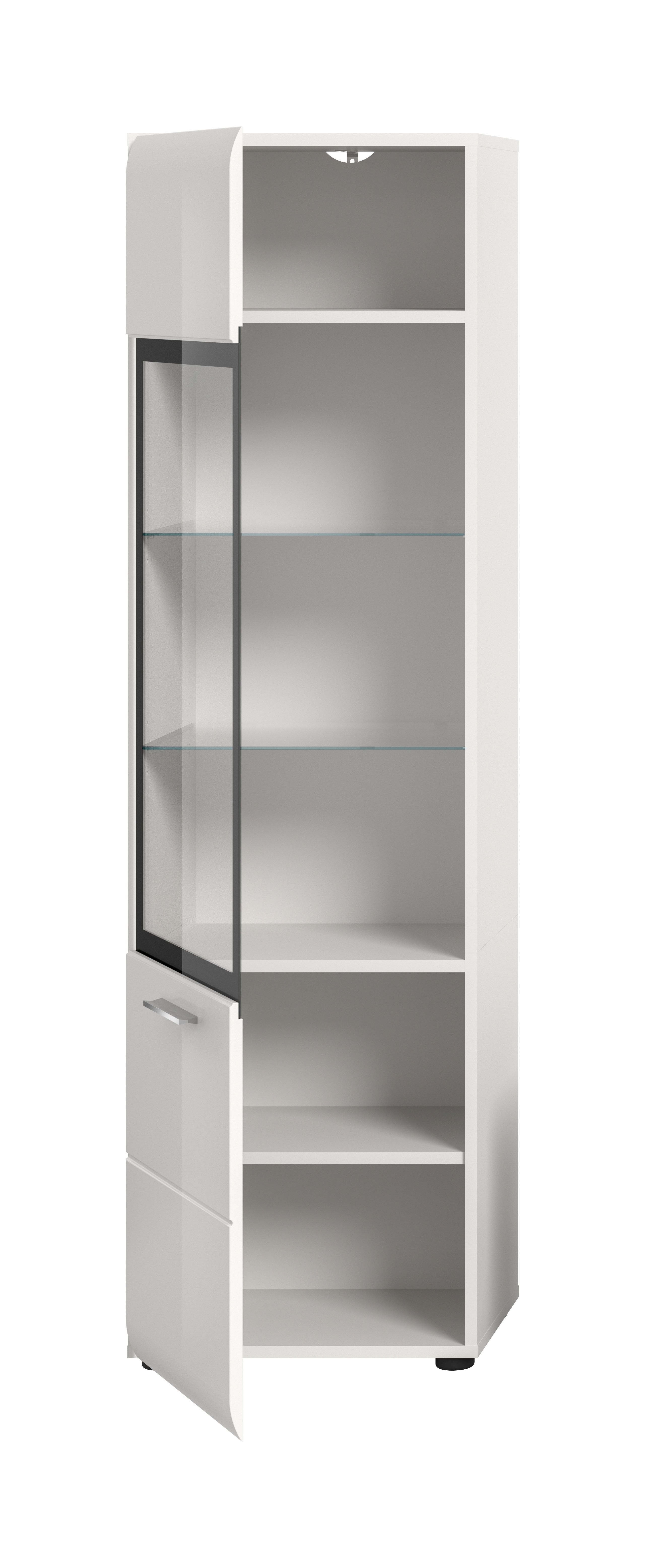 - 1 porte en verre, 2 tablettes fixes, 1 tablette amovible et réglable en hauteur, 2 tablettes amovibles en verre, 6 compartiments