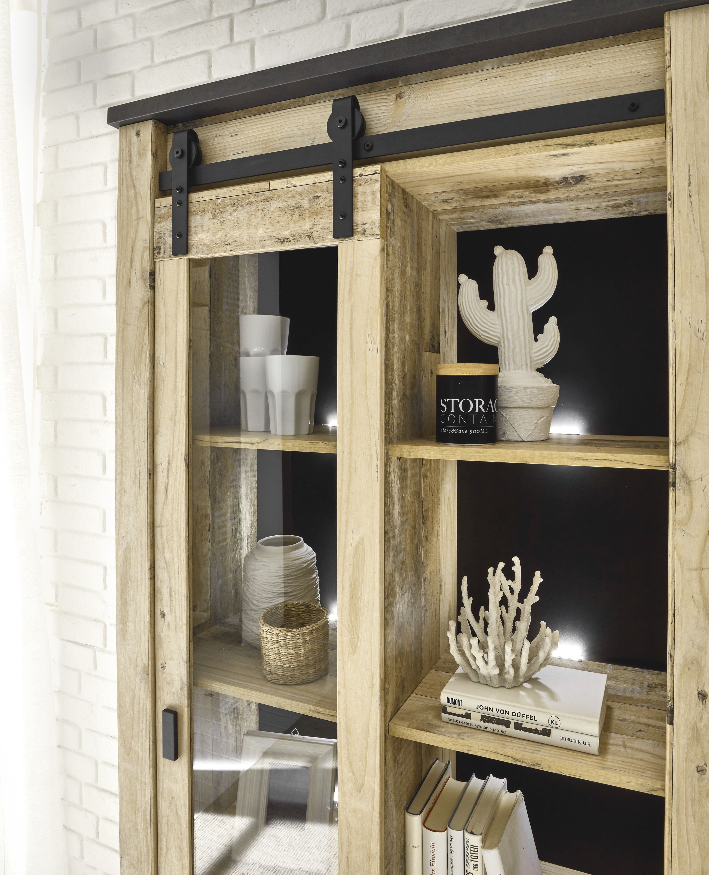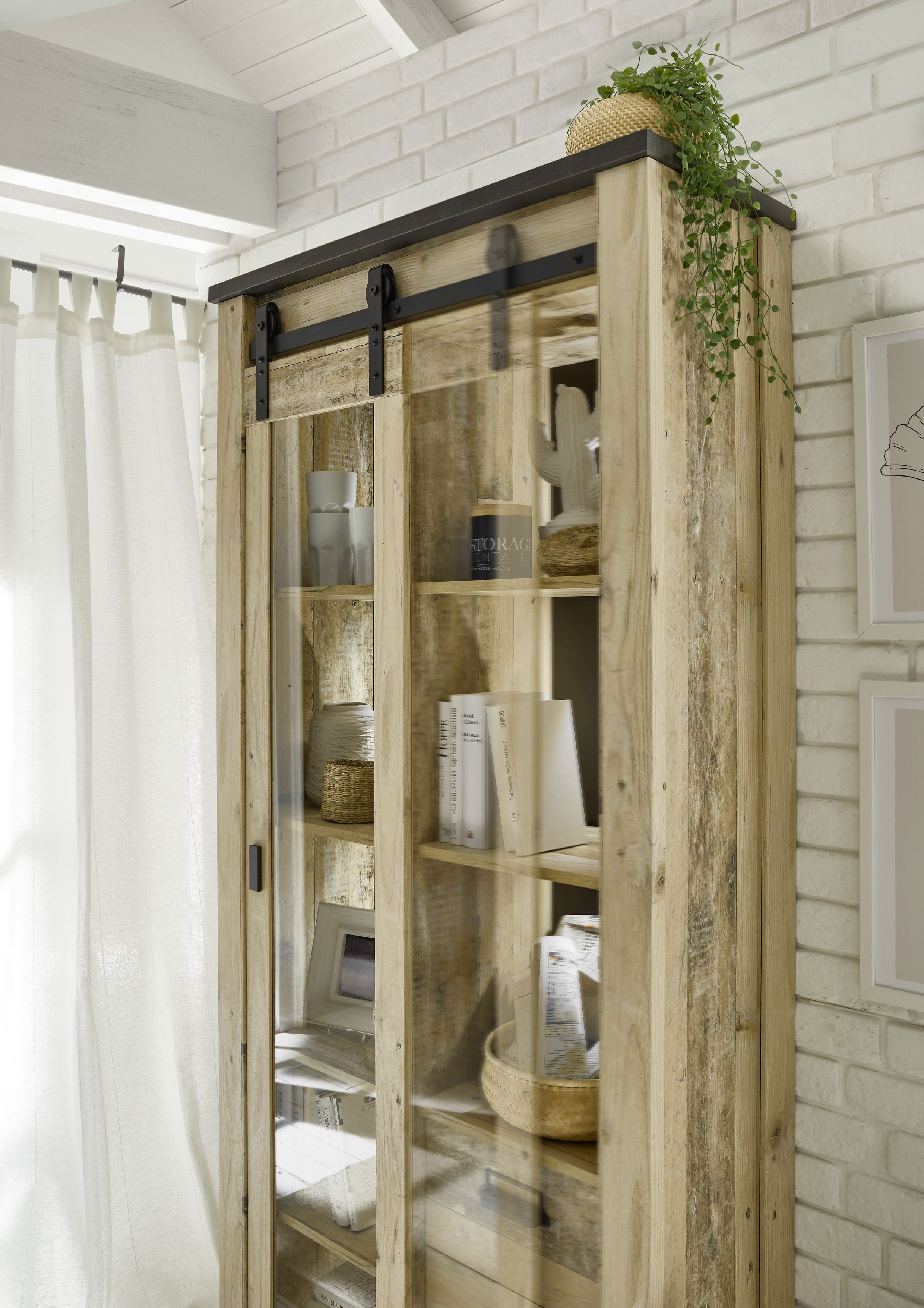 1 porte coulissante avec encadrement et, derrière elle, 4 tablettes