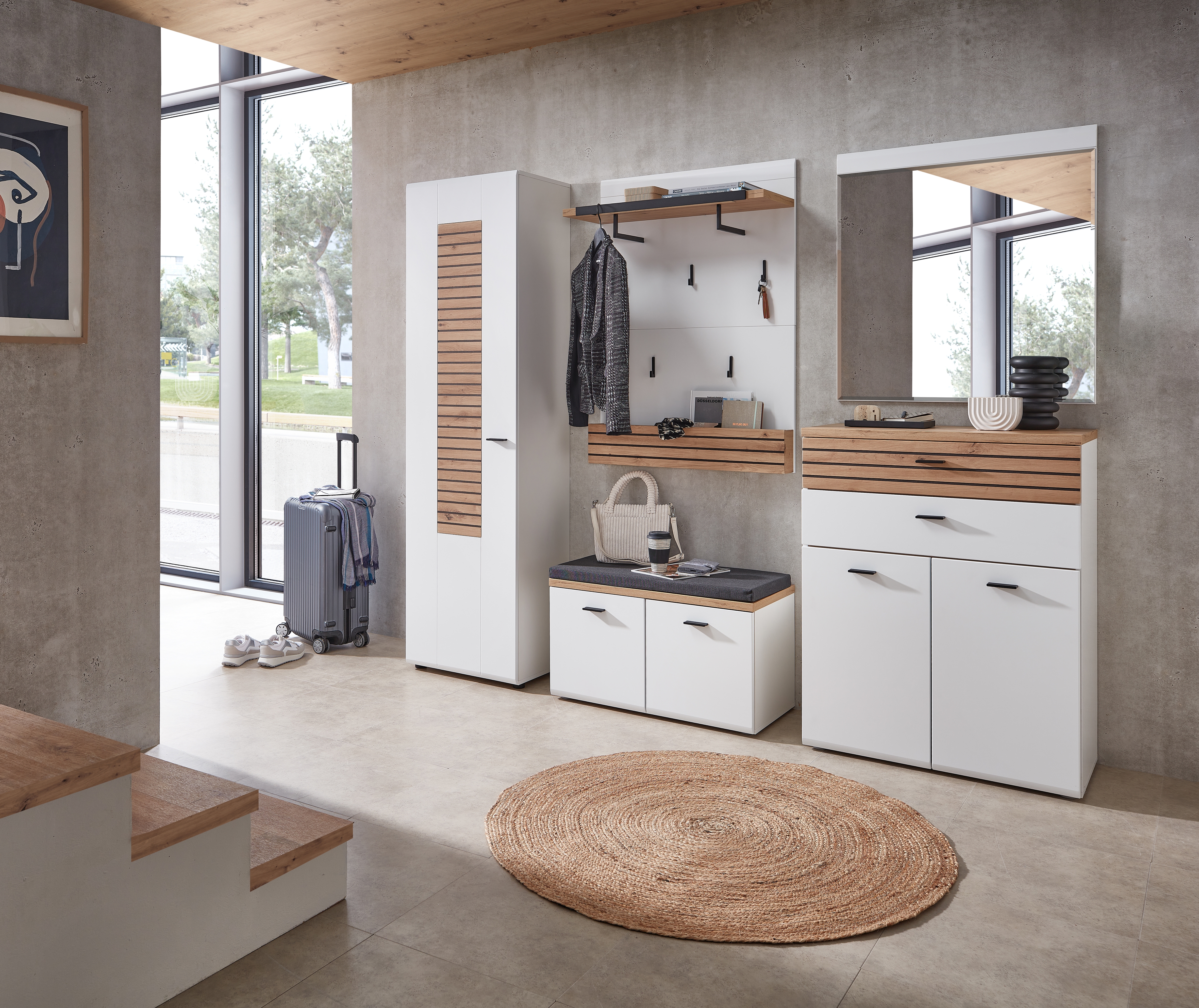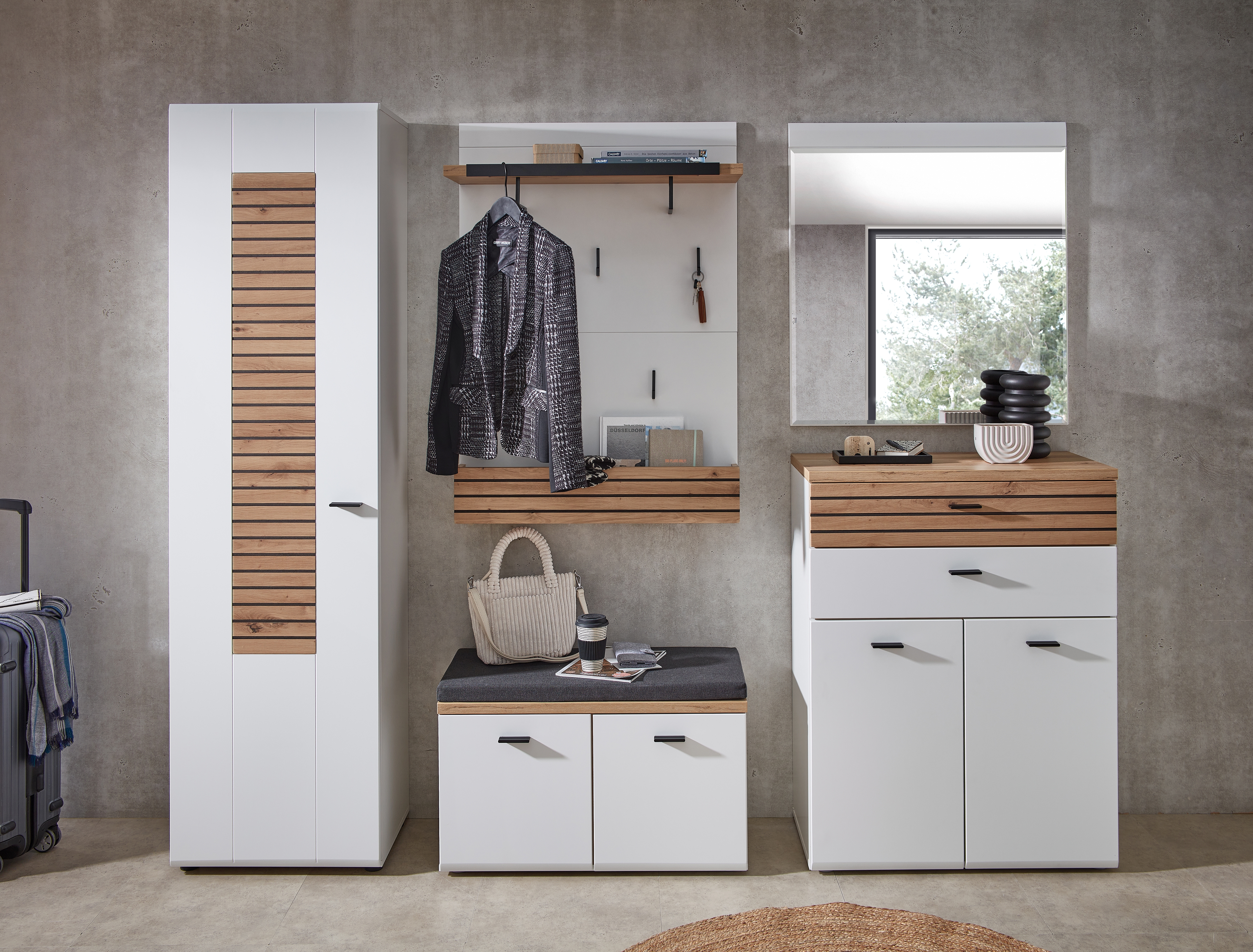 Façade : MDF (panneau de fibres de bois de densité moyenne) ton blanc mat / miroir