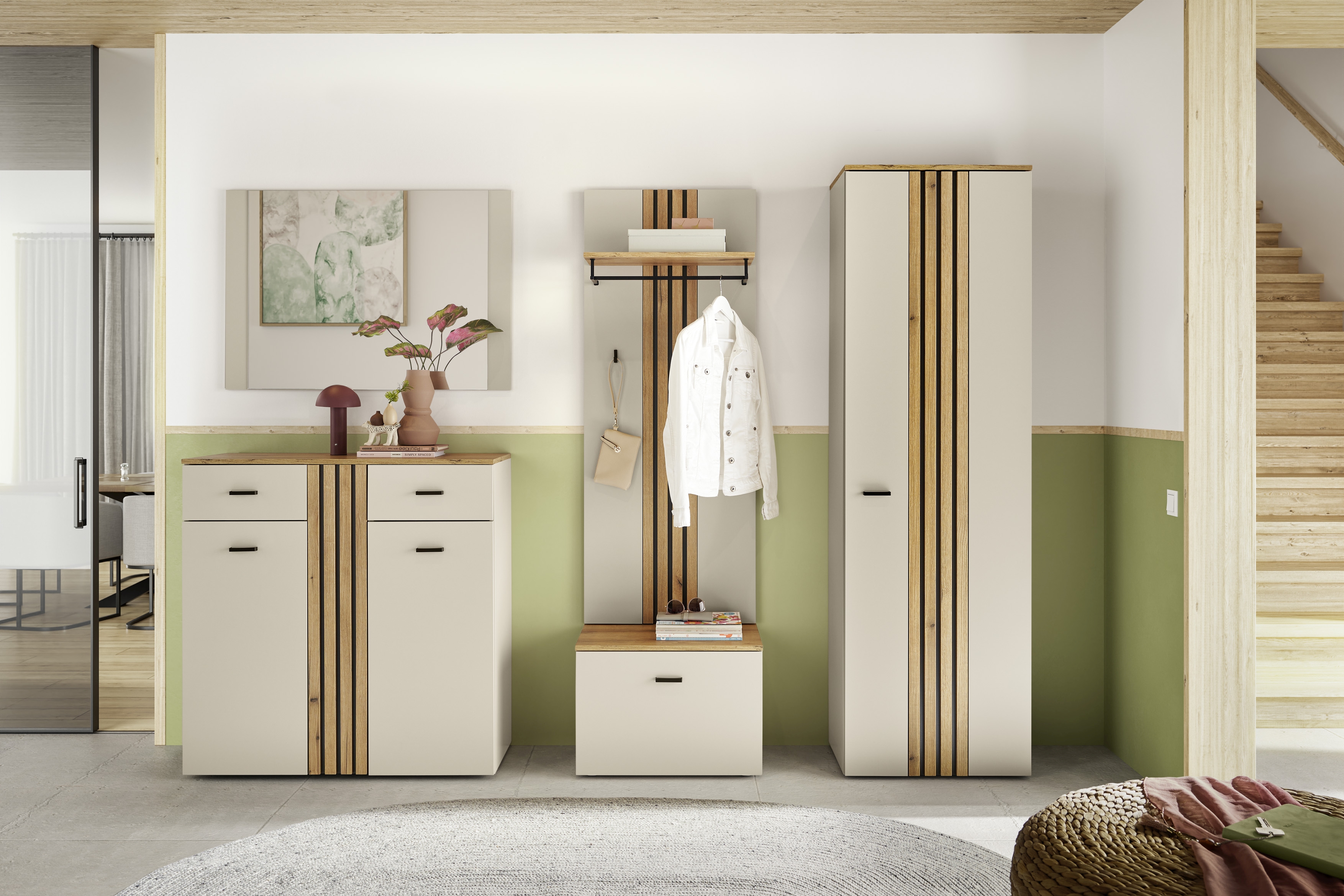 Façade : ton cachemire, panneau de particules surfacé et mélaminé (PPSM) / miroir