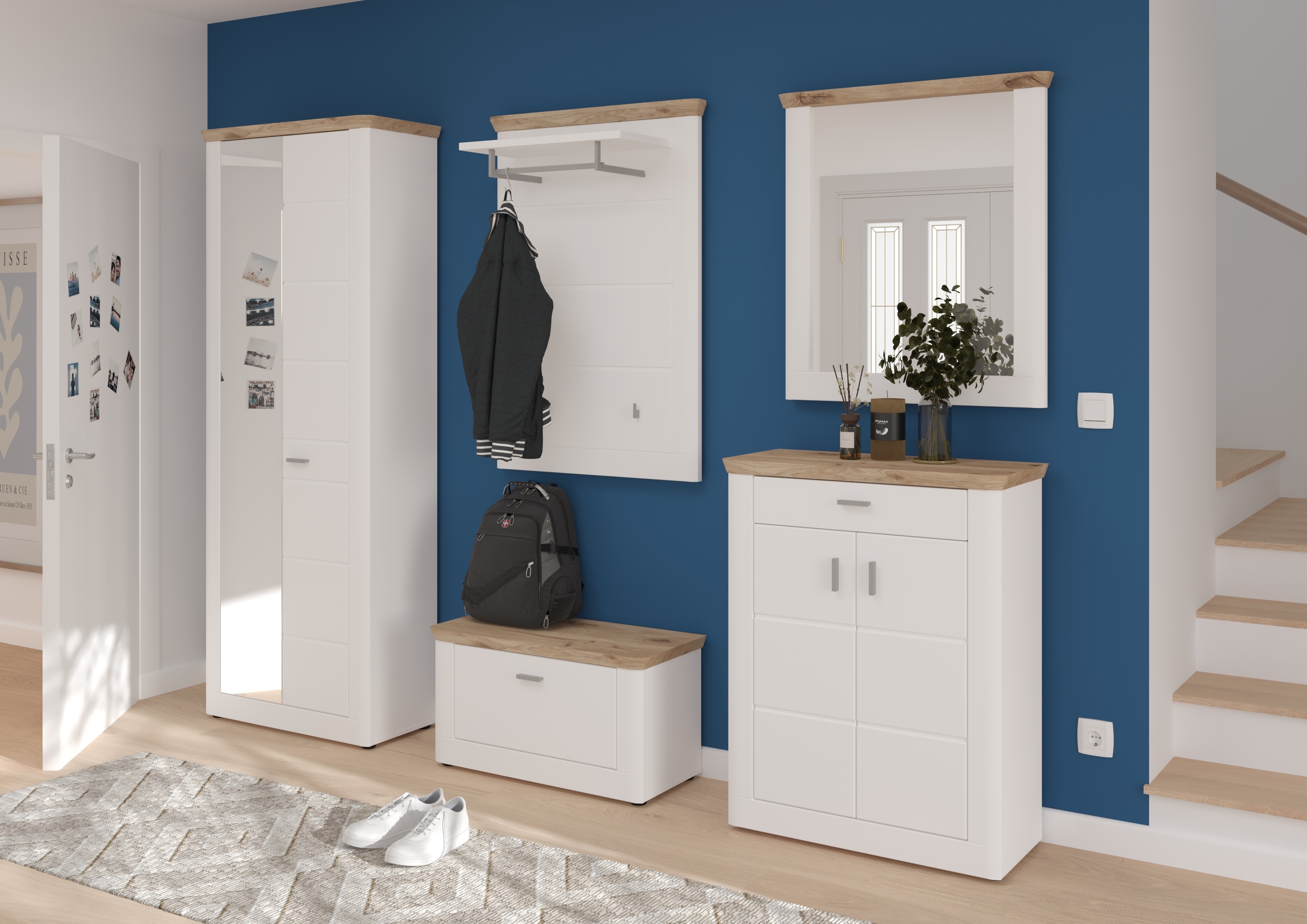 - Design/style : design sobre et moderne ton blanc et verre miroir dans une esthétique tendance qui s’intègre facilement dans le couloir ou l’entrée ; cet élément polyvalent se combine parfaitement à différents styles d’intérieurs.
