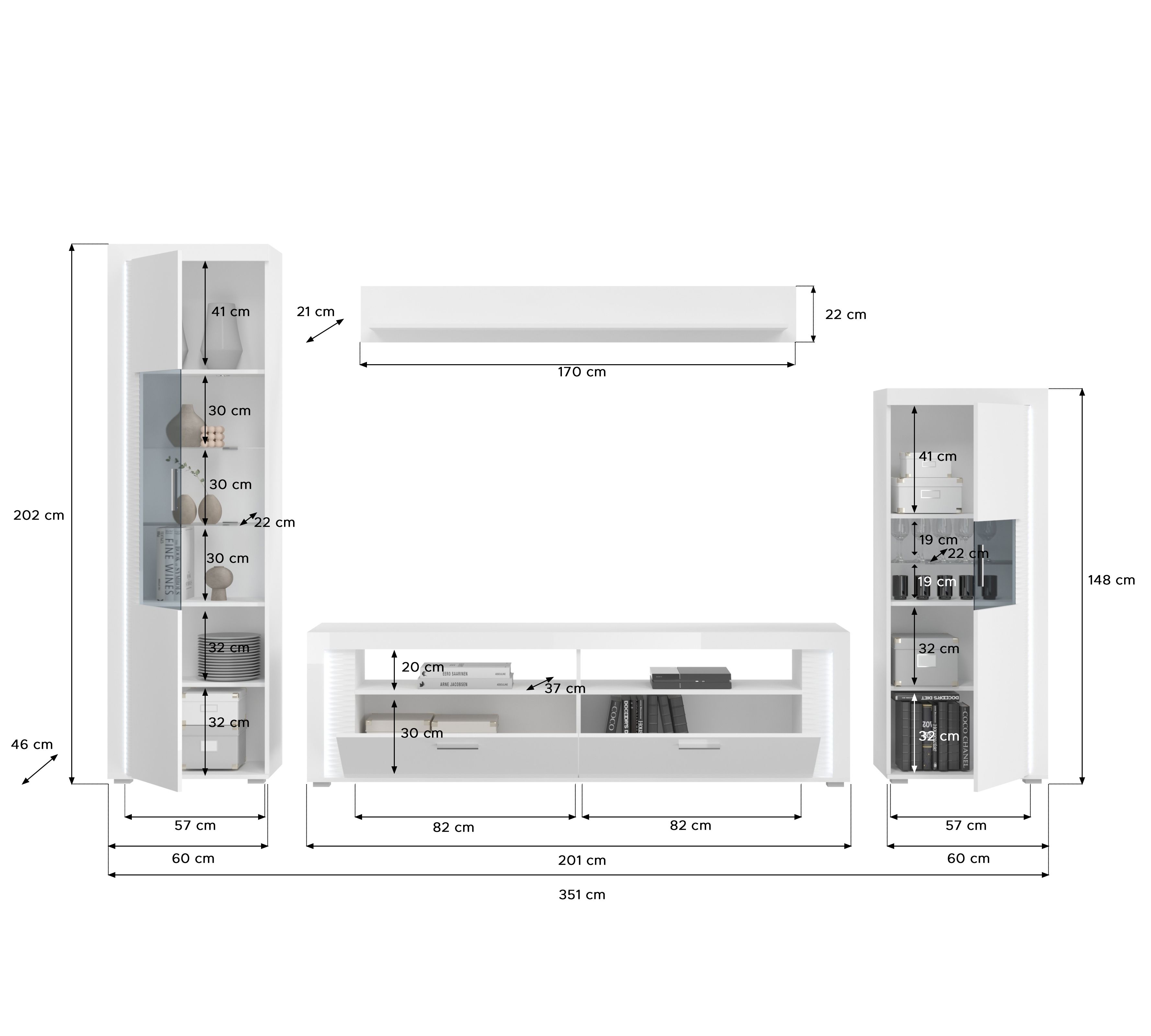 • Fonctionnalité : avec son vaste espace de rangement derrière les abattants et dans les vitrines, ce mur TV constitue une solution fonctionnelle pour ranger les appareils multimédias, la vaisselle, les objets déco et autres affaires du quotidien, tout en devenant le point central de la pièce et en structurant l’espace de vie.