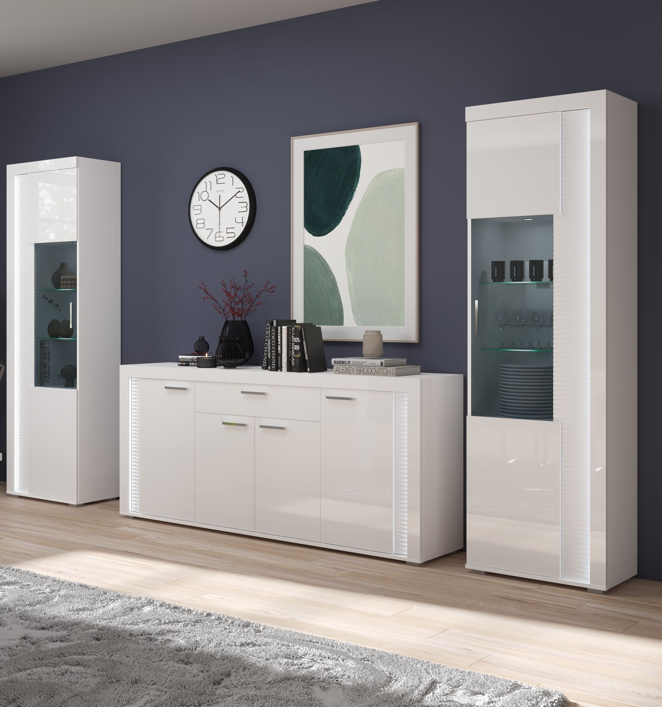 • Fonctionnalité : avec son vaste espace de rangement derrière les abattants et dans les vitrines, ce mur TV constitue une solution fonctionnelle pour ranger les appareils multimédias, la vaisselle, les objets déco et autres affaires du quotidien, tout en devenant le point central de la pièce et en structurant l’espace de vie.