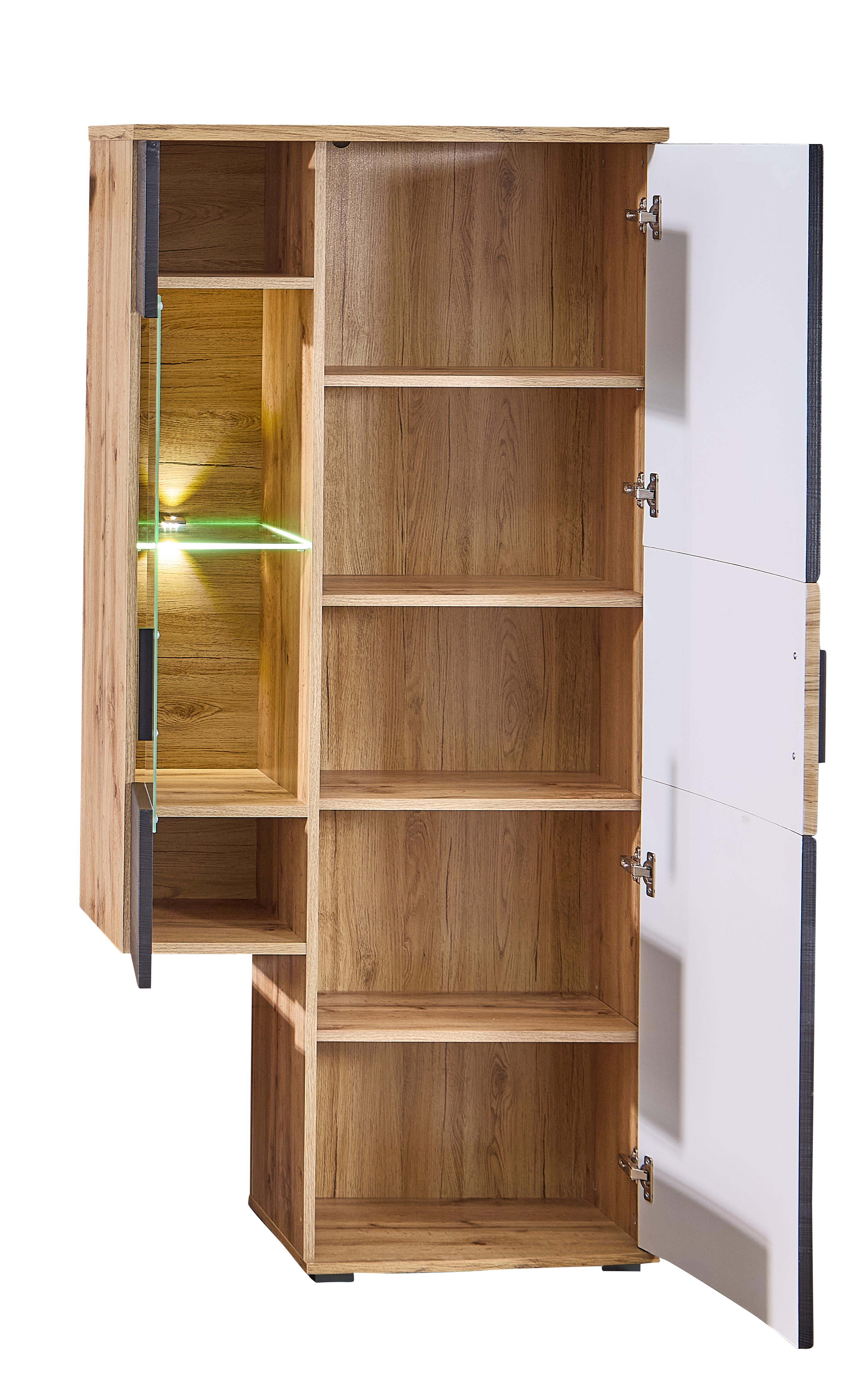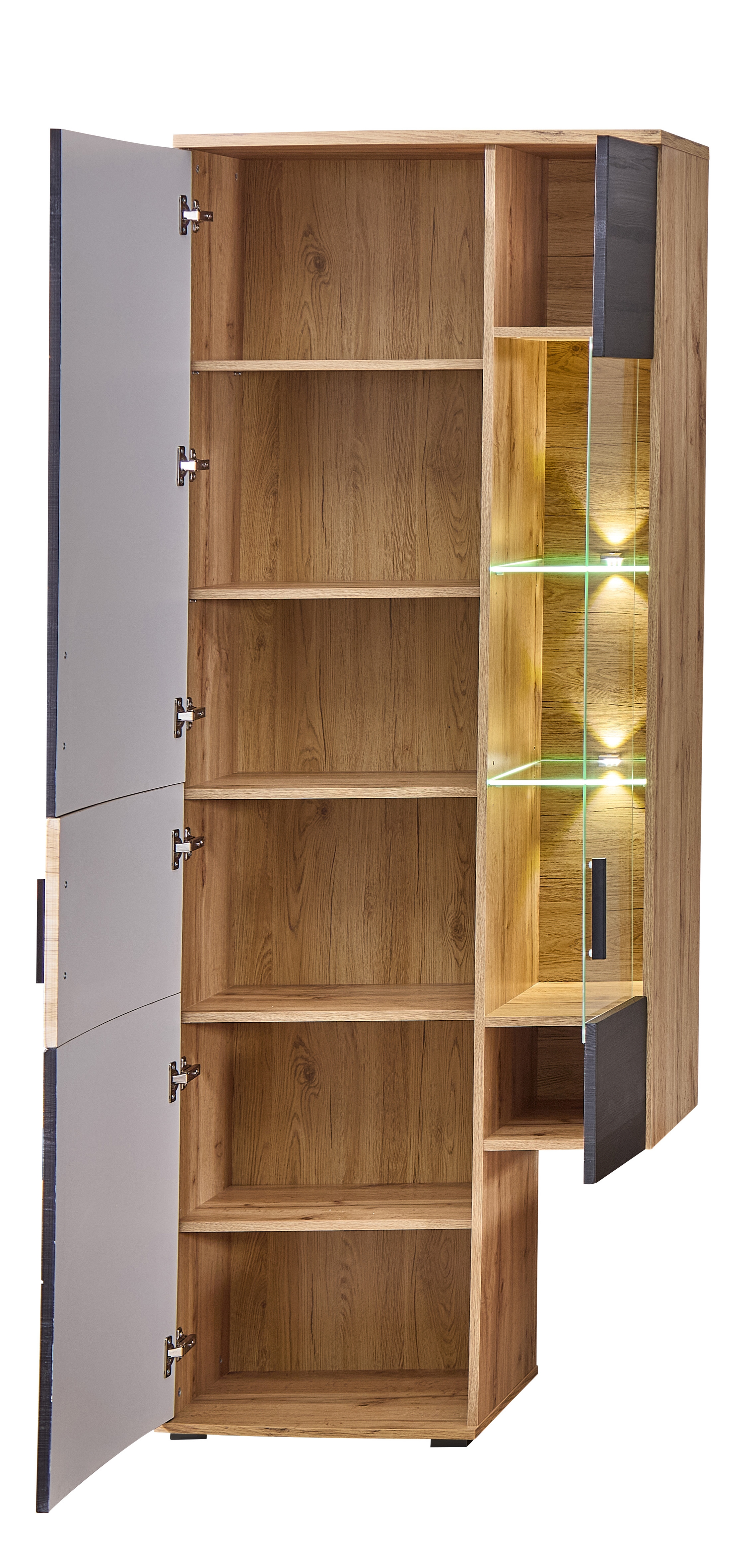1 meuble vitrine à gauche avec 1 porte en bois, 1 porte en verre/ bois, 7 tablettes amovibles et 2 tablettes en verre