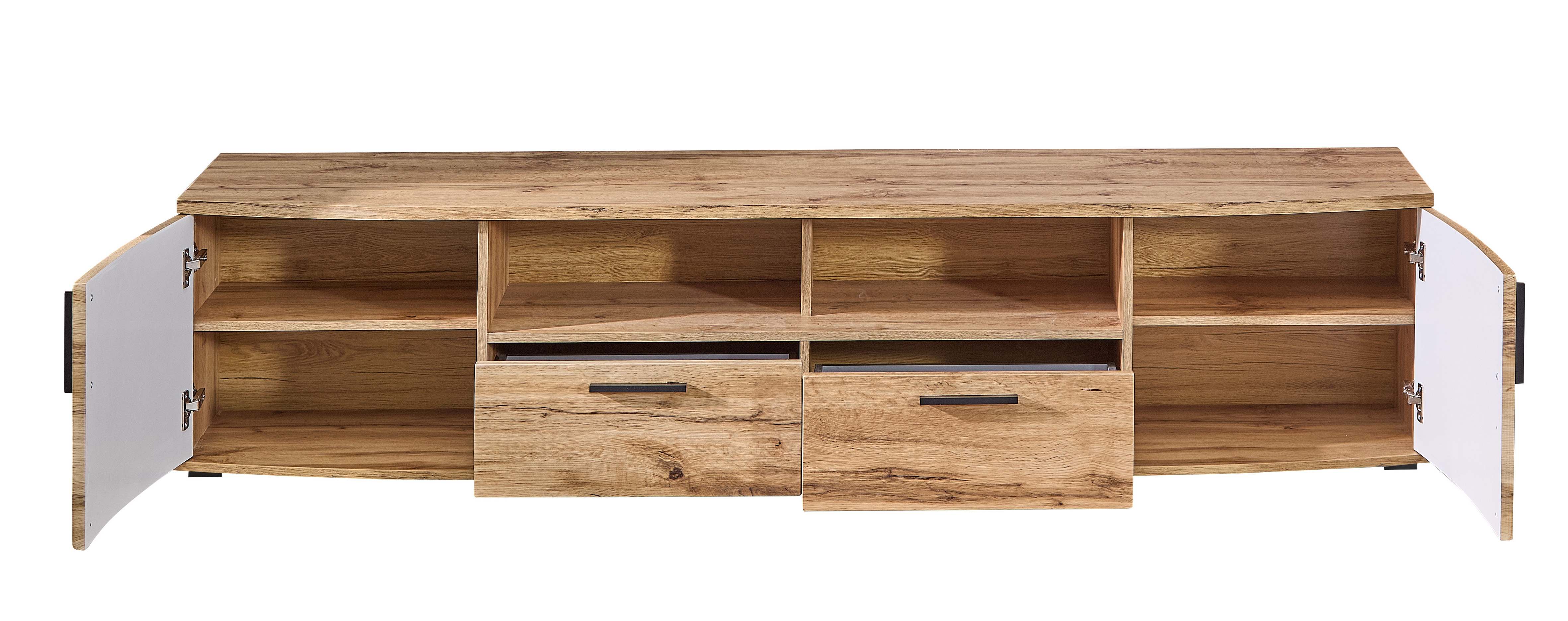 1 meuble TV avec 2 portes, 2 tablettes en bois, 2 tiroirs et 2 casiers ouverts