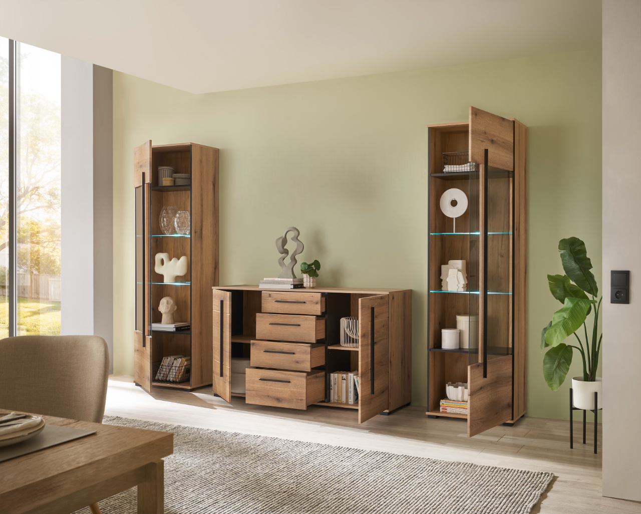 2 meubles vitrines avec, chacun, 1 porte, 2 tablettes en verre et 2 tablettes fixes (portes pouvant être montées avec ouverture à droite ou à gauche)