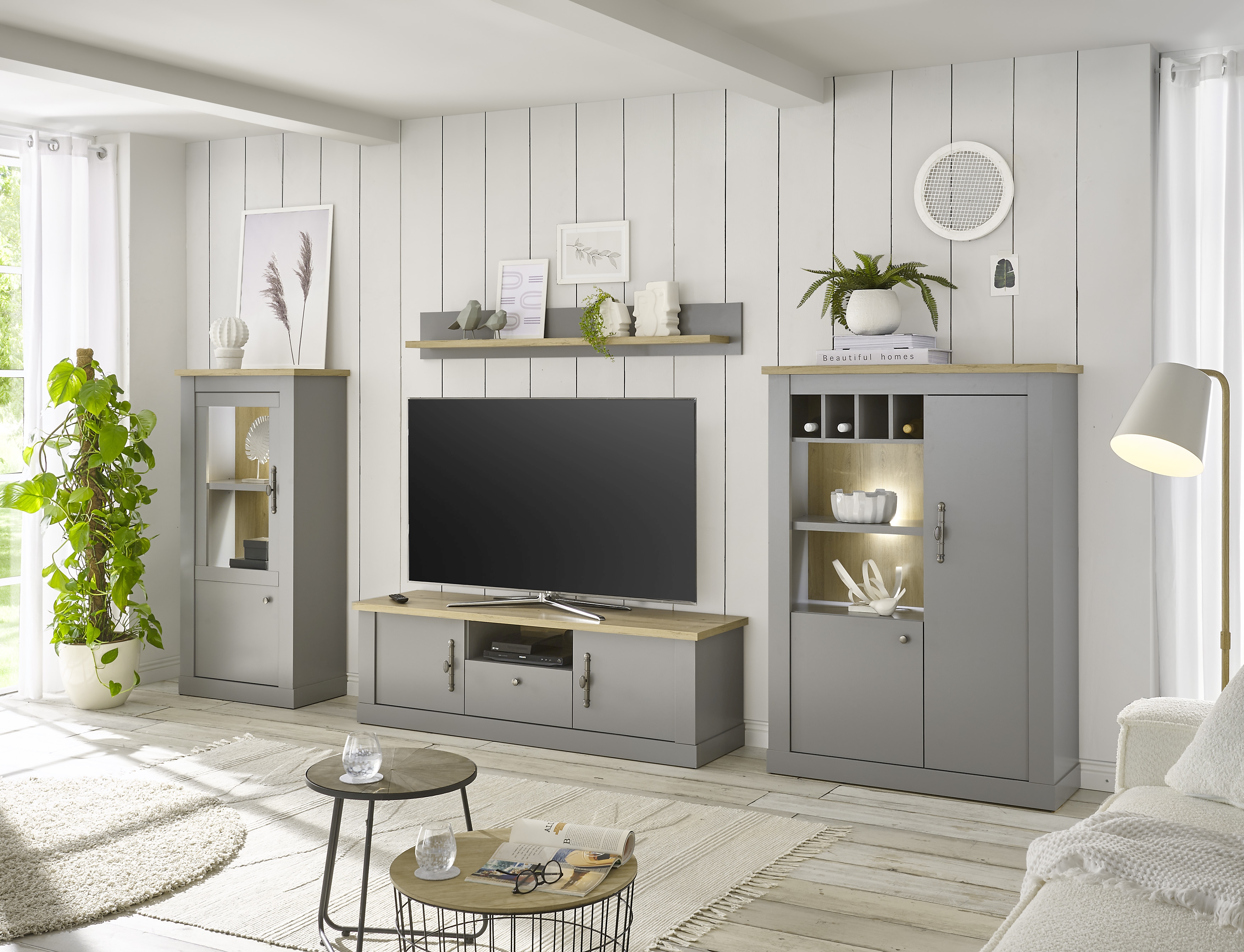 1 banc TV avec 1 casier pour l'équipement, 1 passe-câble, 1 tiroir et 2 portes