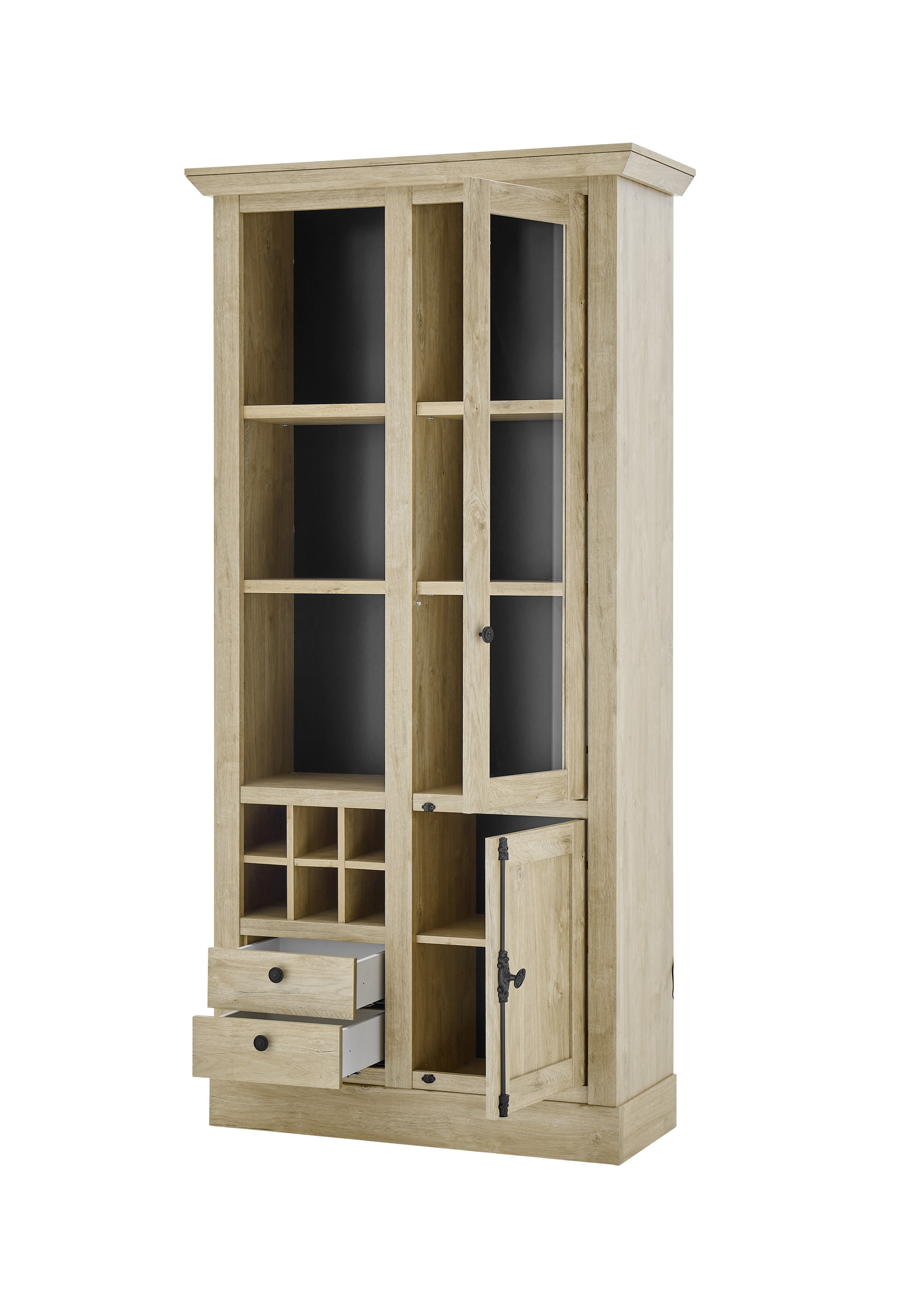 1 bahut haut avec 3 casiers ouverts, 1 porte en verre avec encadrement (derrière elle, 2 tablettes), 1 rangement pour bouteilles avec 6 casiers et 2 tiroirs