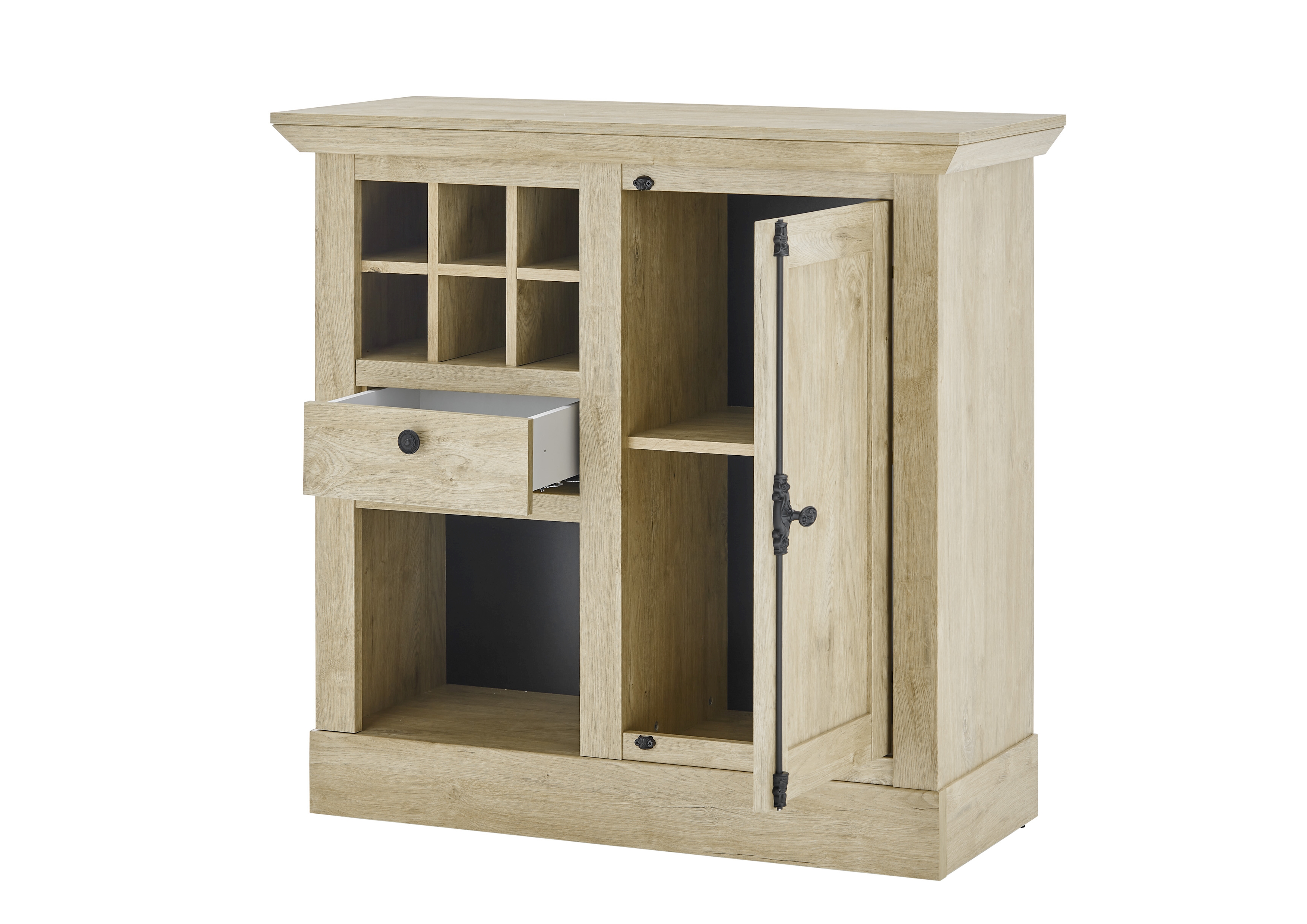1 bahut comprenant 1 rangement pour bouteilles avec 6 casiers, 1 tiroir, 1 casier ouvert et 1 porte (derrière elle, 1 tablette)