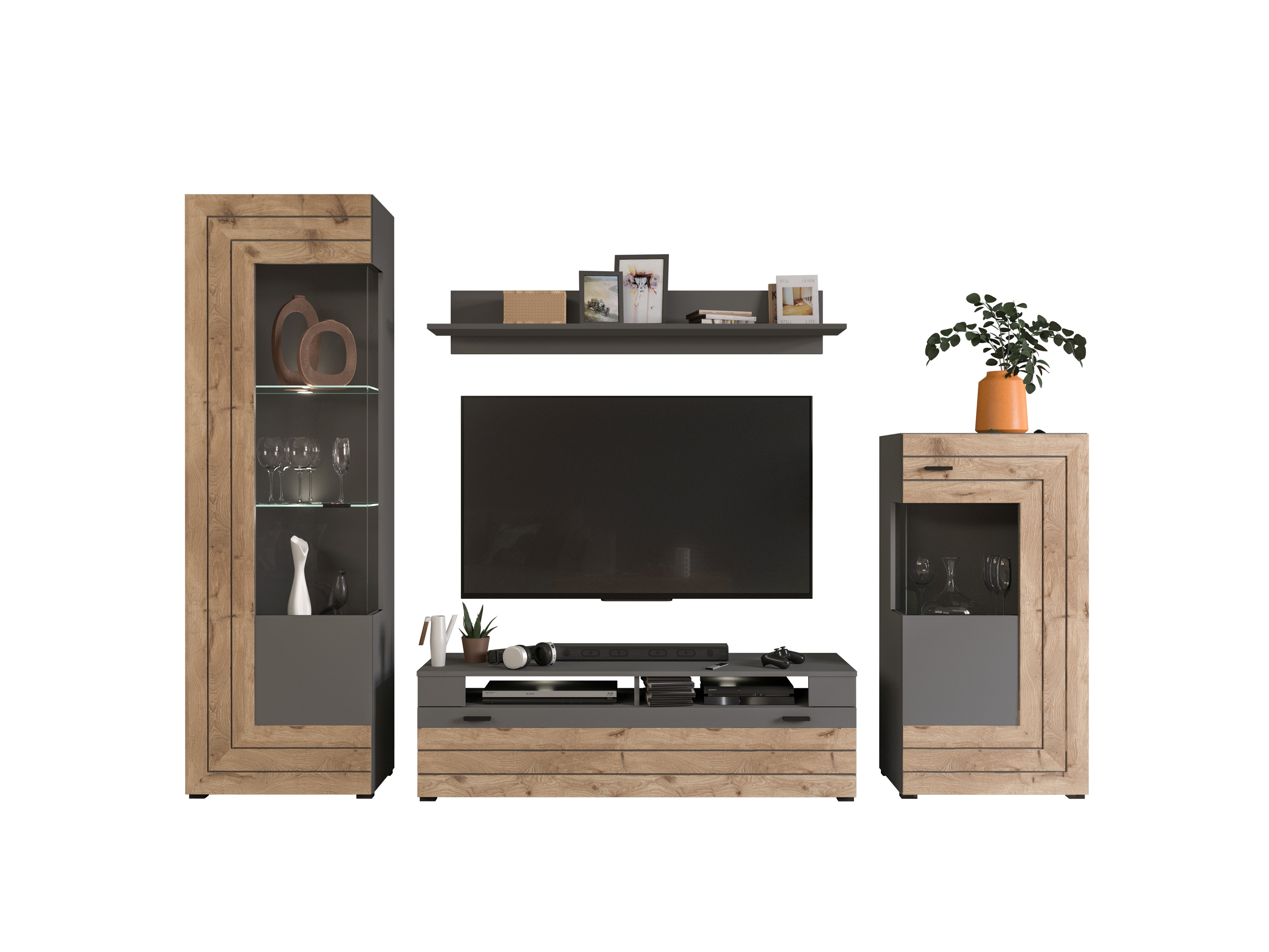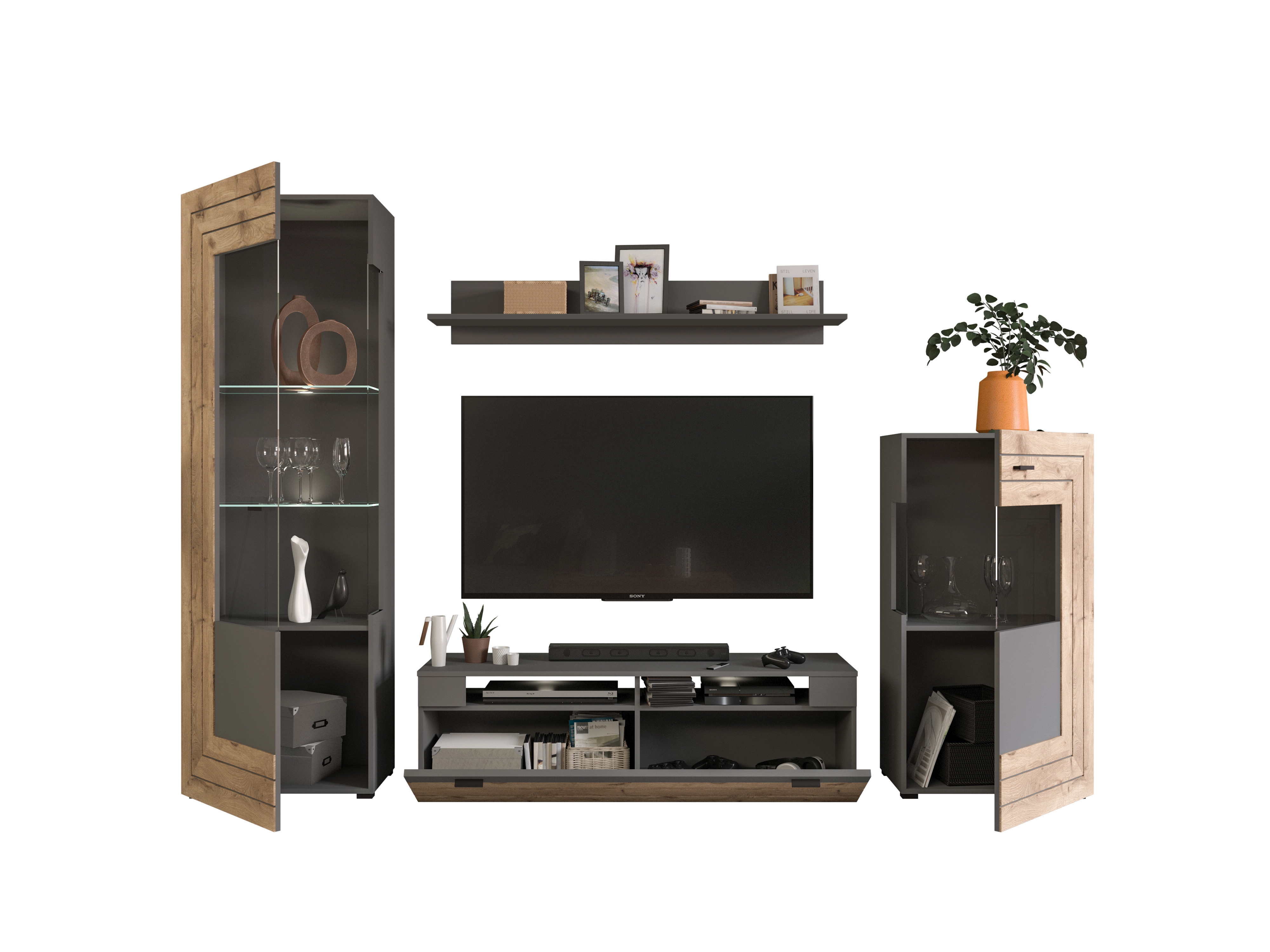 Notre mur TV polyvalent dans un ton gris attrayant et décor chêne Nox est la solution idéale pour votre salon. Grâce à son design bien pensé et à sa finition de qualité, ce mur TV crée un bel espace de rangement tout en mettant joliment en valeur votre intérieur. Découvrez dès à présent l’élégance, mais aussi l’aspect moderne et pratique de ce mur TV qui enrichira votre salon et attirera tous les regards.
