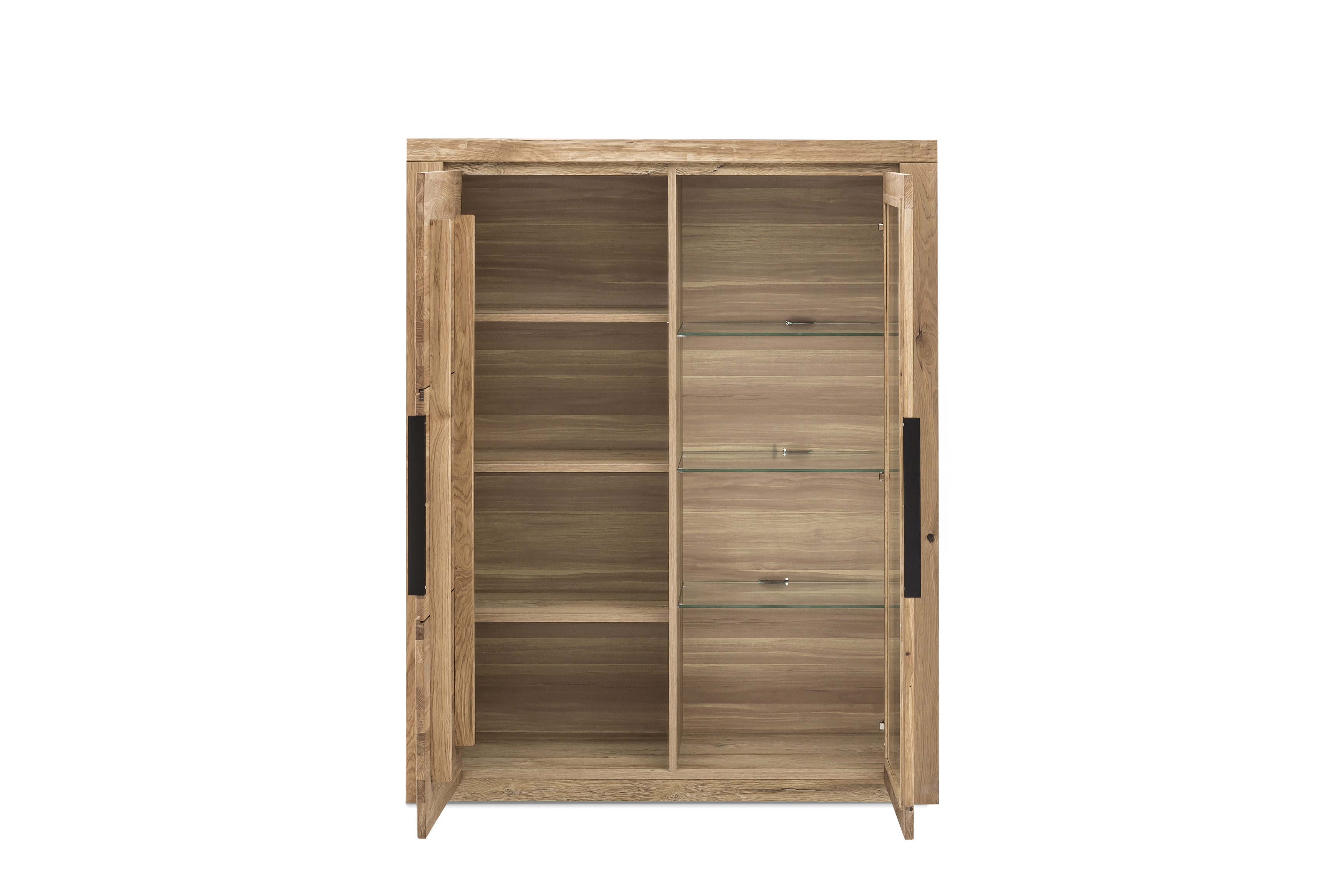 1 meuble vitrine à mi-hauteur avec 1 porte en bois, 1 porte en verre, 3 tablettes en bois et 3 tablettes en verre