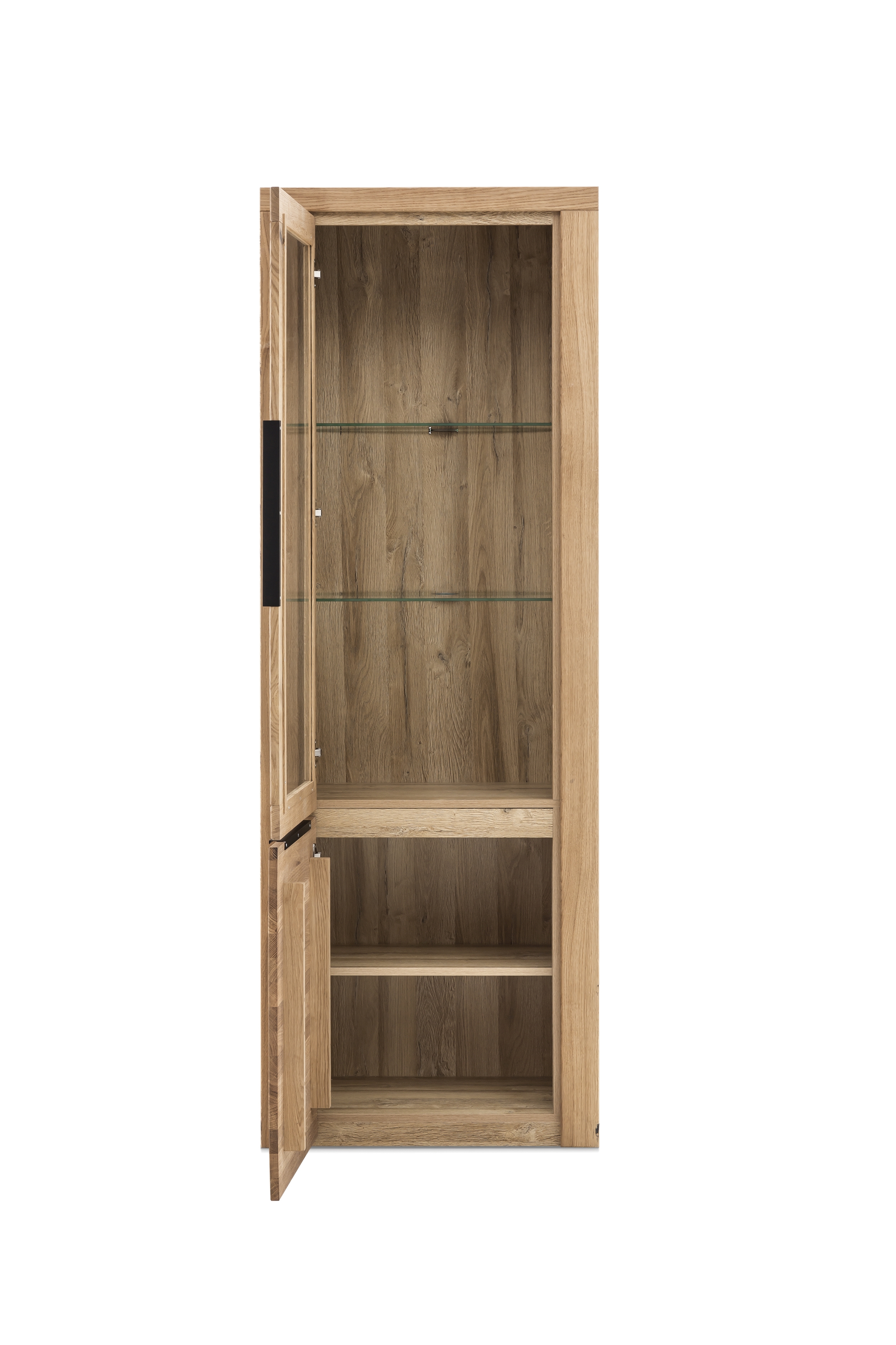 1 meuble vitrine avec 1 porte en verre, 1 porte en bois, 2 tablettes amovibles en verre et 1 tablette amovible en bois