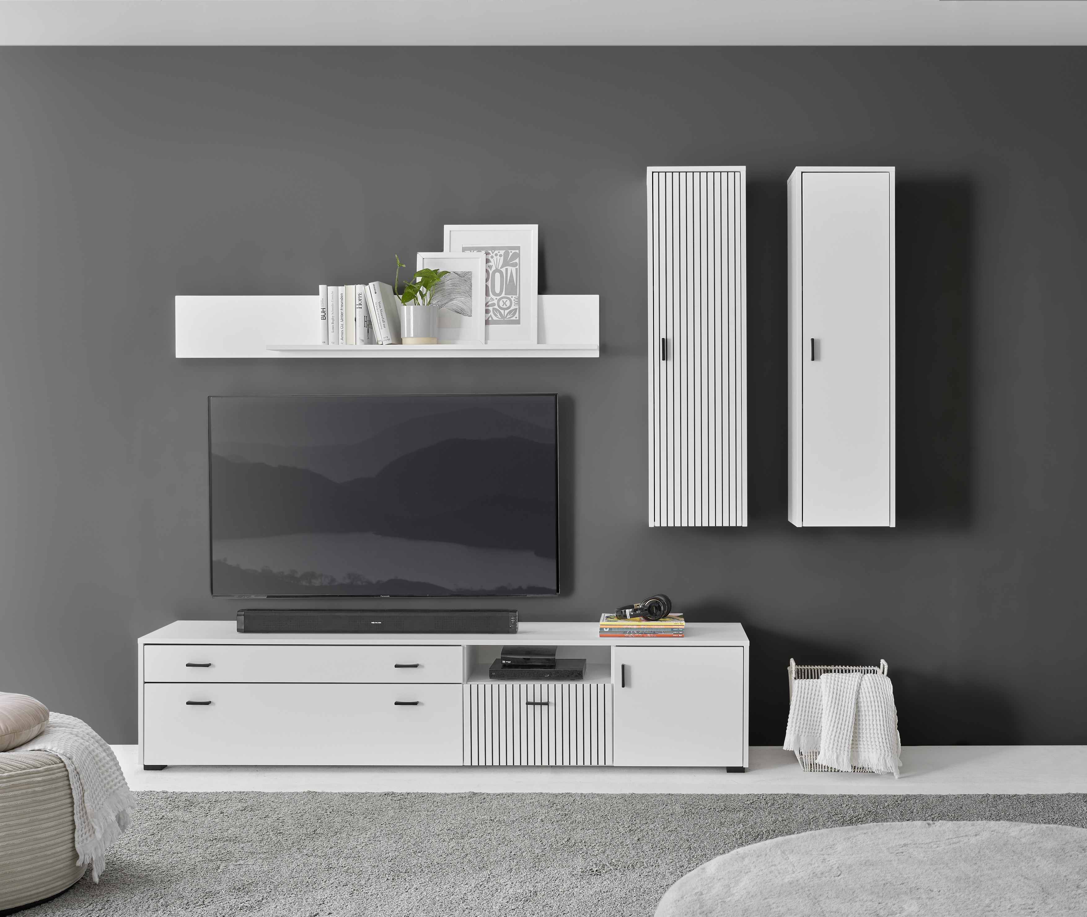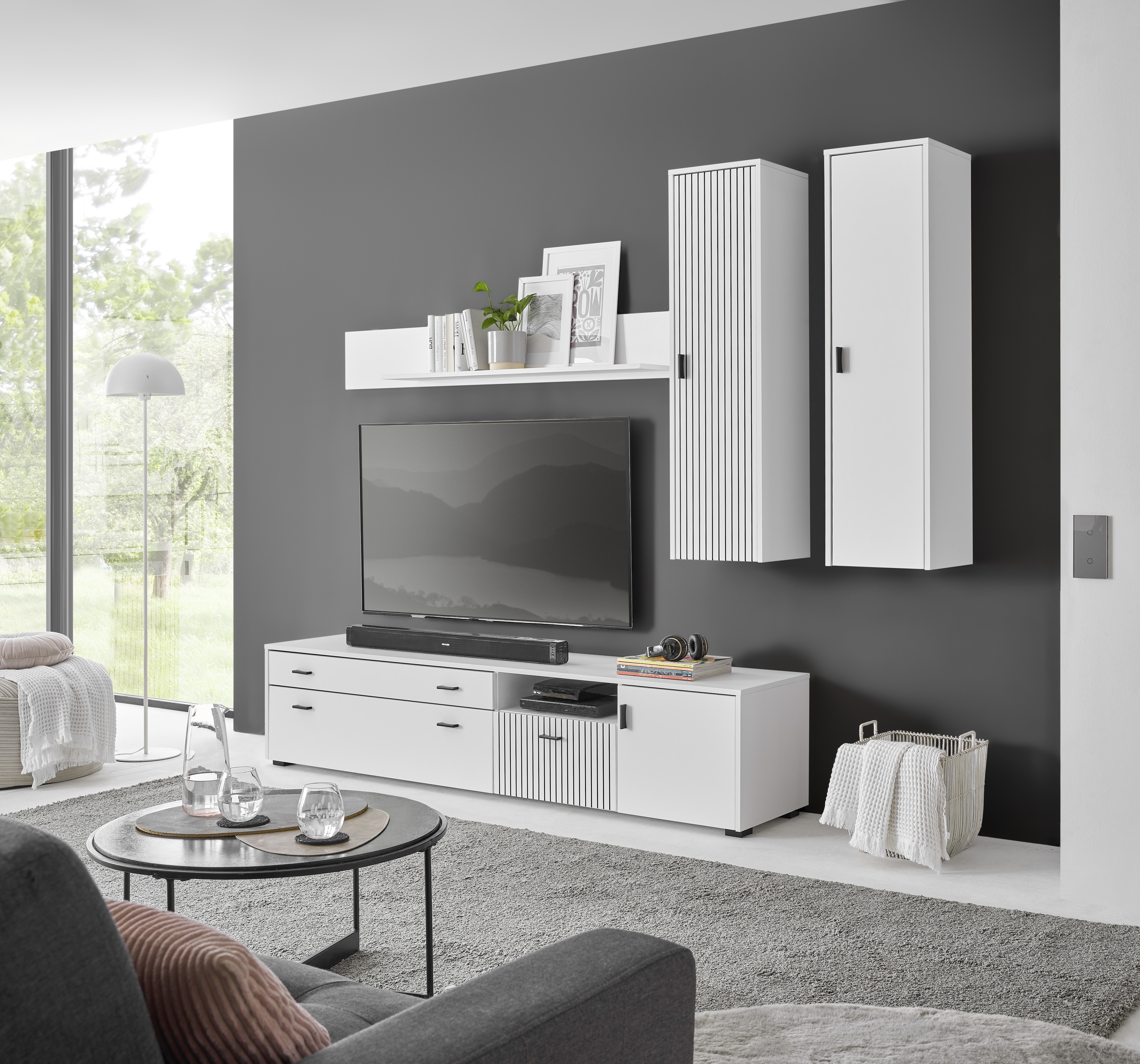1 banc TV avec 2 portes, 1 abattant, 1 tiroir et un casier pour l’équipement