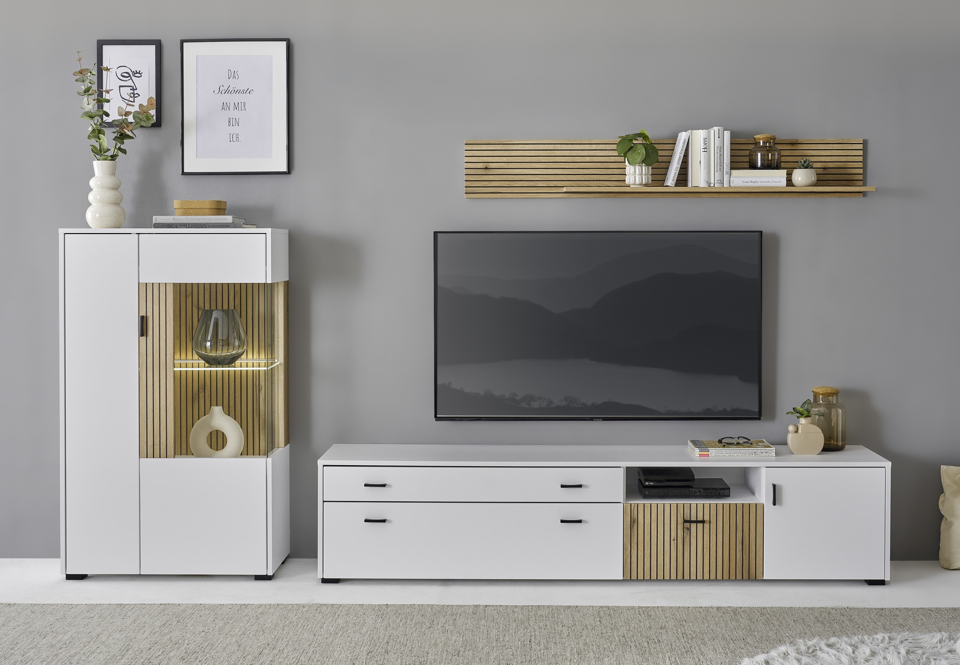 1 banc TV avec 2 portes, 1 abattant, 1 tiroir et un casier pour l’équipement