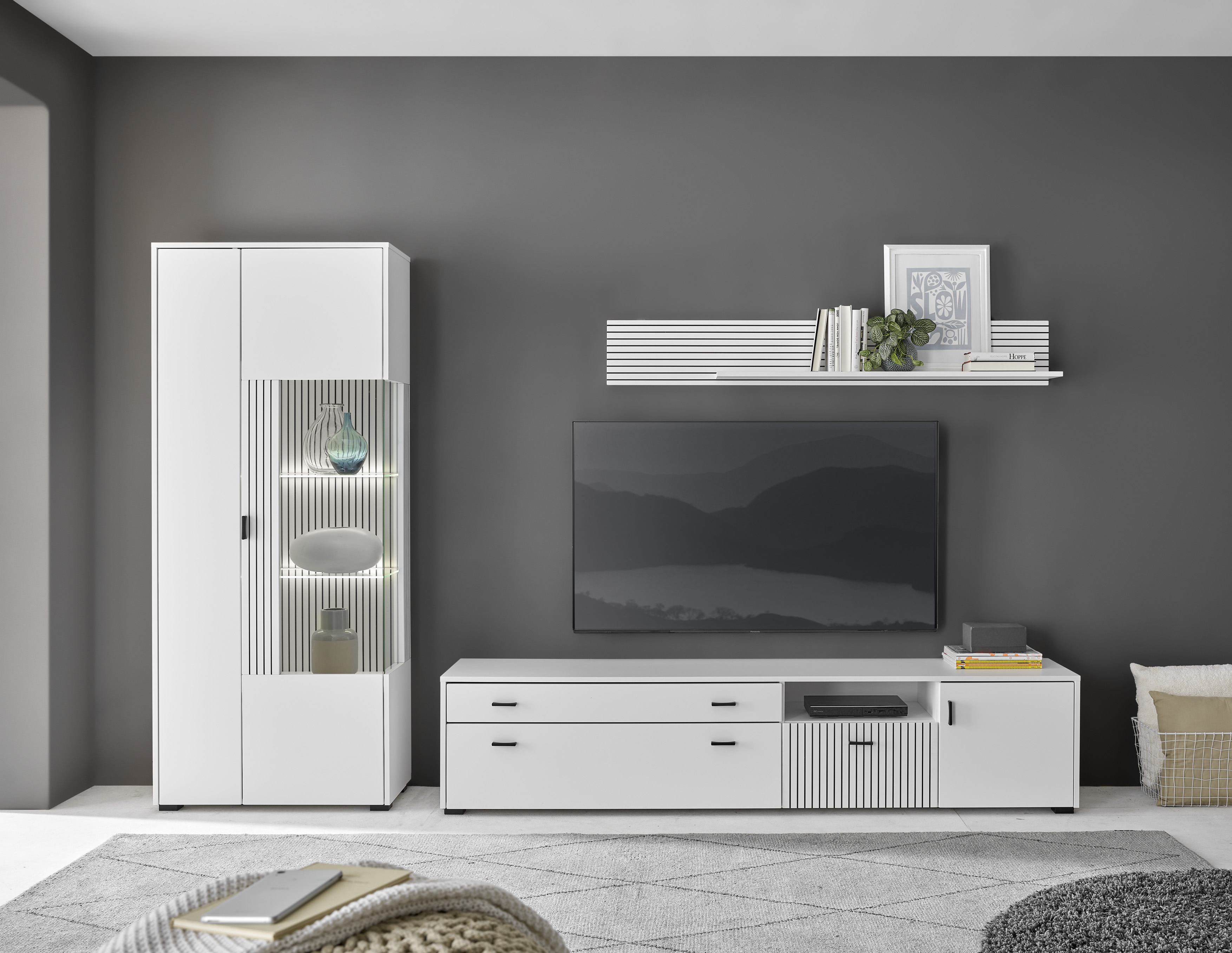 1 banc TV avec 2 portes, 1 abattant, 1 tiroir et un casier pour l’équipement