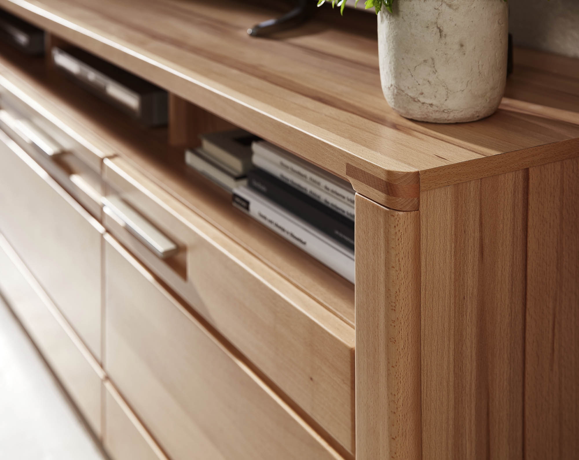 1 banc TV avec 3 casiers ouverts, 3 passe-câbles et 3 portes