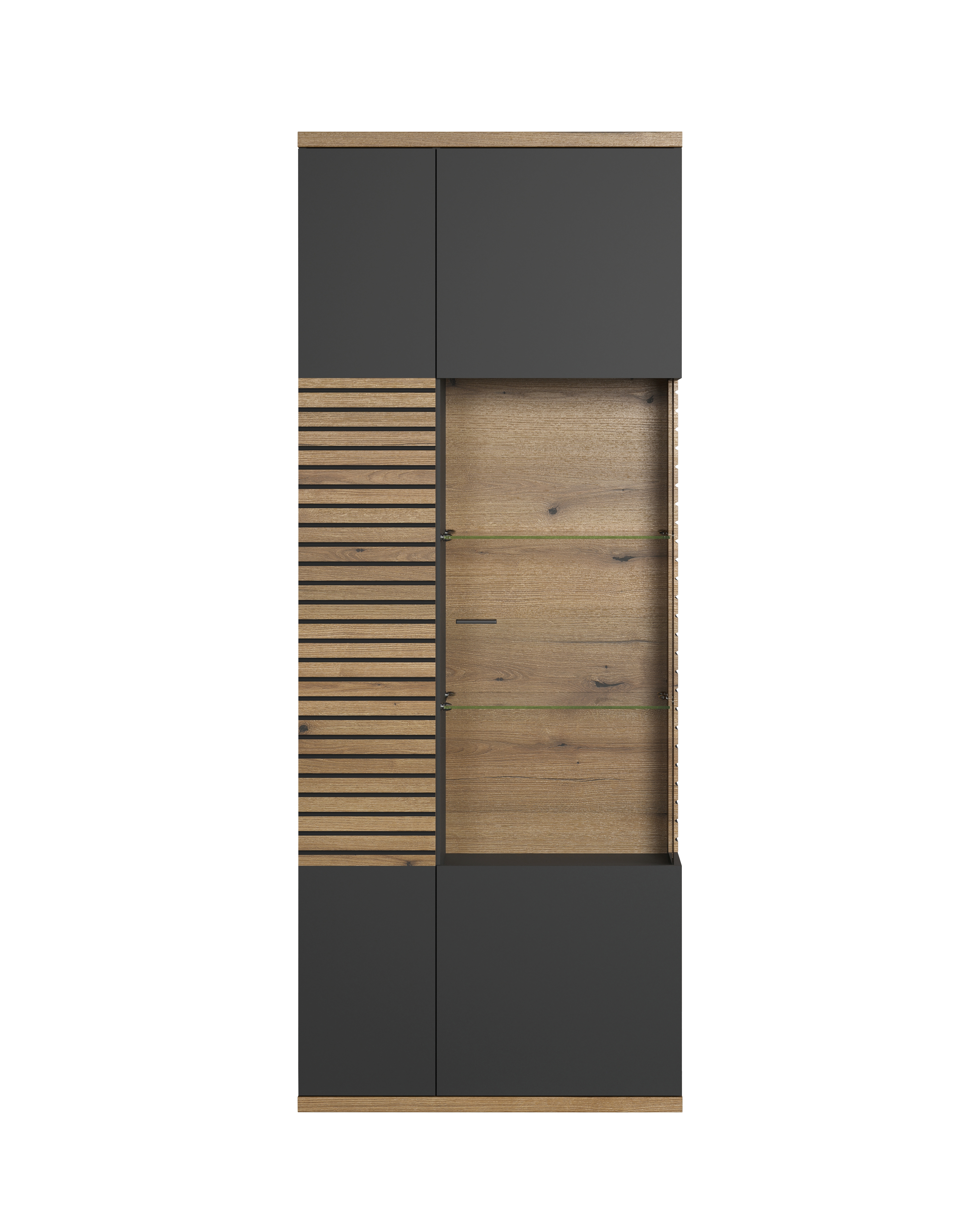 1 meuble vitrine avec 1 porte en bois, 1 porte en verre/bois et, derrière elles, 2 tablettes en verre et 7 tablettes en bois