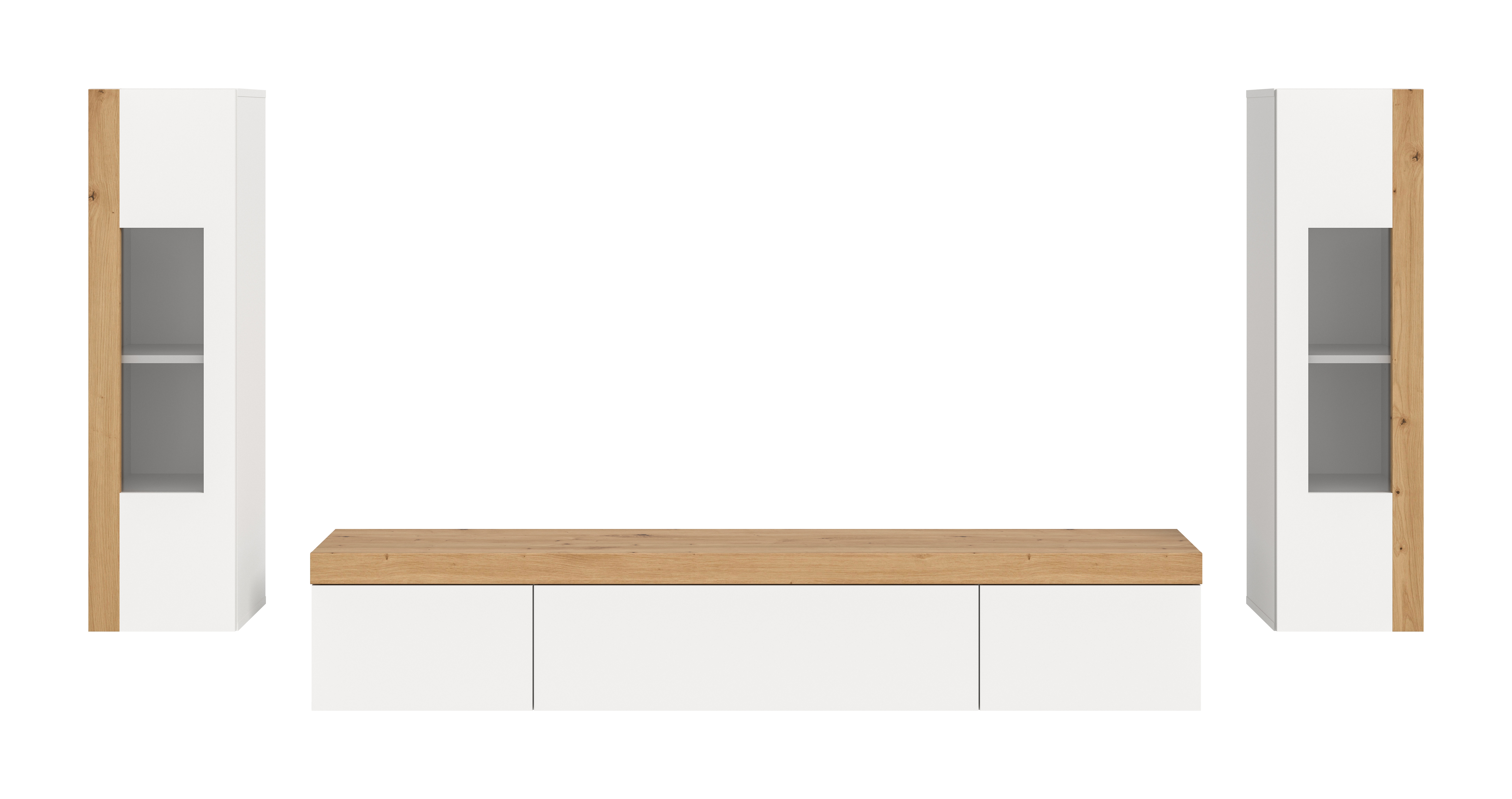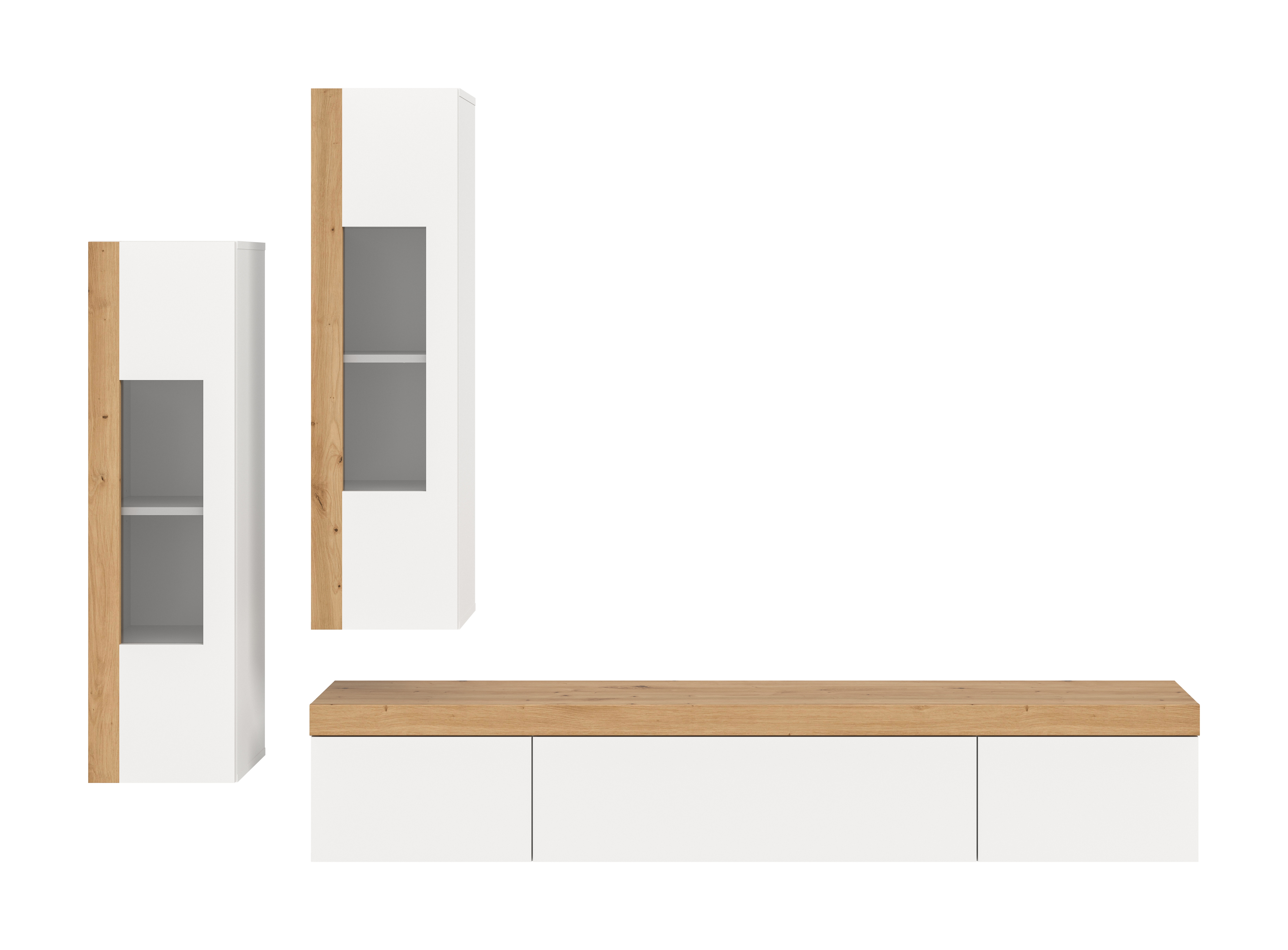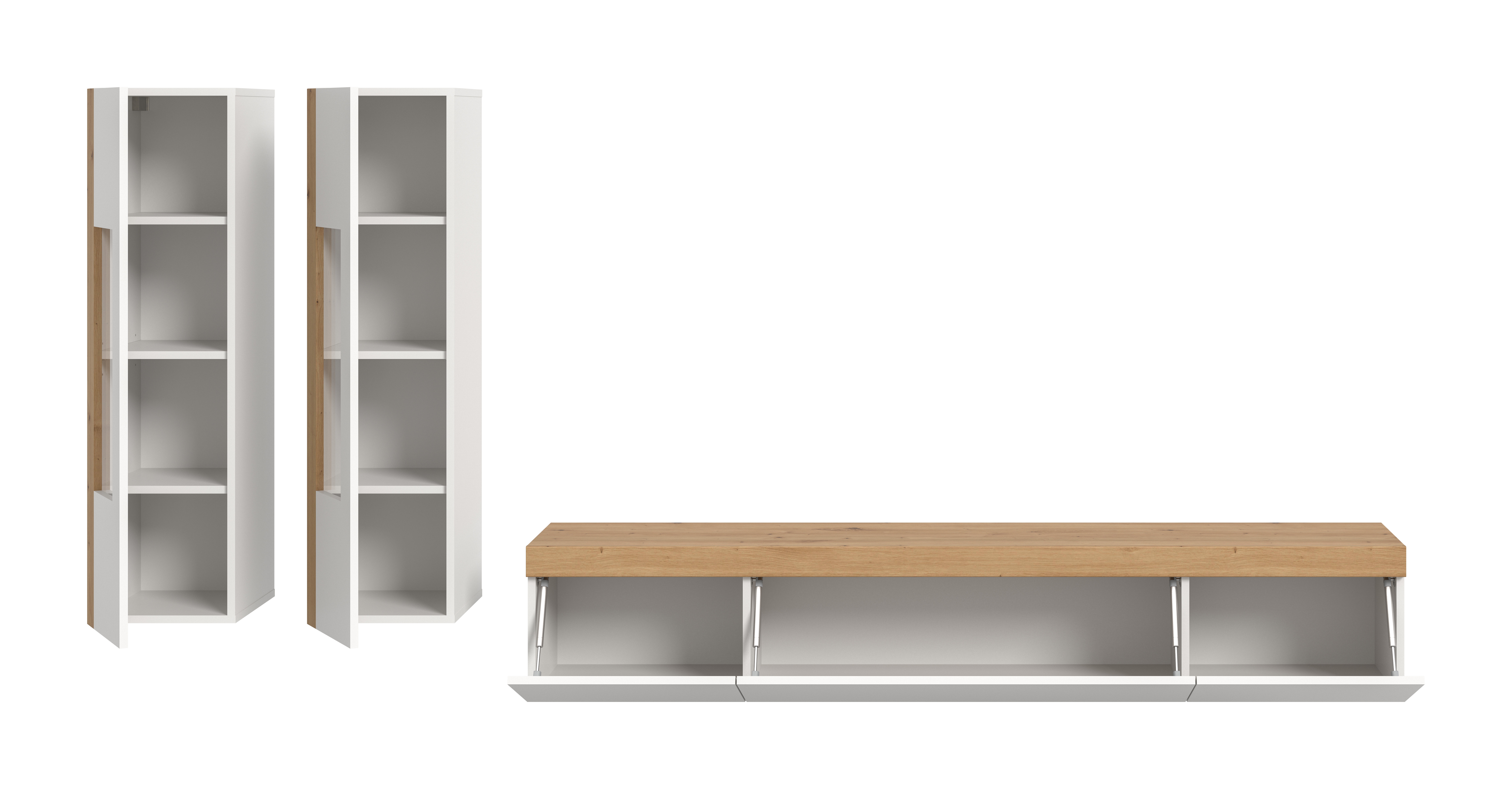 Cet ensemble comprend deux vitrines et un banc TV spacieux pouvant être installés en version suspendue ou posés au sol.
