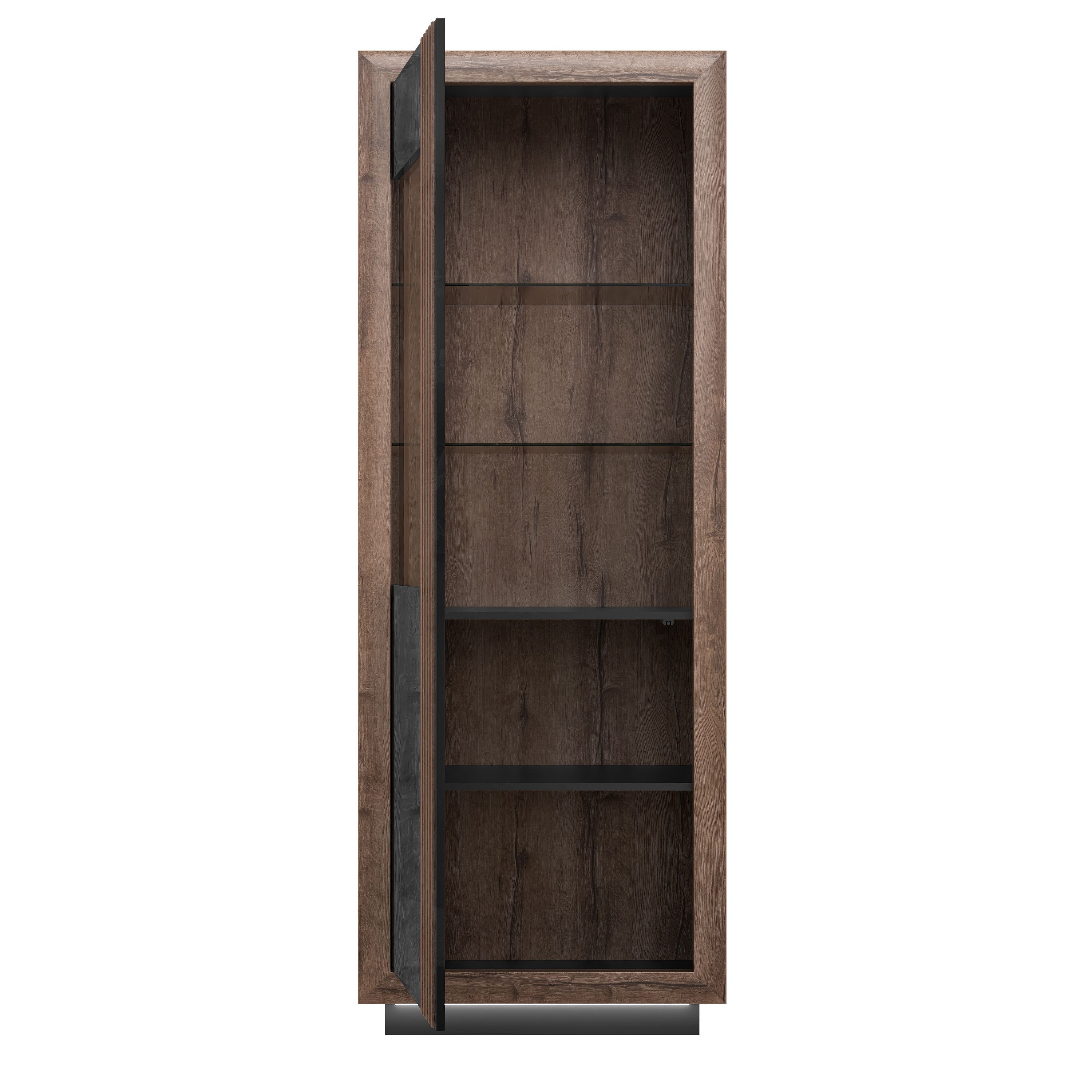 1 meuble vitrine avec 1 porte partiellement vitrée, 2 tablettes en verre et 2 tablettes en bois
