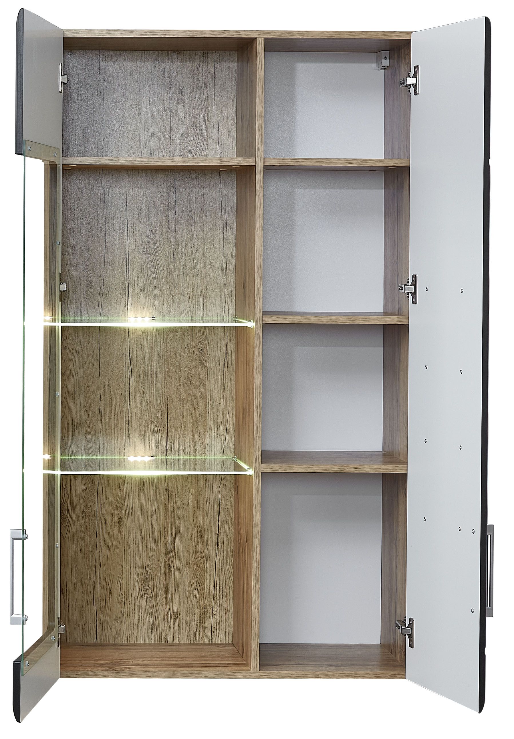 1 meuble vitrine avec 1 porte en verre/bois, 2 tablettes en verre, 1 porte en bois et 4 tablettes en bois, éclairage LED inclus