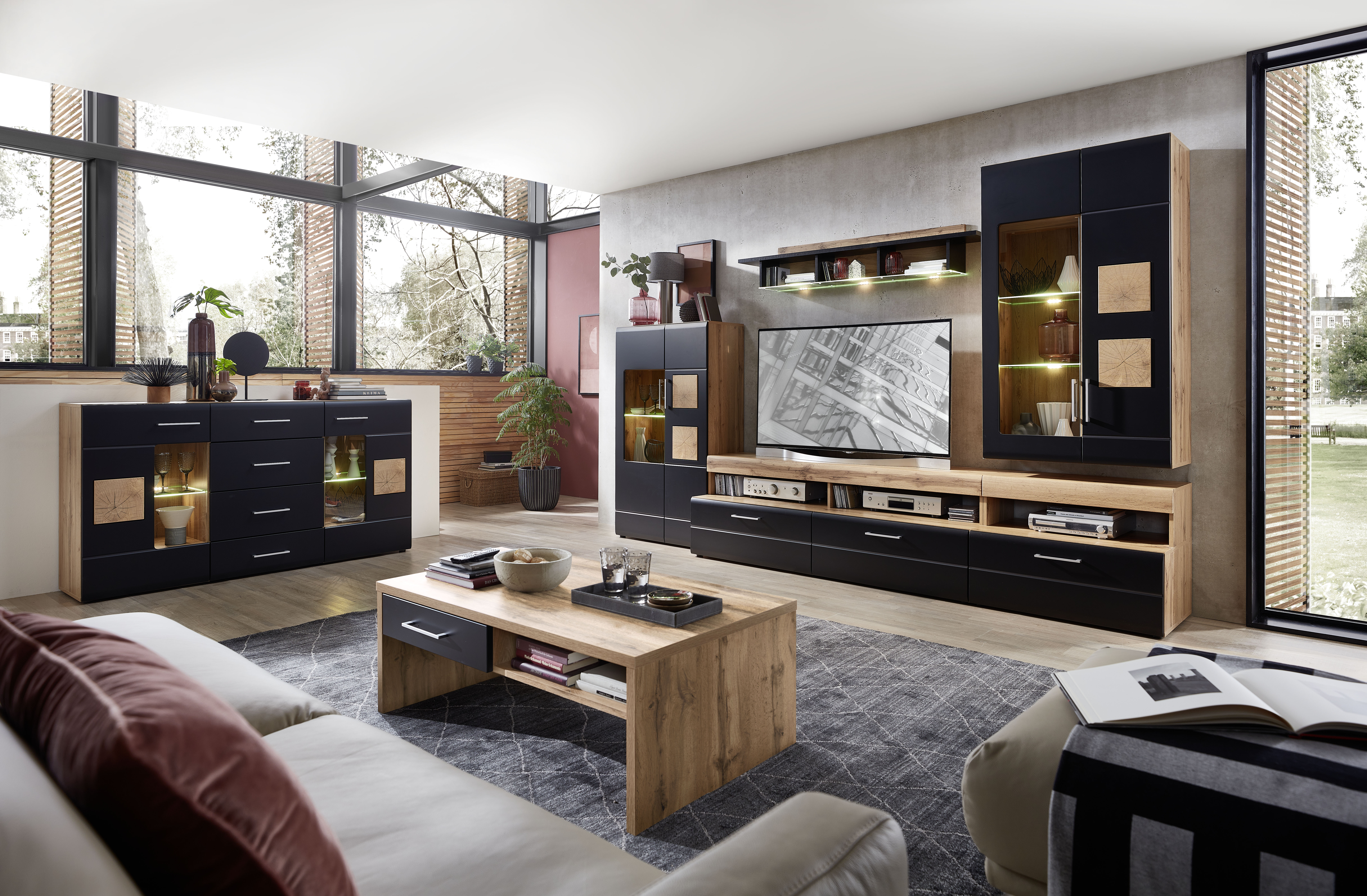 | Equipement murs TV: | Casiers ouverts, Tiroirs, incl. éclairage | ||