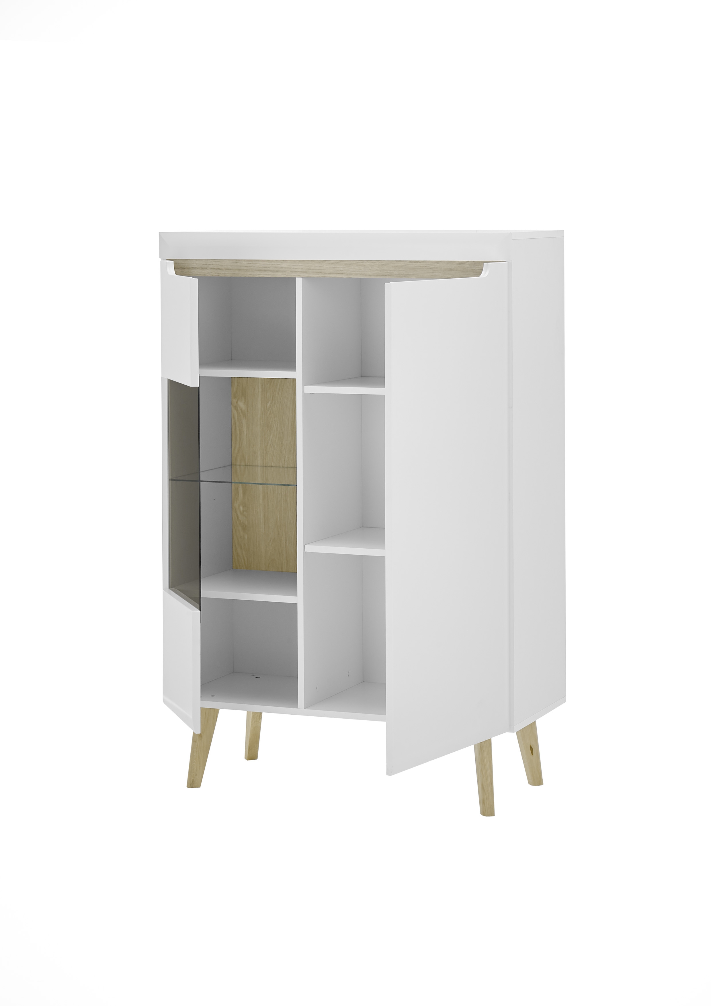 1 bahut haut vitrine avec 1 porte partiellement vitrée, 1 porte, 1 tablette en verre et 4 tablettes