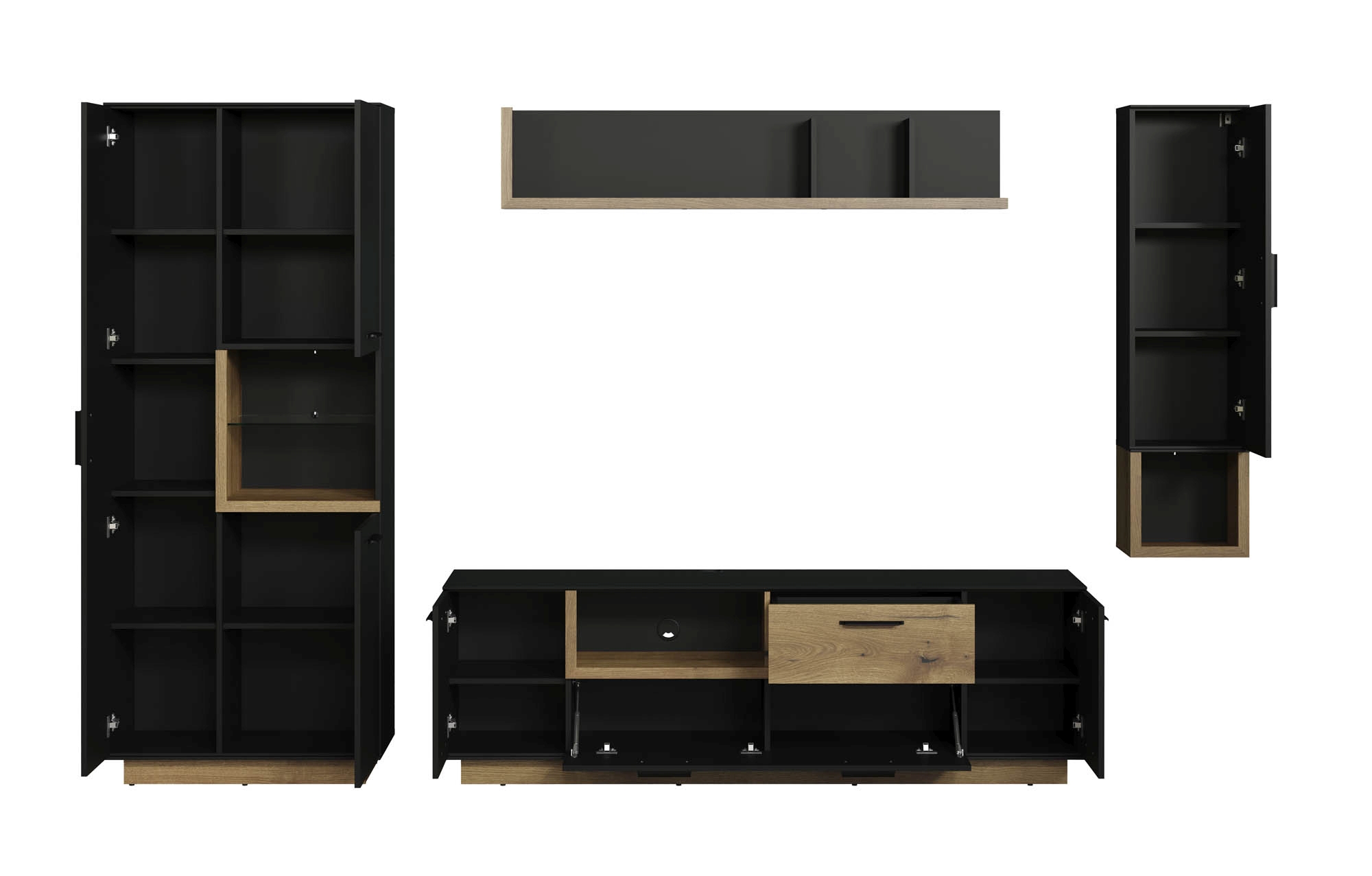 1 banc TV avec 2 portes, 2 tablettes, 1 abattant (avec, derrière lui, 2 casiers), 1 casier ouvert, 1 tiroir et 1 passe-câble