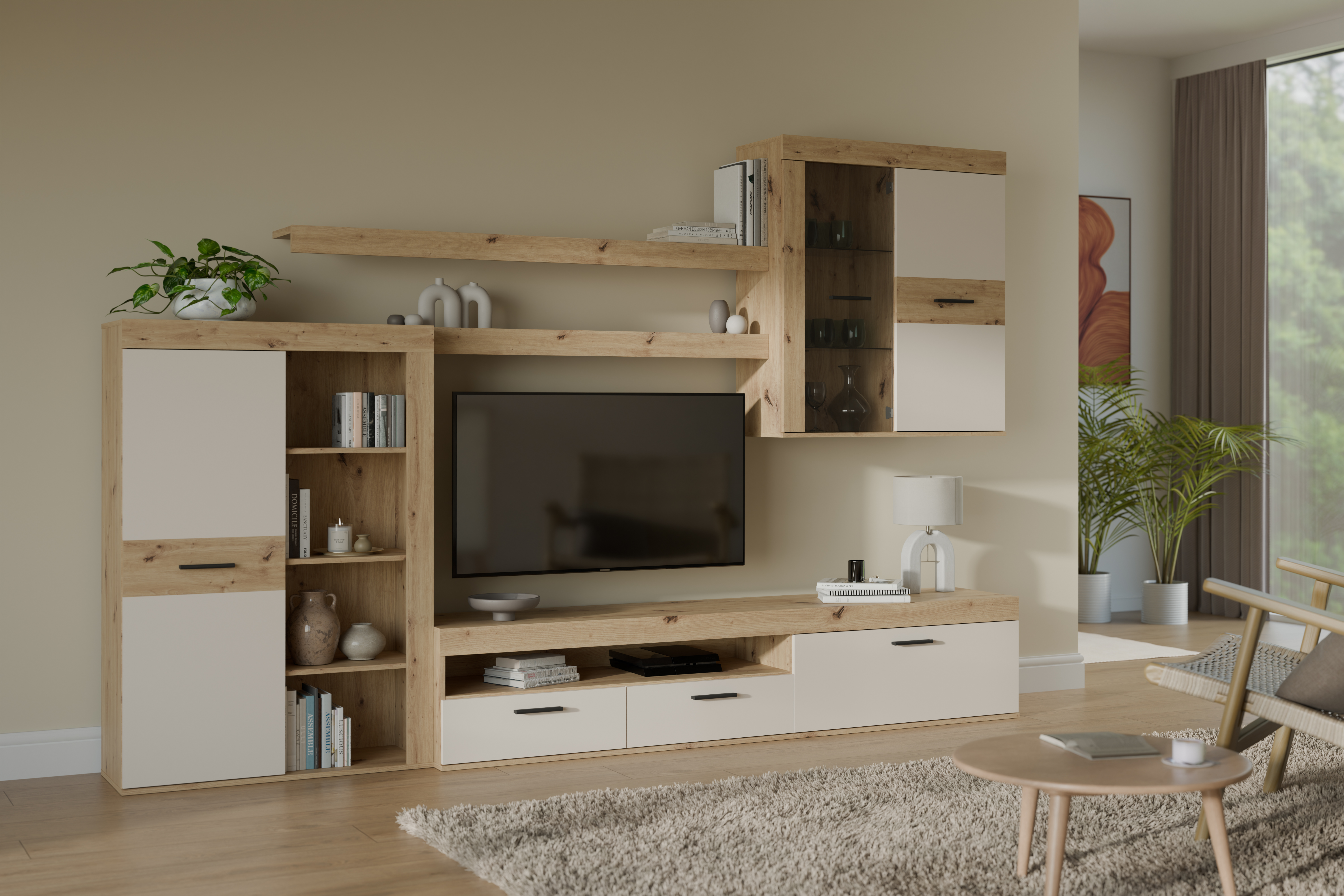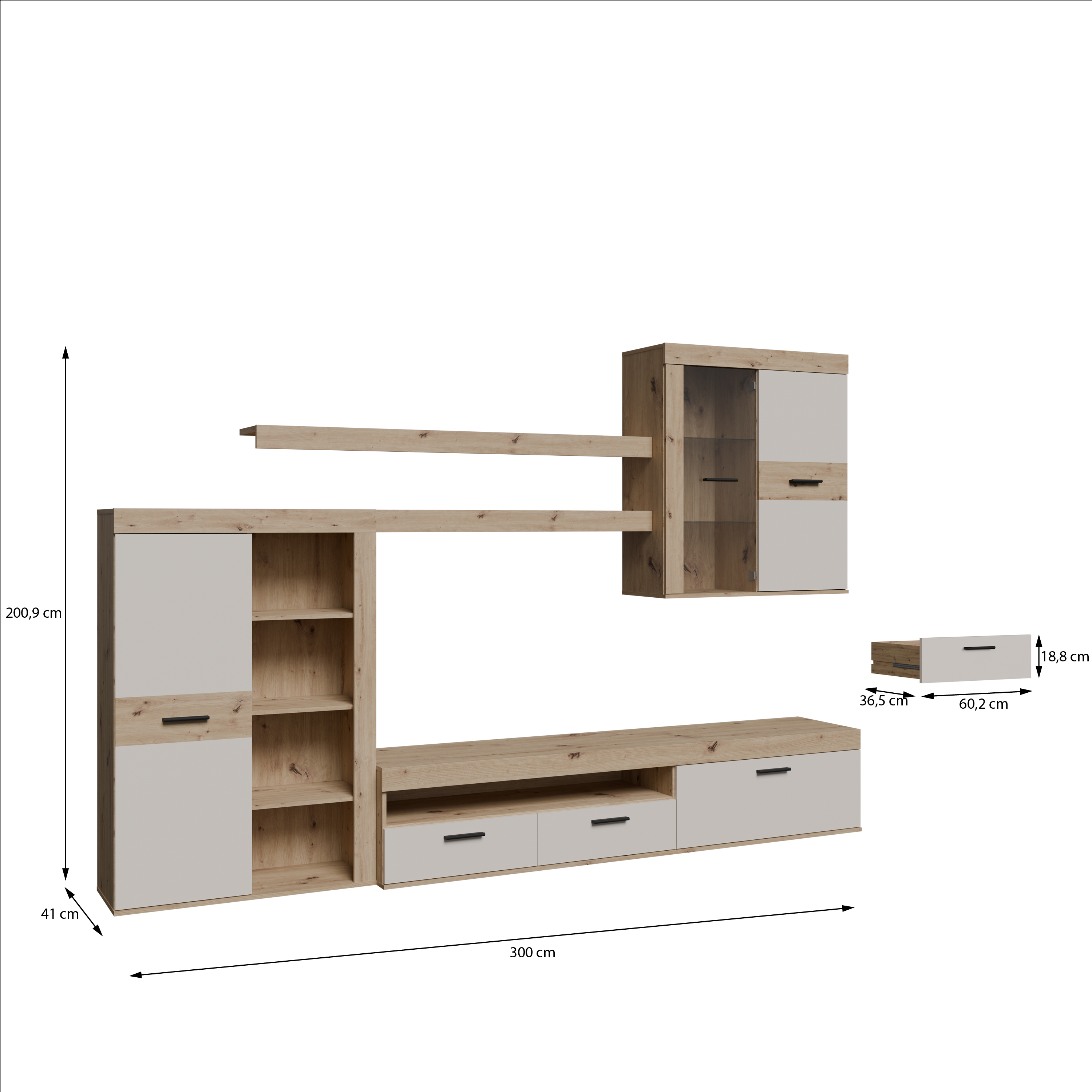 | Equipement murs TV: | Casiers ouverts, Tiroirs, incl. éclairage | ||