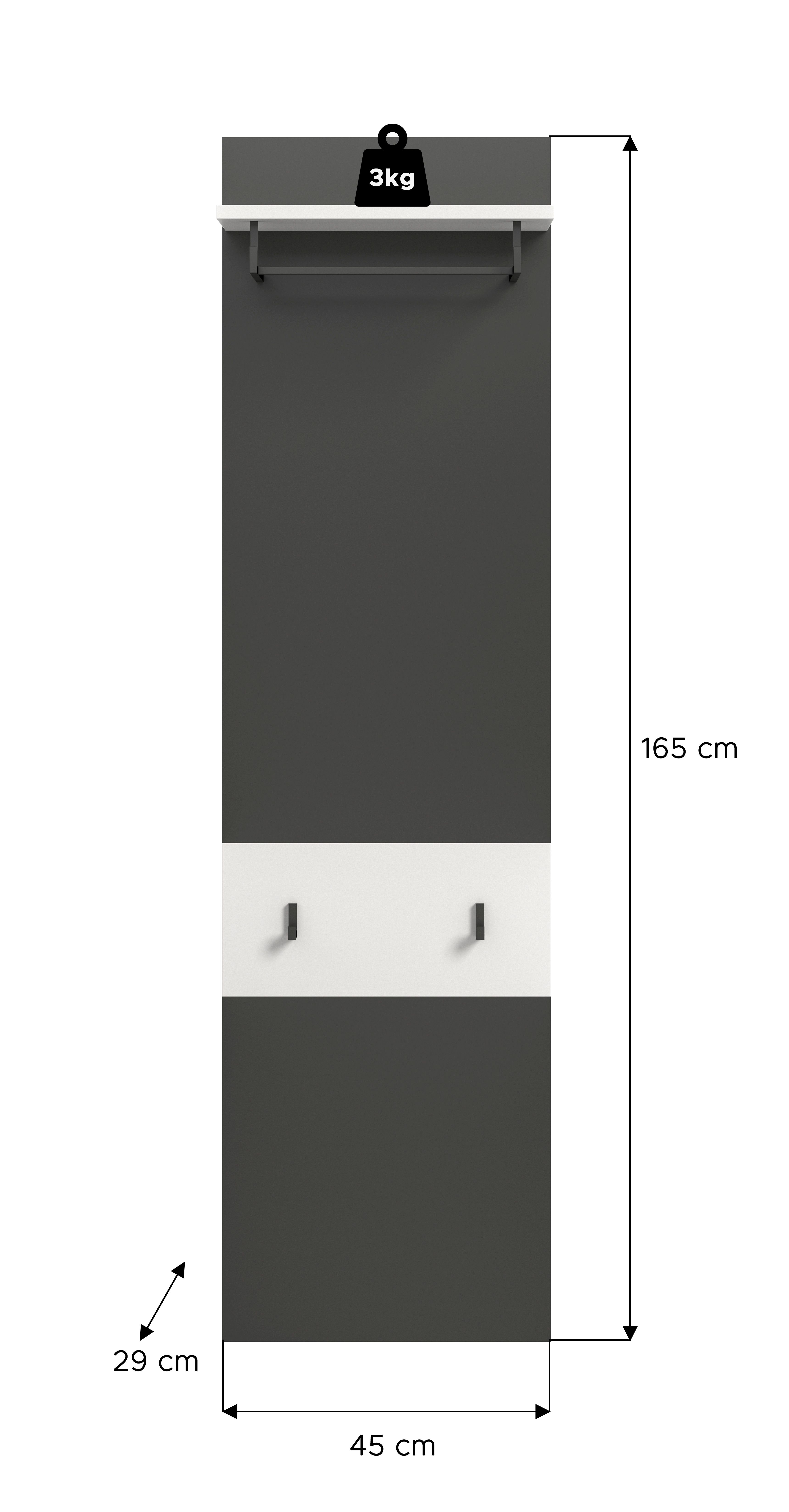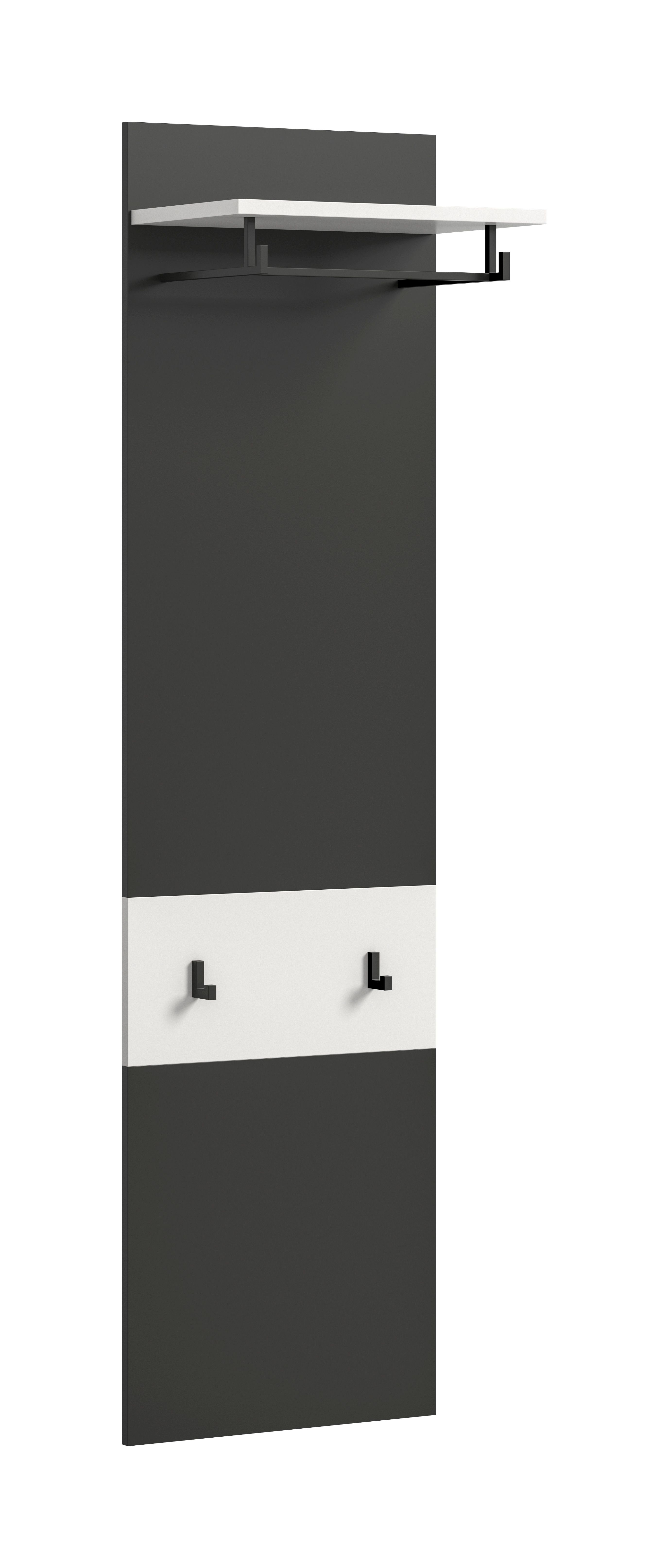 Ce panneau mural portemanteau en décor ton gris basalte et ton blanc (dimensions : L/H/P : 45 x 165 x 29 cm) est une solution à la fois élégante et pratique pour votre entrée. Avec une hauteur de 165 cm, il offre suffisamment de place pour suspendre vos vestes, sacs et accessoires. Les crochets stylés et la tablette porte-chapeaux permettent de garder l’espace bien rangé et d’accrocher facilement les vêtements. Son design moderne et sa teinte claire s’intègrent harmonieusement dans tous les styles d’intérieur, tandis que son format compact convient parfaitement aux couloirs étroits. Conférez une touche accueillante à votre intérieur et faites régner l’ordre grâce à ce panneau portemanteau ultra pratique !