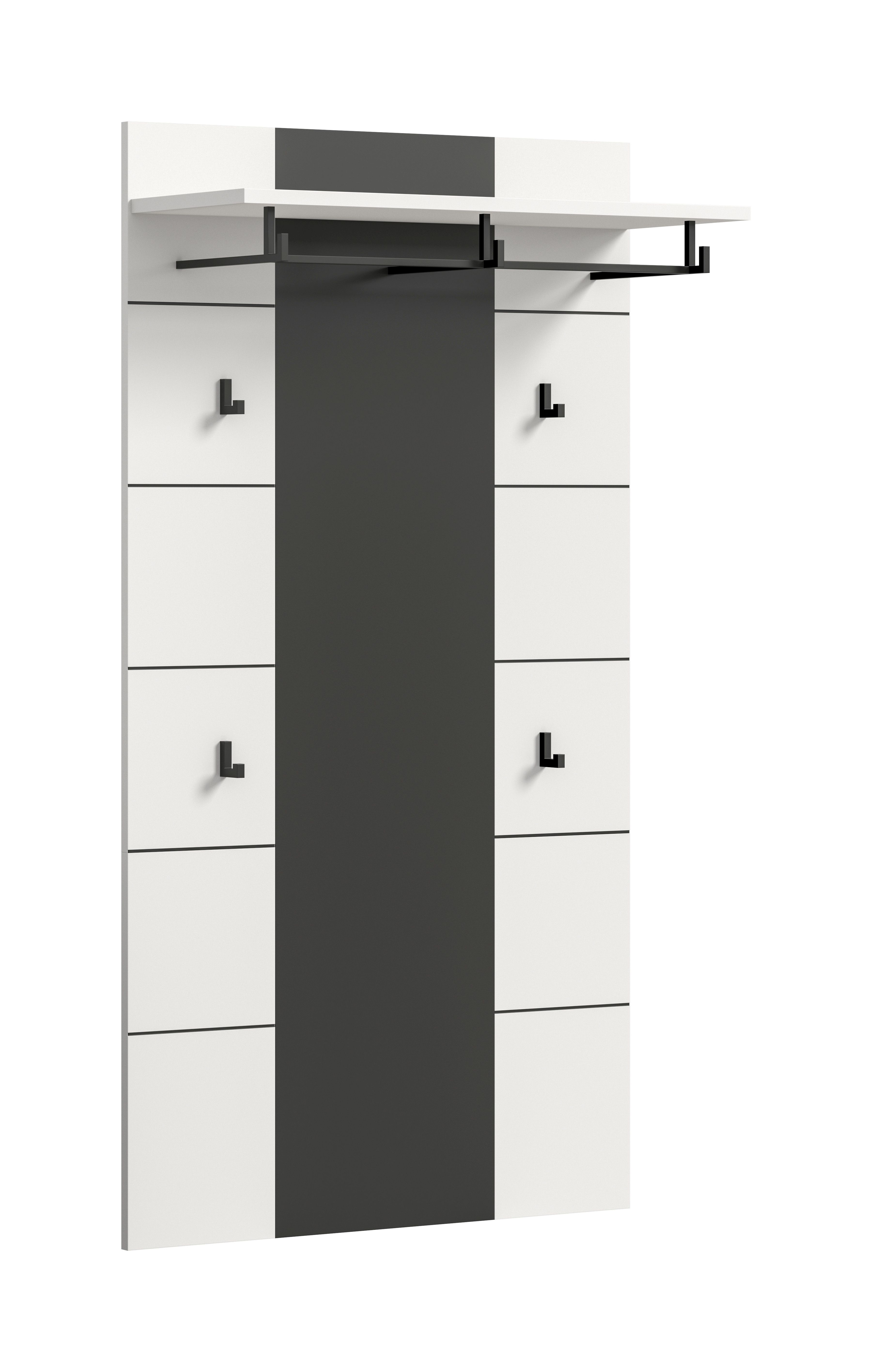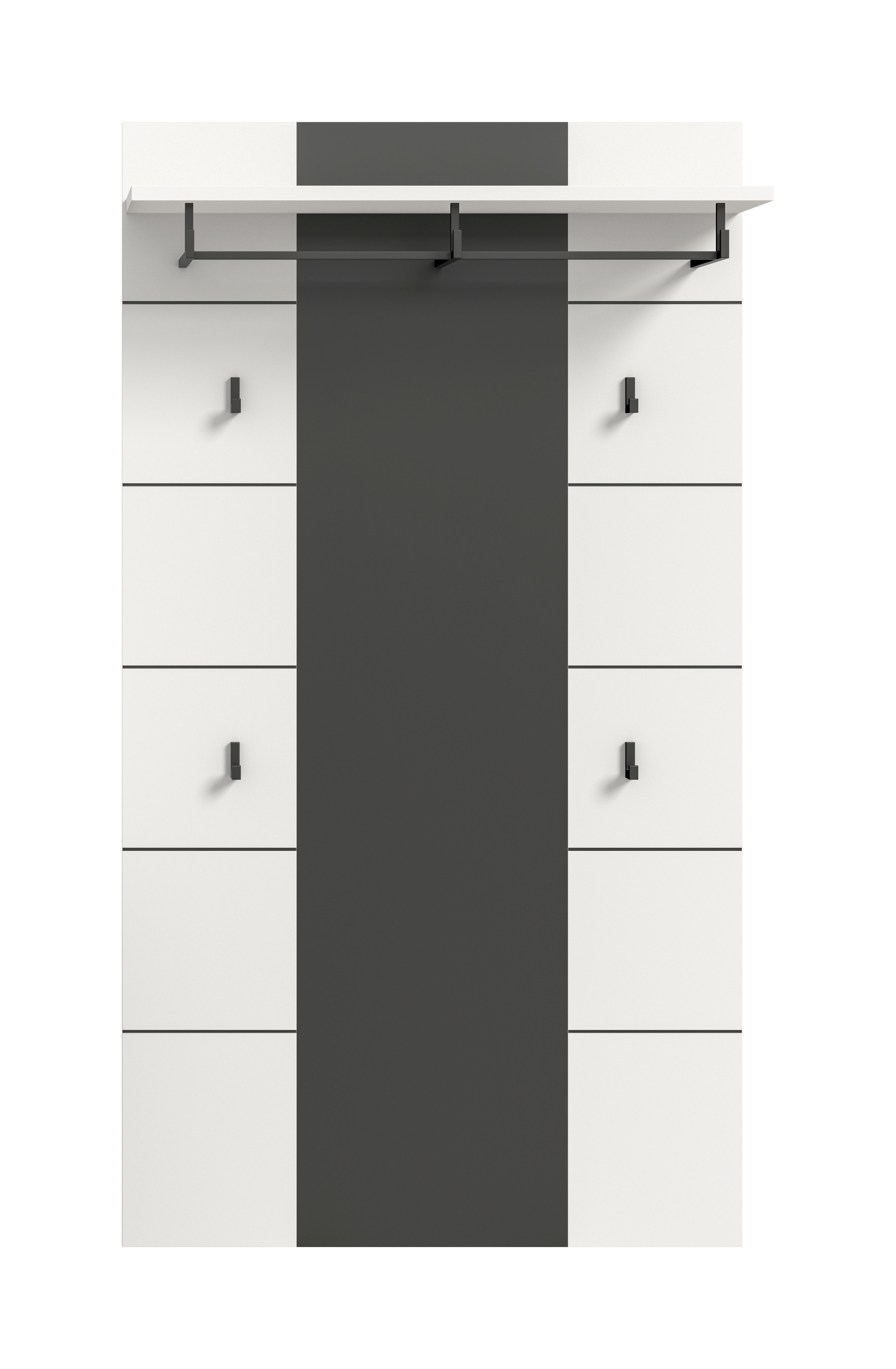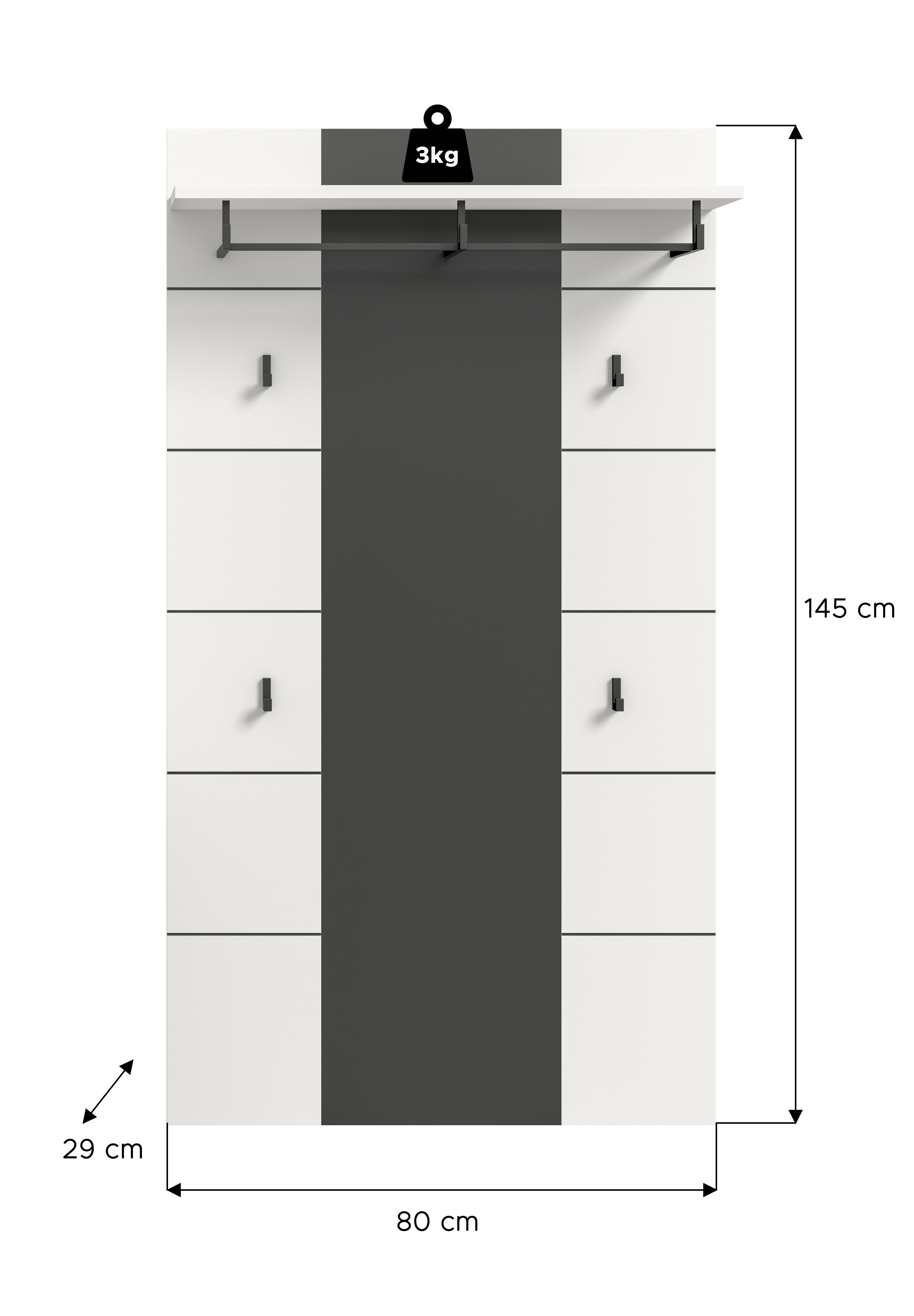 Ce panneau portemanteau polyvalent en décor ton gris basalte et ton blanc (dimensions : L/H/P : 80 x 141 x 29 cm) est le choix idéal pour votre entrée. Son design bien pensé offre de la place pour ranger les vestes, sacs et clés, tandis que les crochets stylés permettent une organisation soignée. La teinte claire et l’aspect moderne du panneau s’intègreront harmonieusement dans votre intérieur tout en conférant une ambiance accueillante à votre couloir. Grâce à son format compact, il convient également aux petits espaces. Avec ce panneau mural pratique, vous ferez régner l’ordre dans votre entrée tout en créant une atmosphère chaleureuse dans votre intérieur.