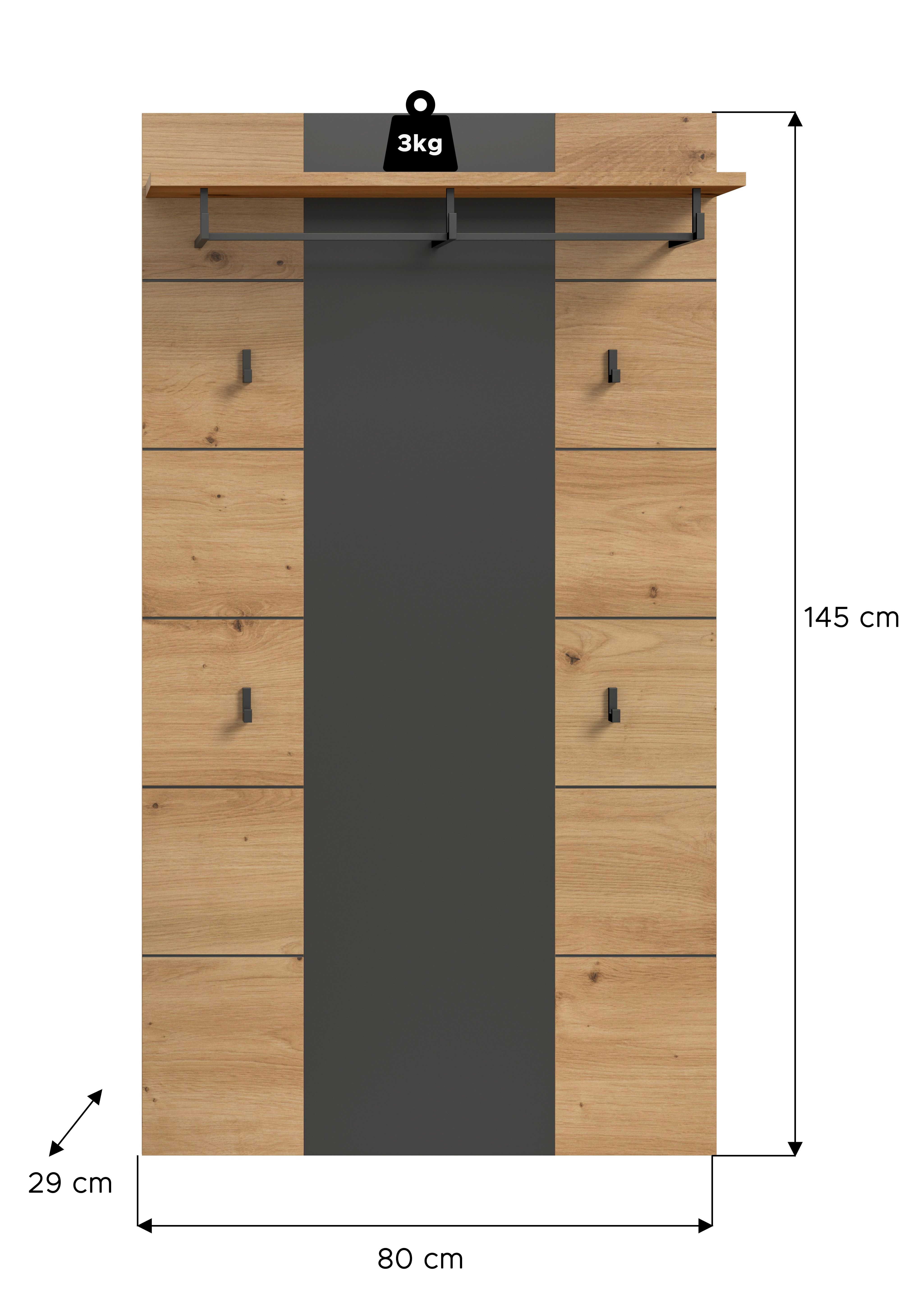 Ce panneau portemanteau polyvalent en décor chêne Artisan (dimensions : L/H/P : 80 x 141 x 29 cm) est le choix idéal pour votre entrée. Son design bien pensé offre de la place pour ranger les vestes, sacs et clés, tandis que les crochets stylés permettent une organisation soignée. La teinte claire et l’aspect moderne du panneau s’intègreront harmonieusement dans votre intérieur tout en conférant une ambiance accueillante à votre couloir. Grâce à son format compact, il convient également aux petits espaces. Avec ce panneau mural pratique, vous ferez régner l’ordre dans votre entrée tout en créant une atmosphère chaleureuse dans votre intérieur.