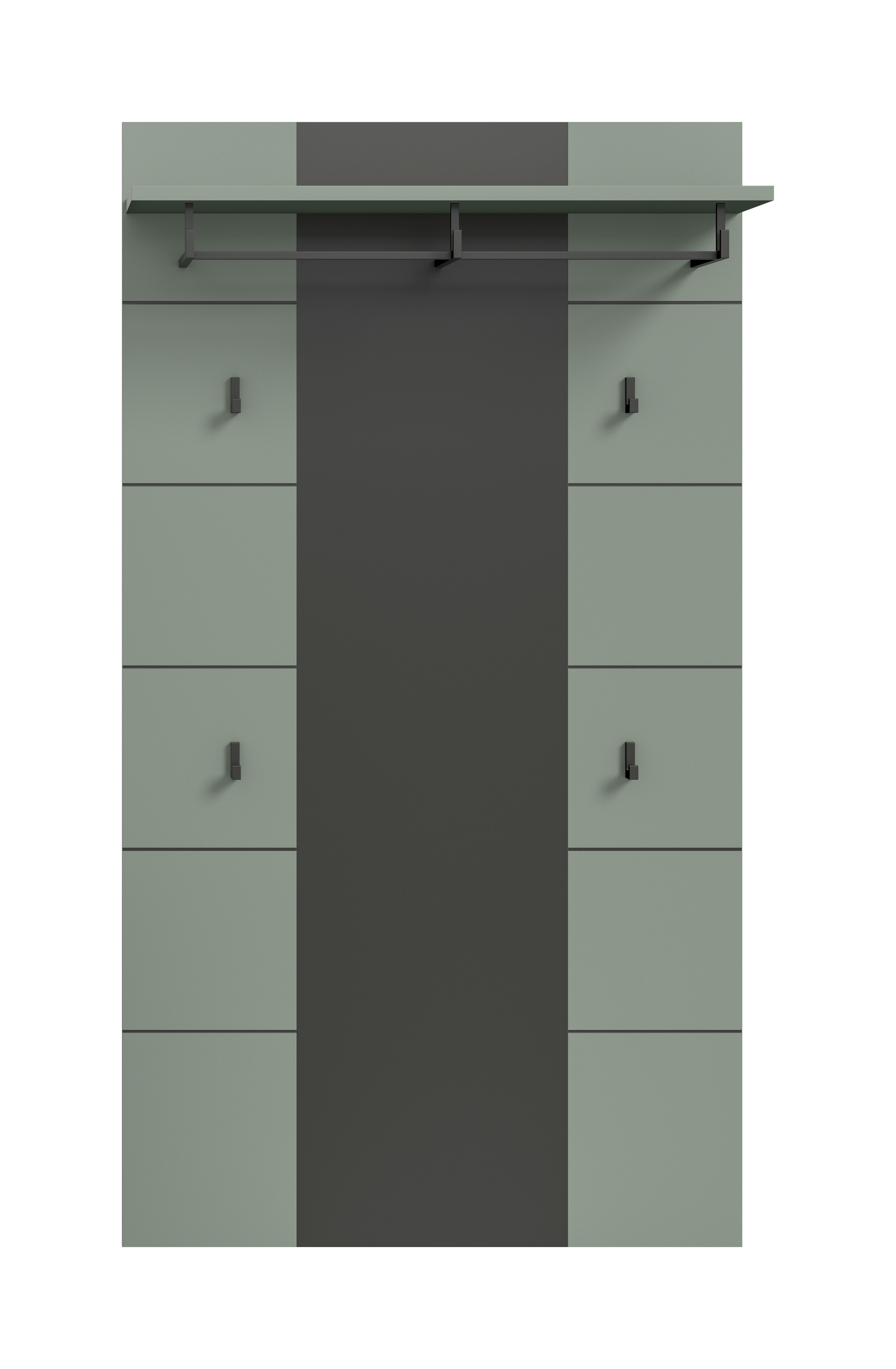 Ce panneau portemanteau polyvalent en décor ton gris basalte et ton smoke green (dimensions : L/H/P : 80 x 141 x 29 cm) est le choix idéal pour votre entrée. Son design bien pensé offre de la place pour ranger les vestes, sacs et clés, tandis que les crochets stylés permettent une organisation soignée. La teinte claire et l’aspect moderne du panneau s’intègreront harmonieusement dans votre intérieur tout en conférant une ambiance accueillante à votre couloir. Grâce à son format compact, il convient également aux petits espaces. Avec ce panneau mural pratique, vous ferez régner l’ordre dans votre entrée tout en créant une atmosphère chaleureuse dans votre intérieur.