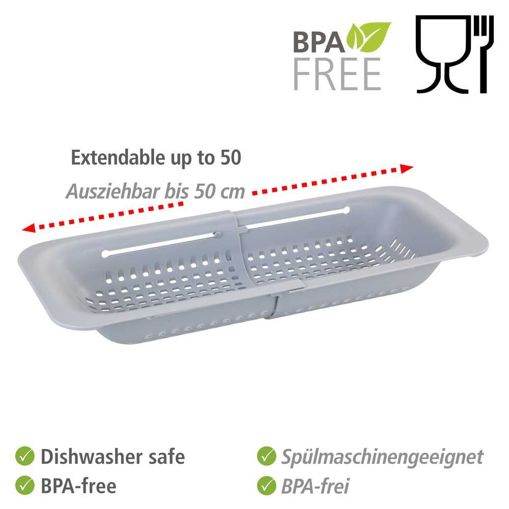 Passoire d'évier pratique : la passoire Sivo s'adapte facilement à l'évier. Avec ses dimensions (L x H x P) : 36,5-50 x 7 x 20 cm, elle peut être adaptée à la largeur de l'évier et placée directement sous le robinet ou le mitigeur.