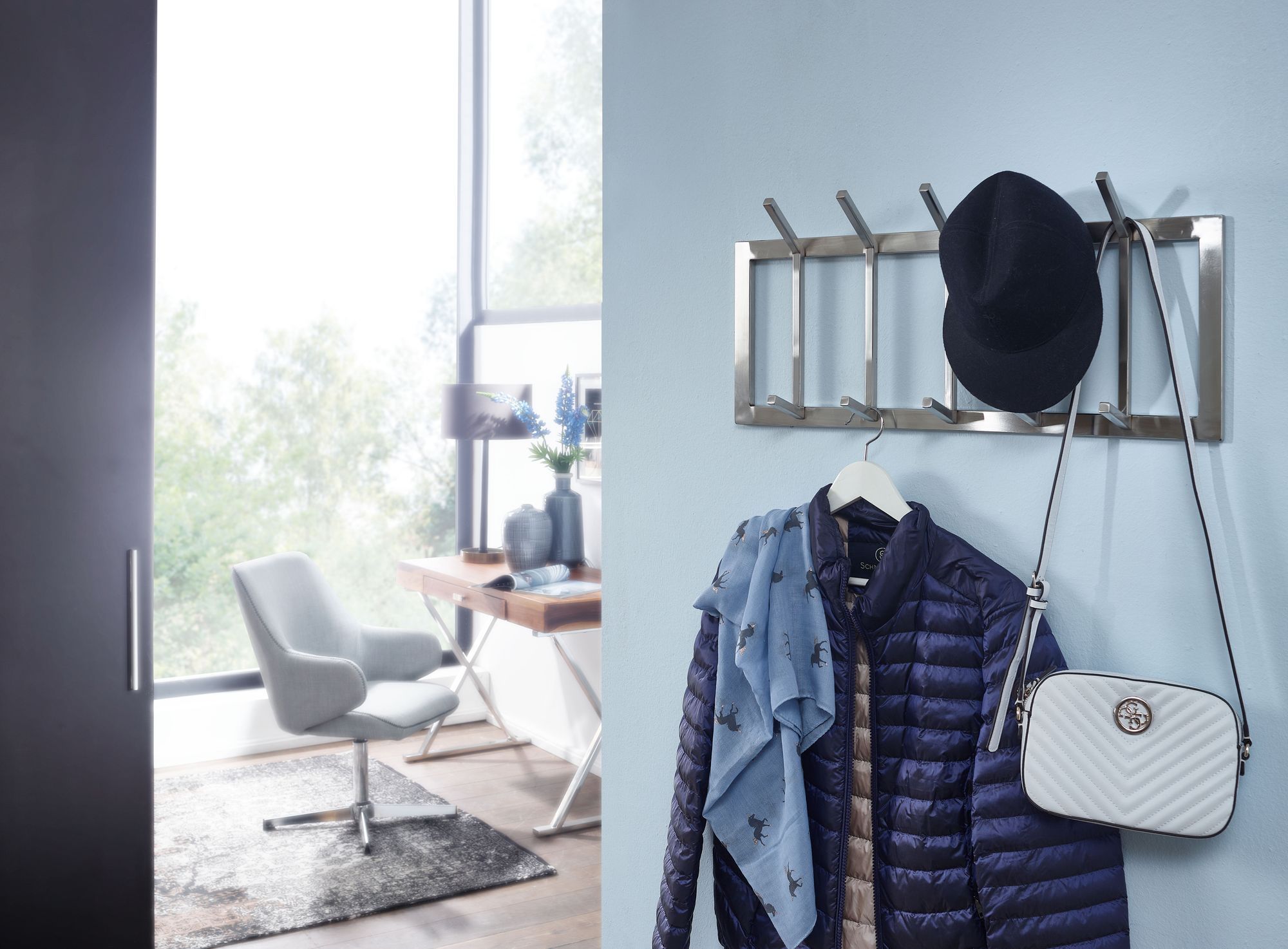 UNE ENTRÉE BIEN RANGÉE ✔ Pour une entrée bien rangée, optez pour ce panneau mural portemanteau dans un aspect massif. Cinq crochets au niveau supérieur et au niveau inférieur permettent de garder les vestes et manteaux des grands et des petits toujours à portée de main. Grâce à son design tout en sobriété, la patère murale s'harmonise avec tout type de décoration d'intérieur et s'intègre ainsi parfaitement dans l'entrée.