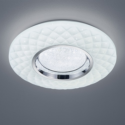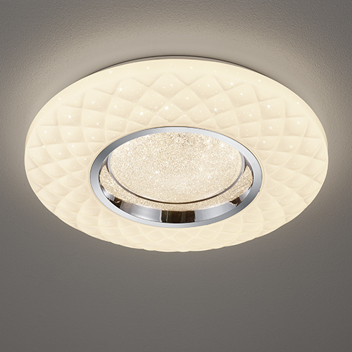 Le plafonnier MAGNOLIA garantit un design lumineux dans sa forme la plus parfaite. La lampe LED ronde sait se transformer pour s'adapter à tous vos souhaits en matière d'éclairage. Grâce à son design moderne, le luminaire attirera rapidement tous les regards dans votre intérieur. Le plafonnier blanc a un diamètre de 39 cm. La forme ronde apporte la touche finale au style harmonieux du plafonnier. La lampe dispose d'un variateur SWITCH intégré. Ce variateur permet de régler l'intensité lumineuse sur 3 niveaux à l'aide de la télécommande fournie pour augmenter la sensation de bien-être dans vos pièces. Ainsi, le plafonnier peut être utilisé de multiples façons. L'abat-jour annulaire de la lampe imite un ciel étoilé qui conférera à la pièce un charme irrépressible. De même, la lampe dispose d'une fonction veilleuse. Les jolies couleurs (blanc/chrome) soulignent le design élégant qui s'intègre facilement dans les intérieurs classiques, de préférence, mais qui crée également un contraste stylé bienvenu dans les intérieurs modernes. La lampe dispose, en outre, de la technologie LED qui se caractérise par une luminosité de qualité et une excellente efficacité énergétique. Ceci permet d'économiser 80 % des coûts énergétiques par rapport aux ampoules halogènes habituelles. De plus, les sources lumineuses LED ont une durée de vie accrue, produisent moins de chaleur et participent à la protection de l'environnement.